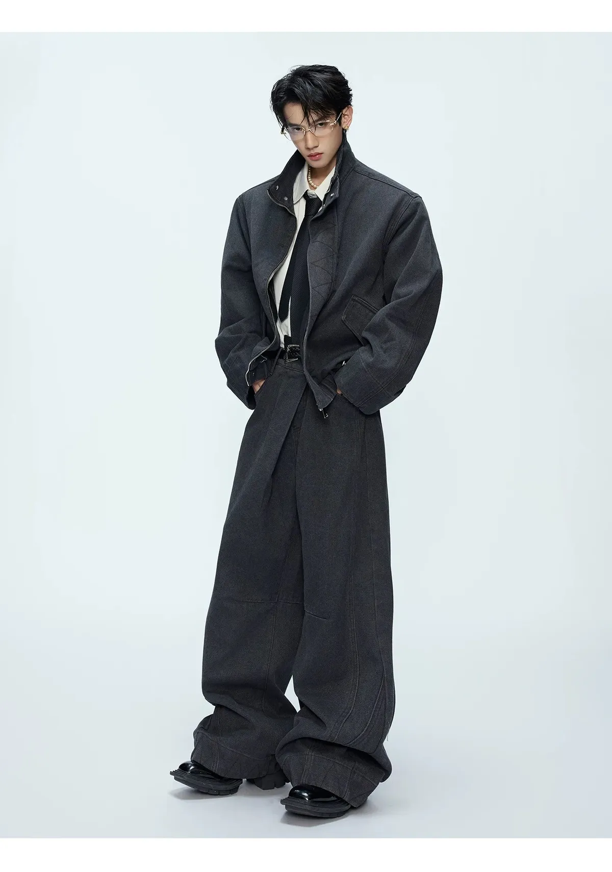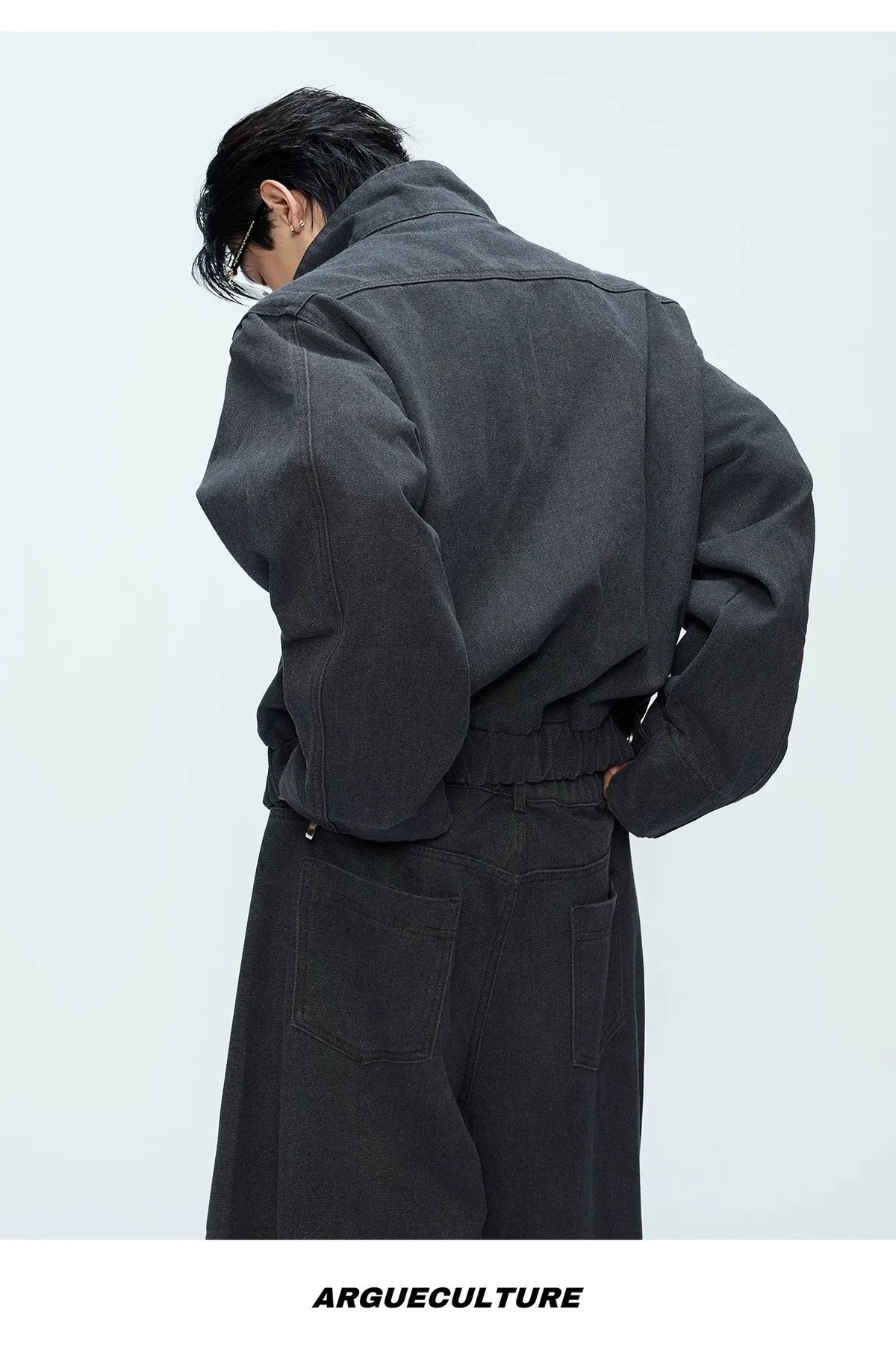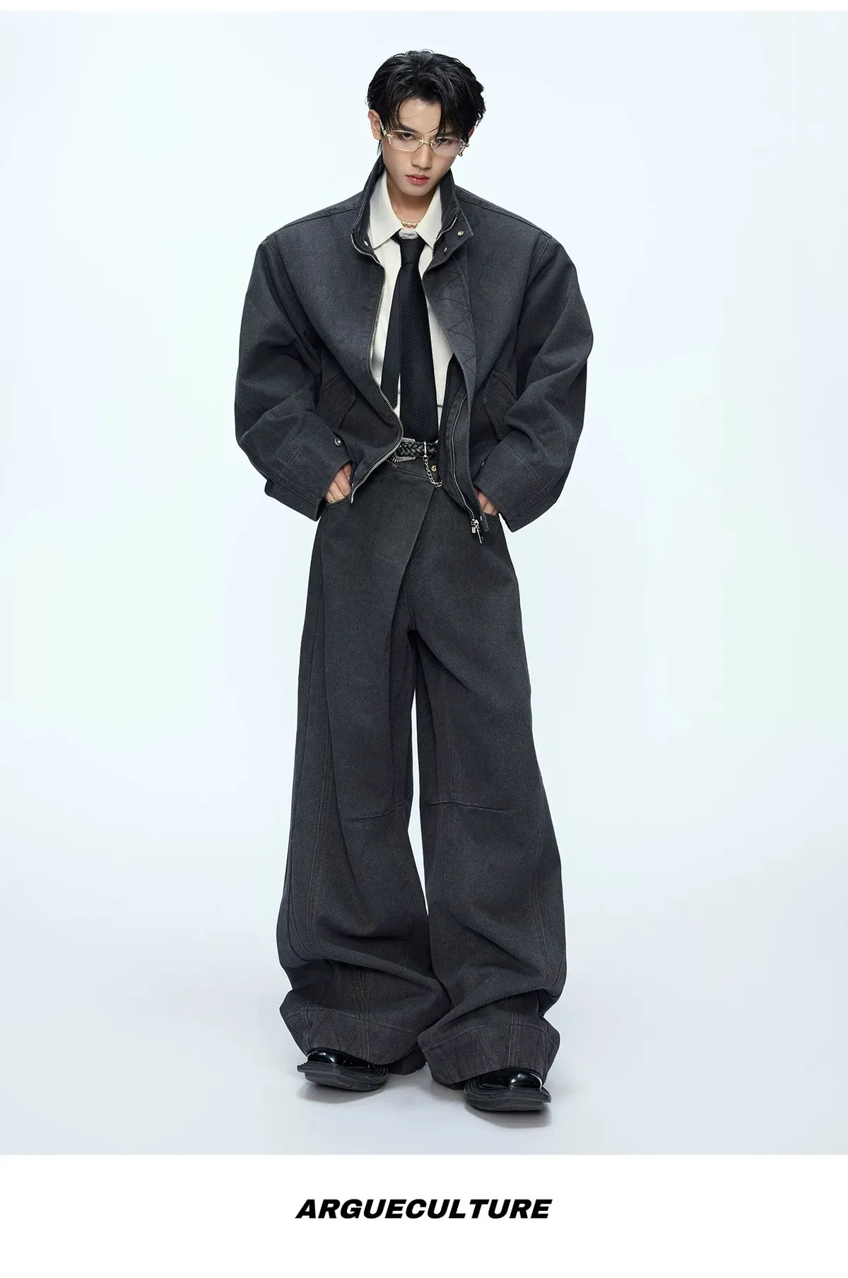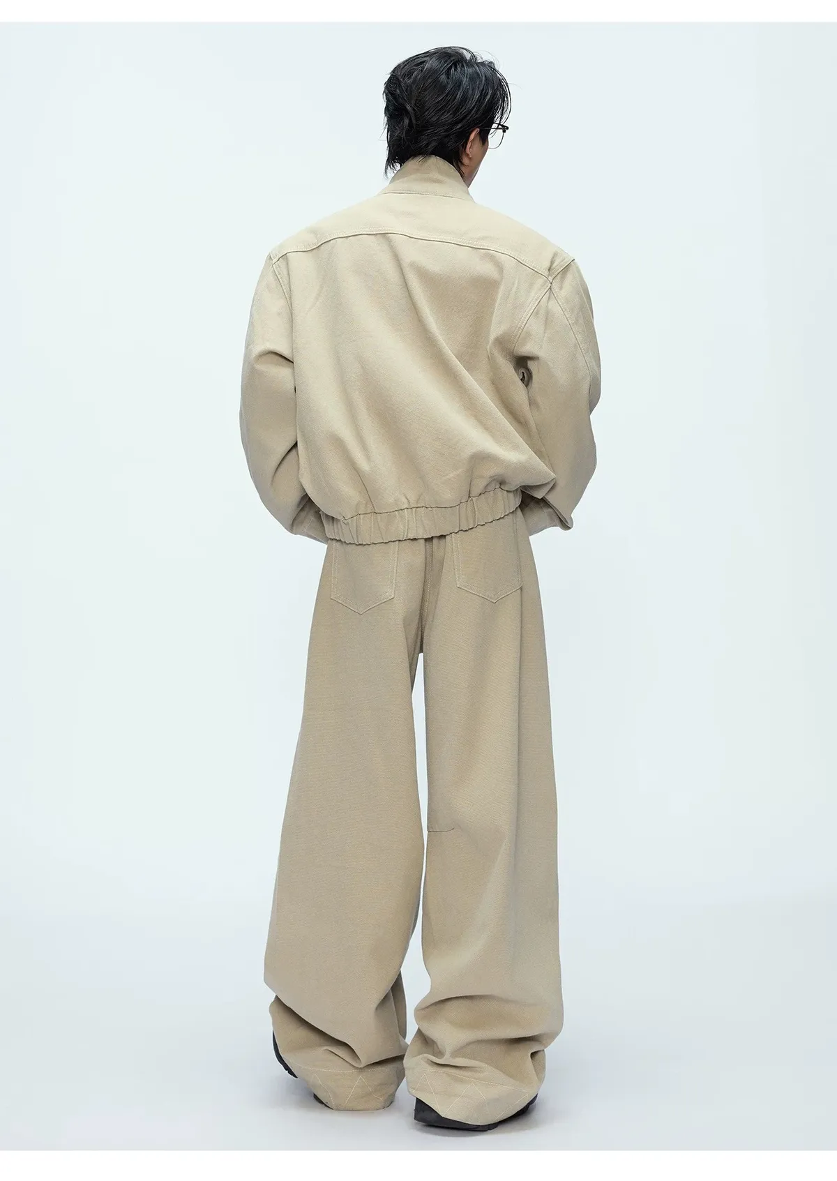 ARGUE 復古水洗 哈靈頓 水洗寬短 外套 解構 長褲 套裝(卡其/黑)