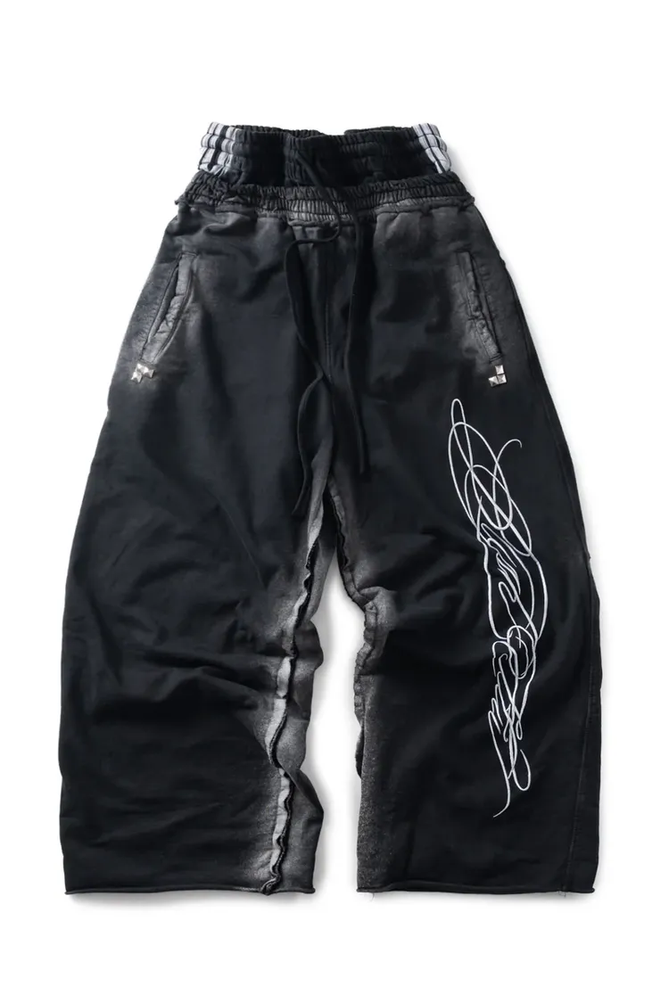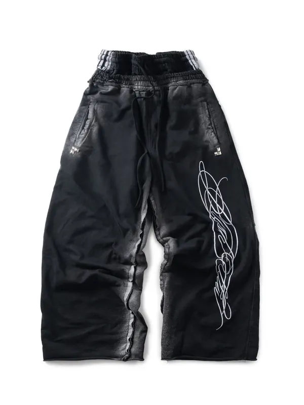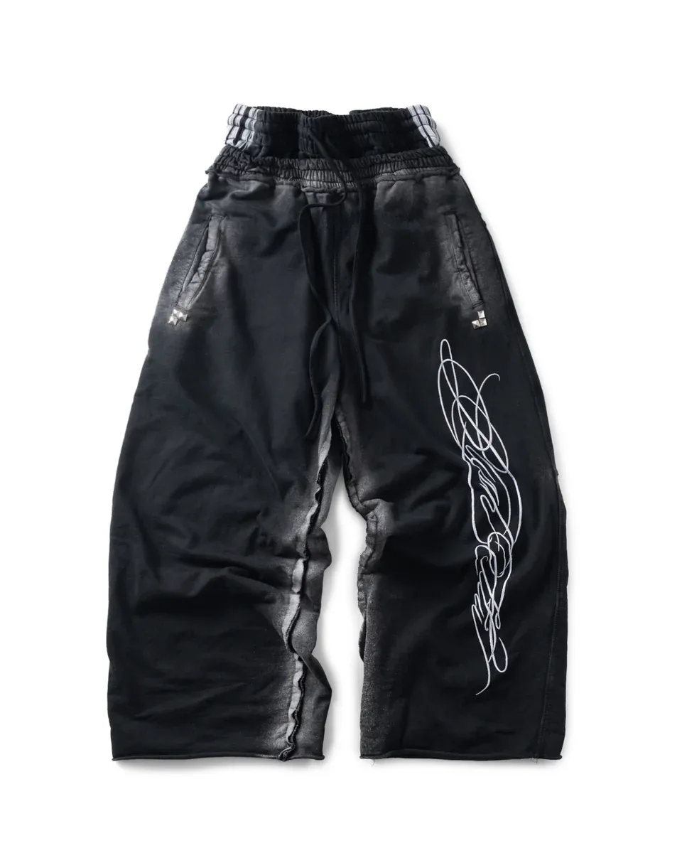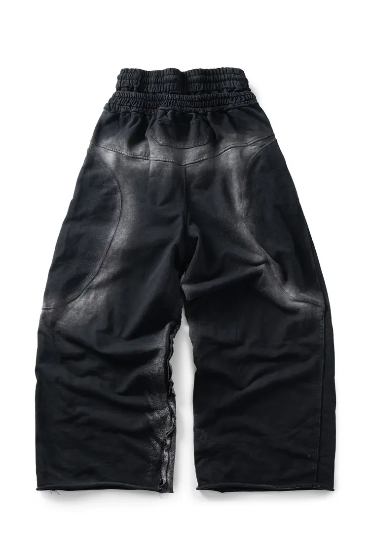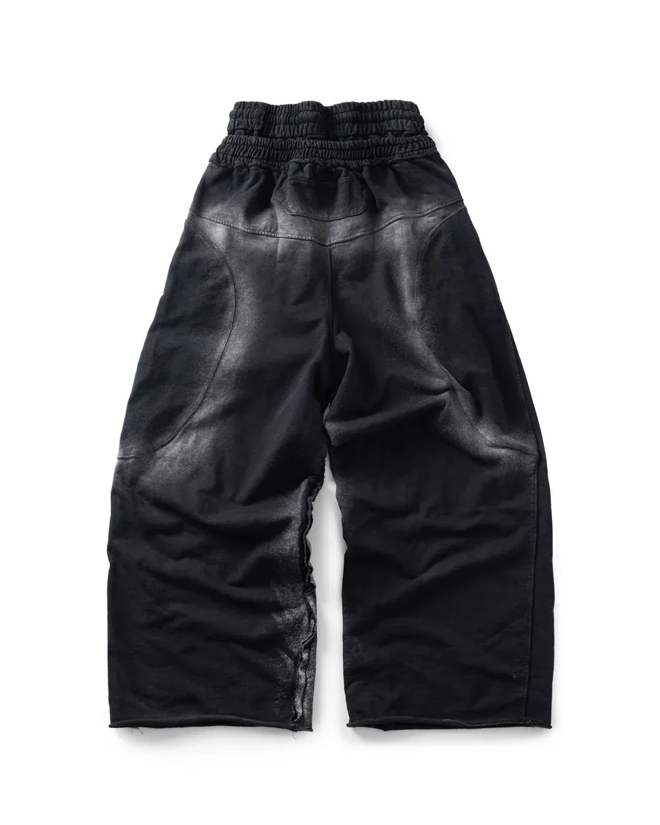 *Product Description : sweatpants in black. Baggy flared fit. 2 sizes. Heavy garment wash. Raw edge details. embroidered detail. Distressed finish. Unisex
