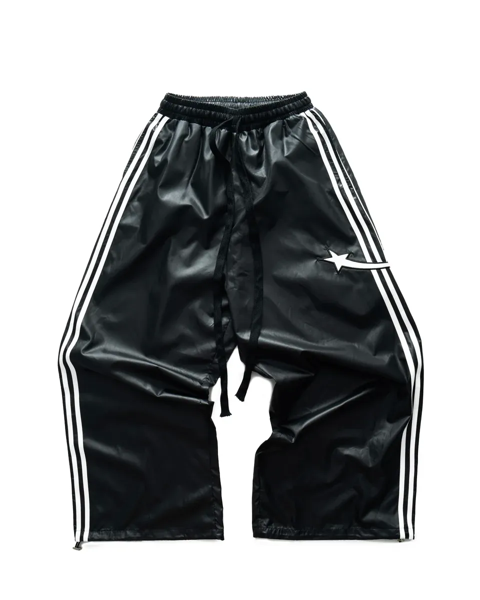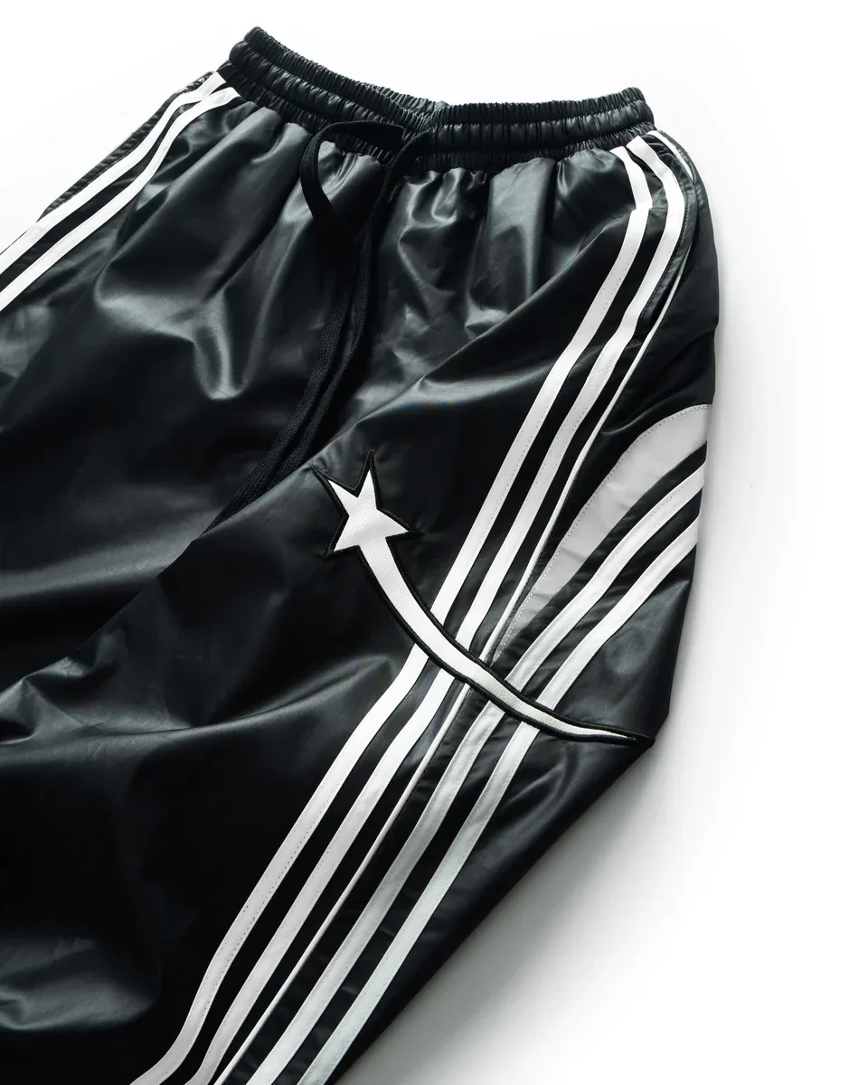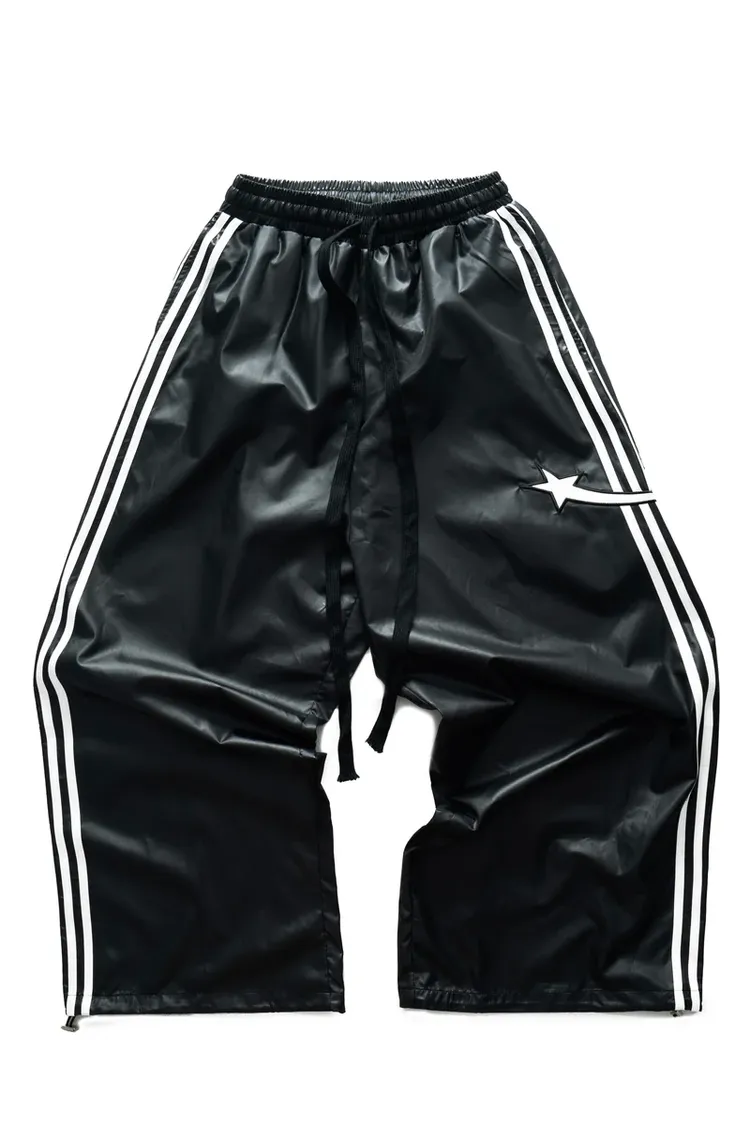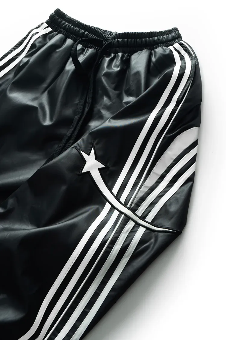 •Product Description : |||| pants in black. Regular fit. 2 sizes. The pants has drawstring are lined with white curves from front to back. Star detail is digitally embroidered. Made in Vietnam. Unisex.