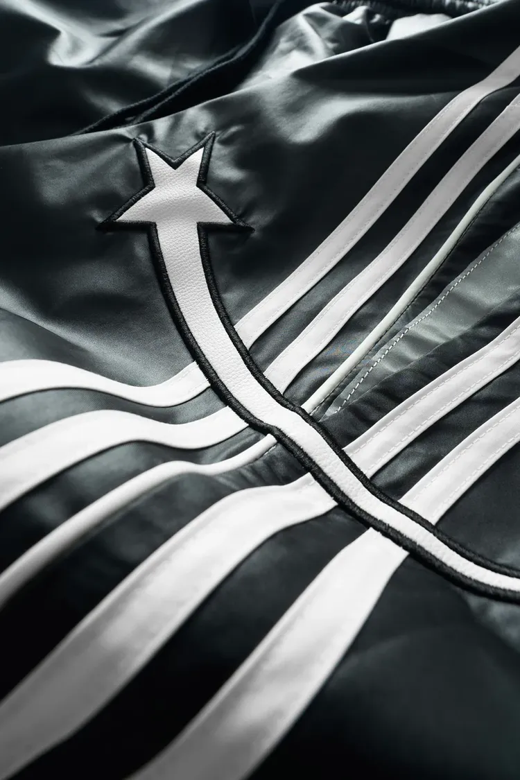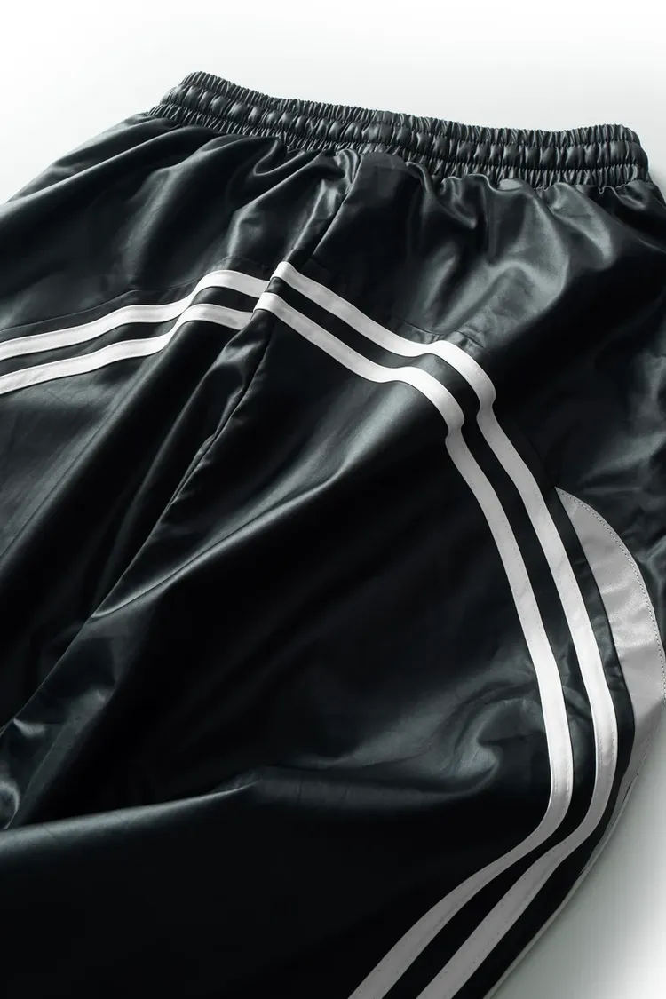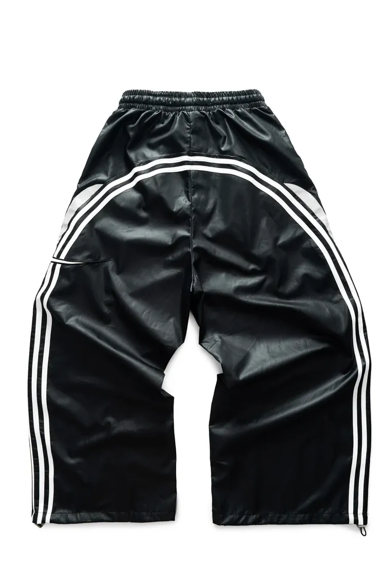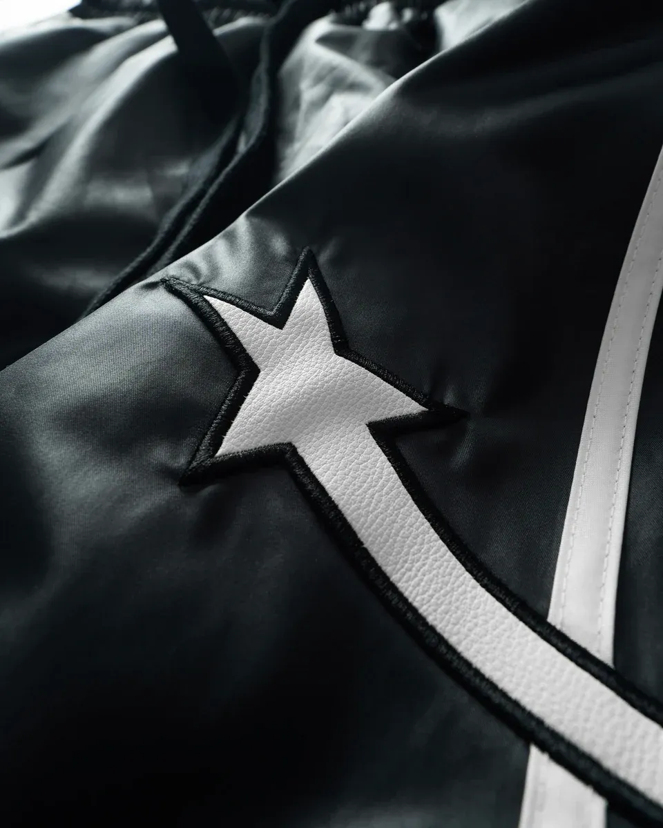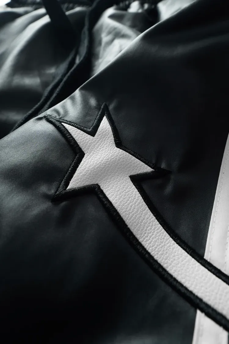 •Product Description : |||| pants in black. Regular fit. 2 sizes. The pants has drawstring are lined with white curves from front to back. Star detail is digitally embroidered. Made in Vietnam. Unisex.