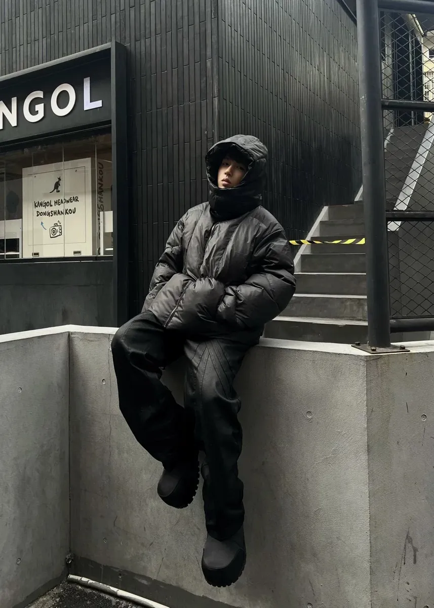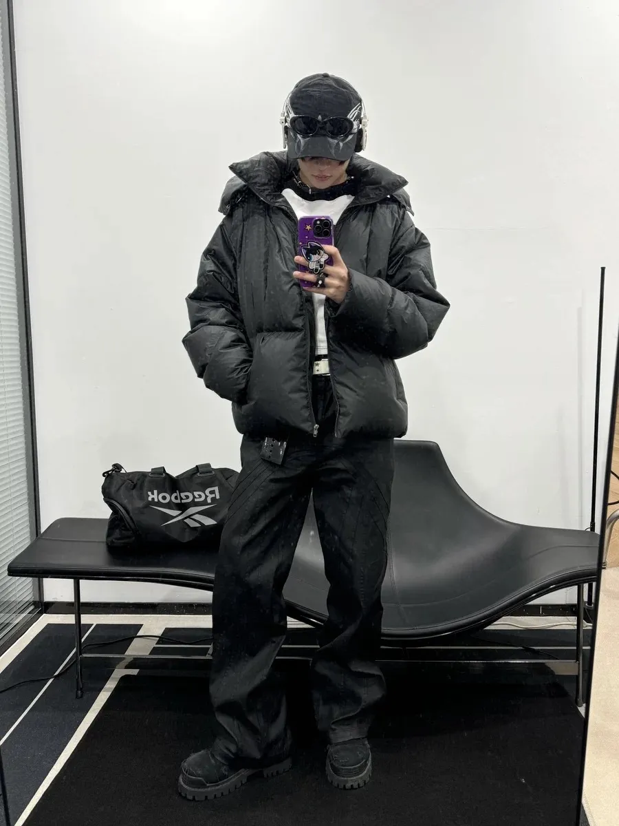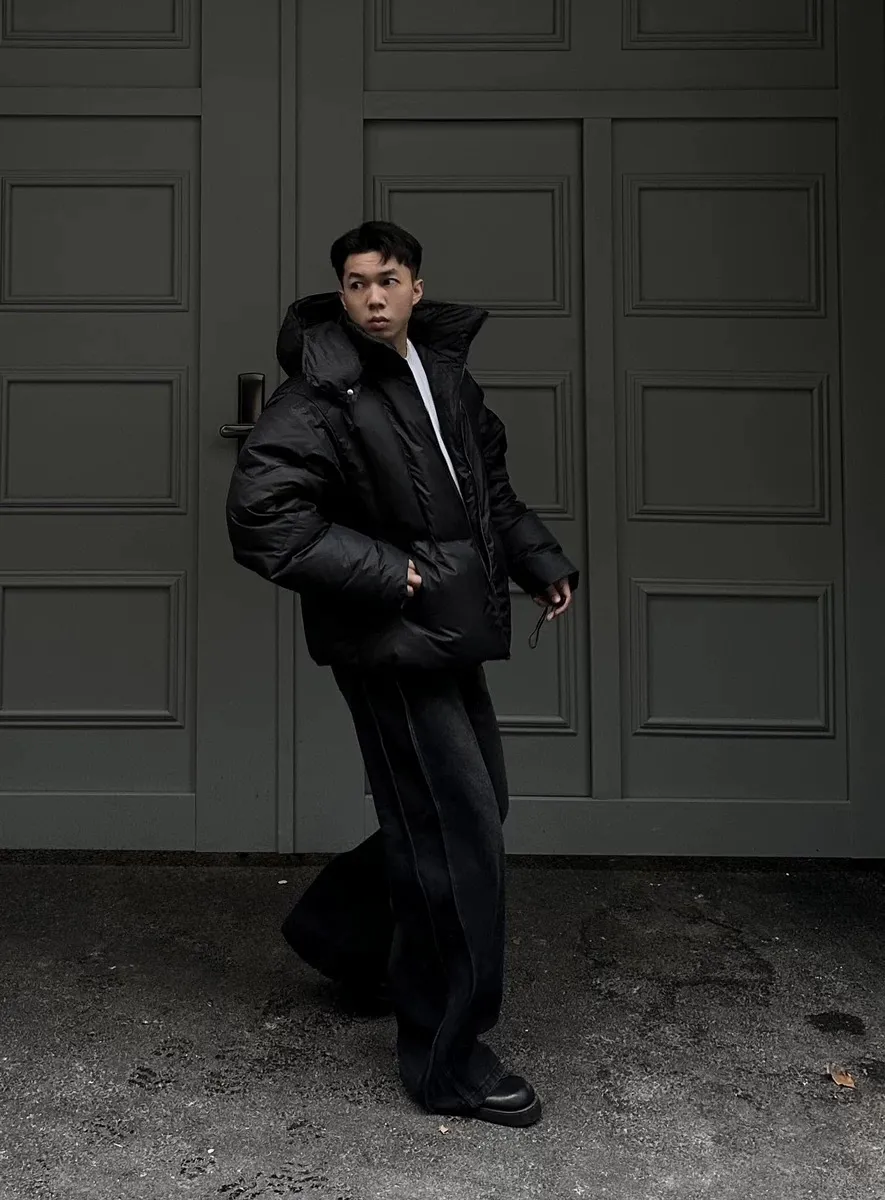 F4F 彎刀 立體剪裁 複合材質 繭型褲 長褲(黑色)