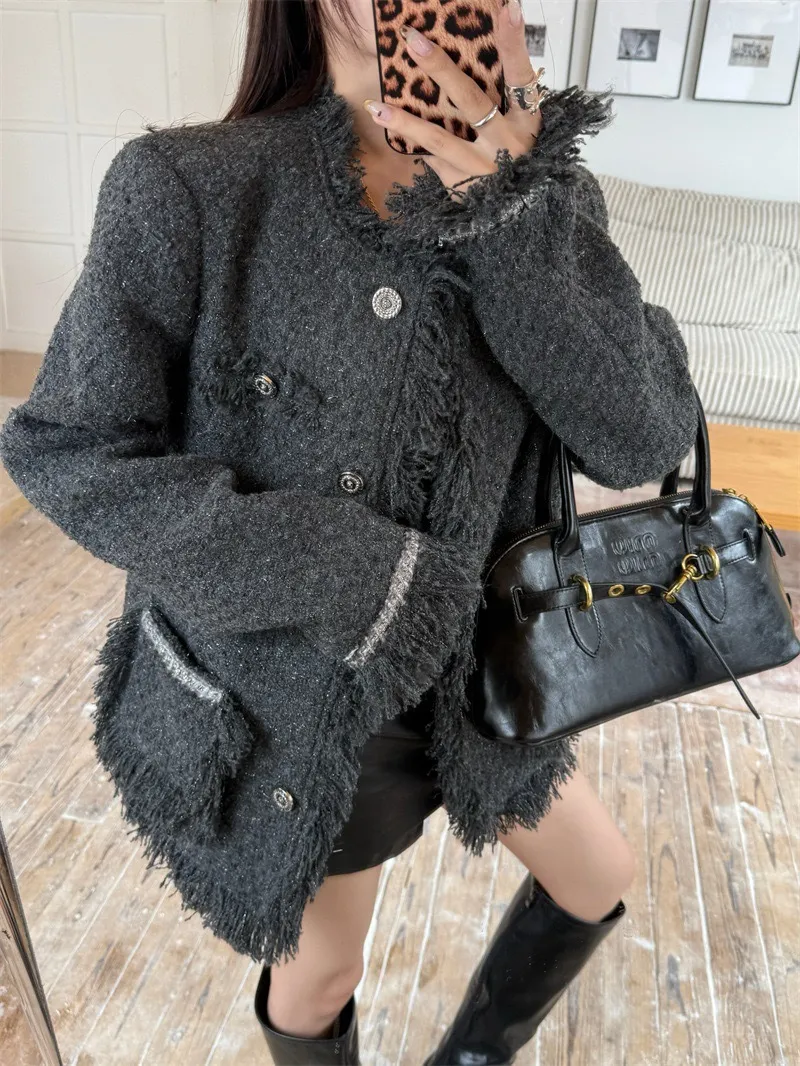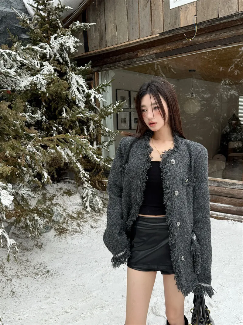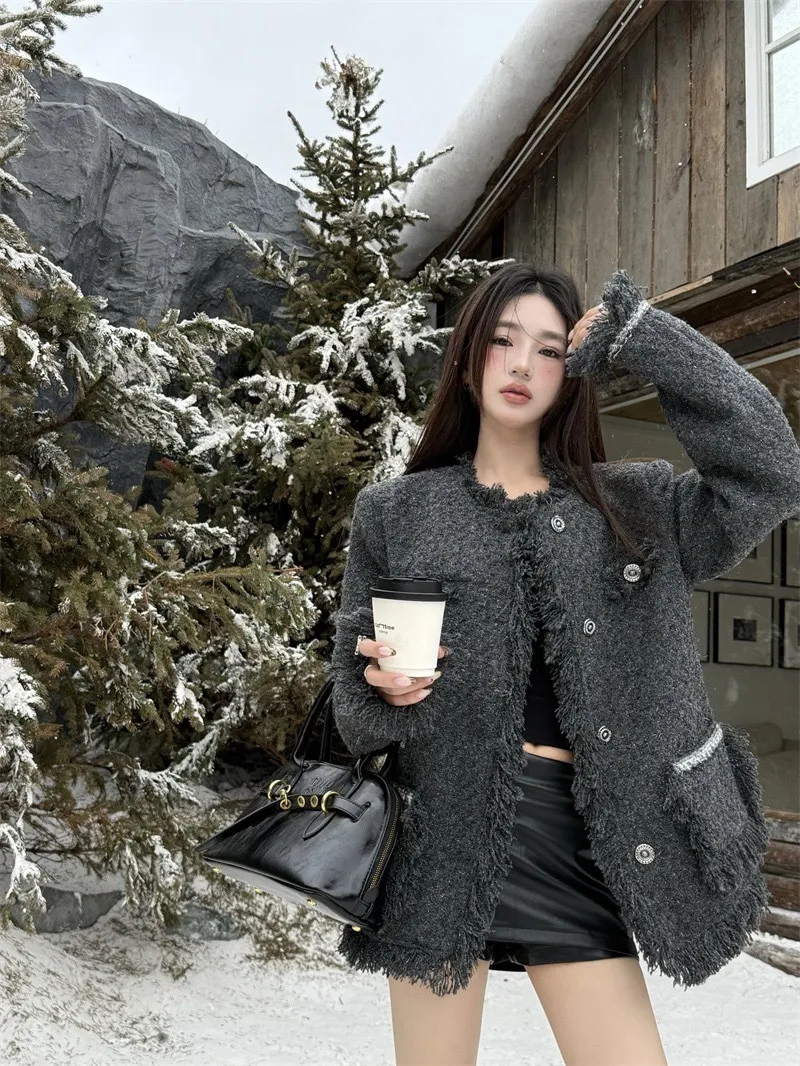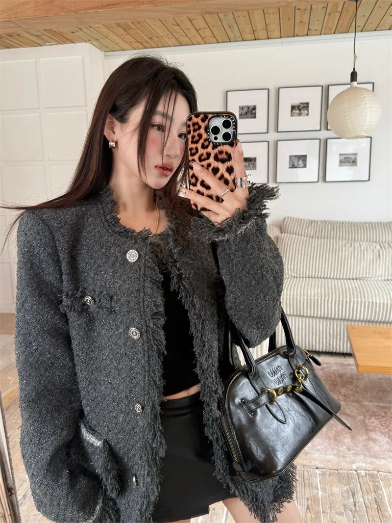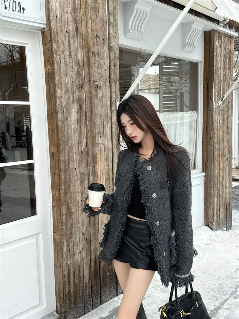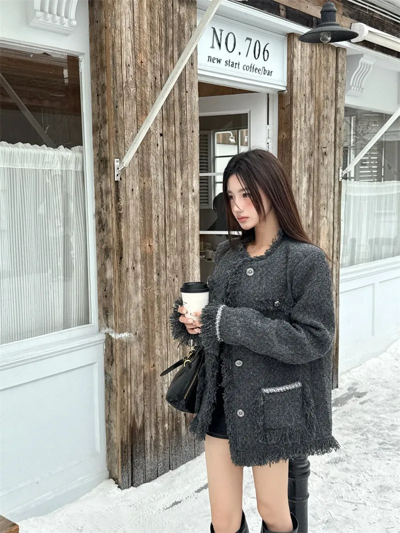 GIRLS 小香風 破壞抽鬚 毛呢 外套(純灰)