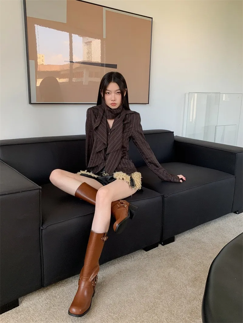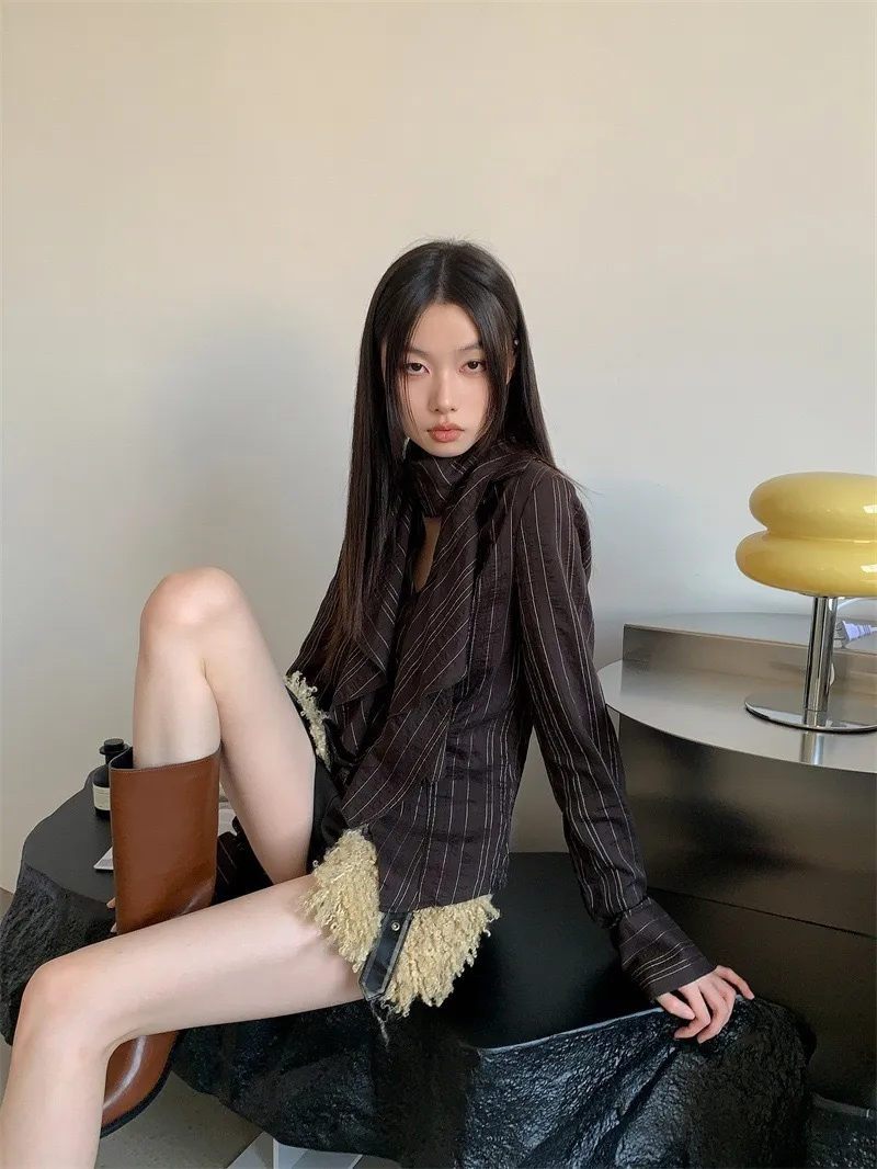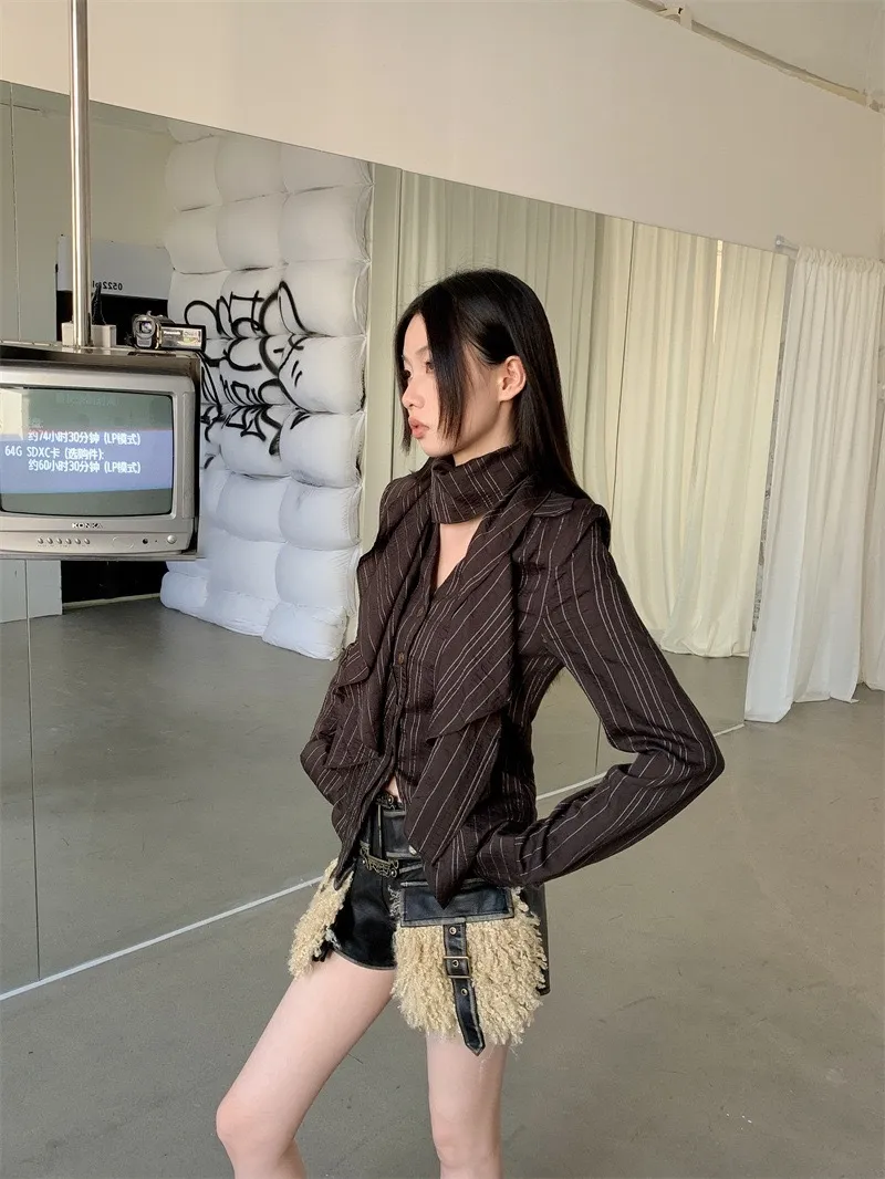 GIRLS 復古條紋 圍巾 長袖襯衫(咖啡)