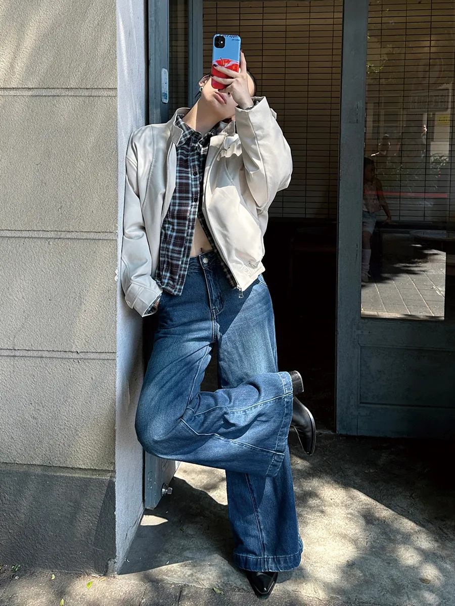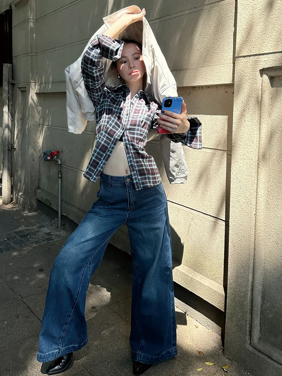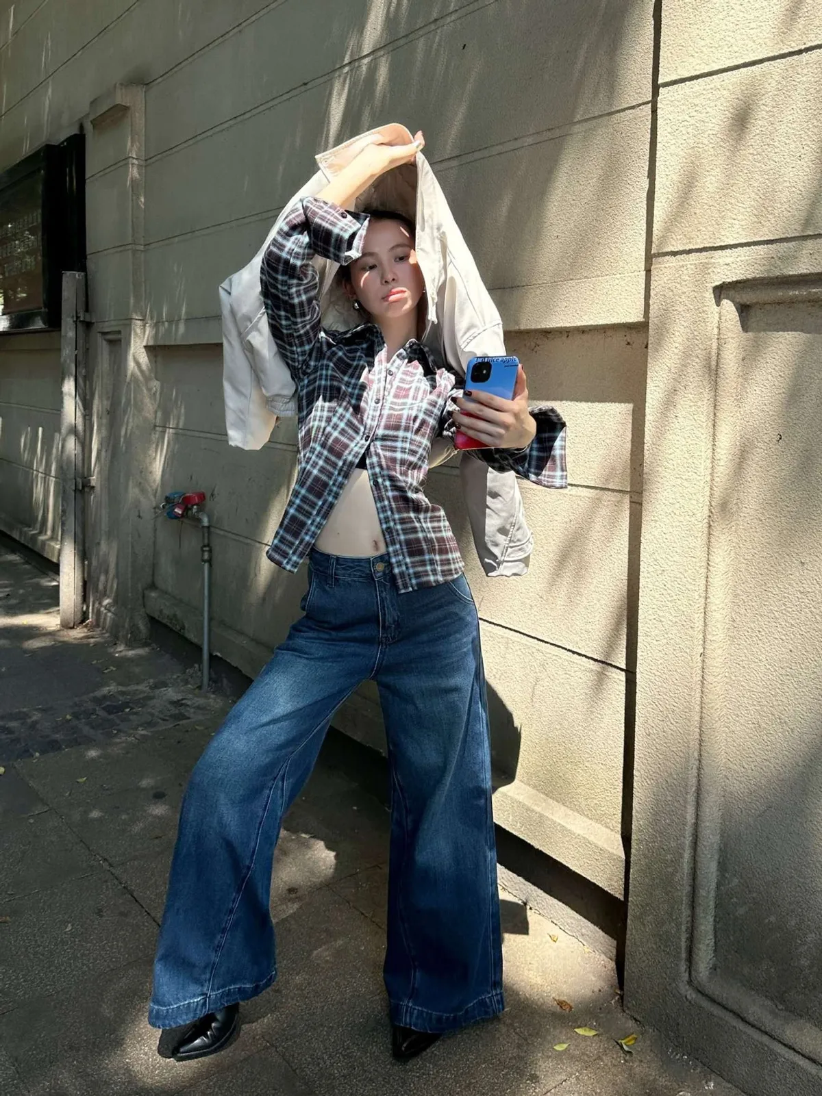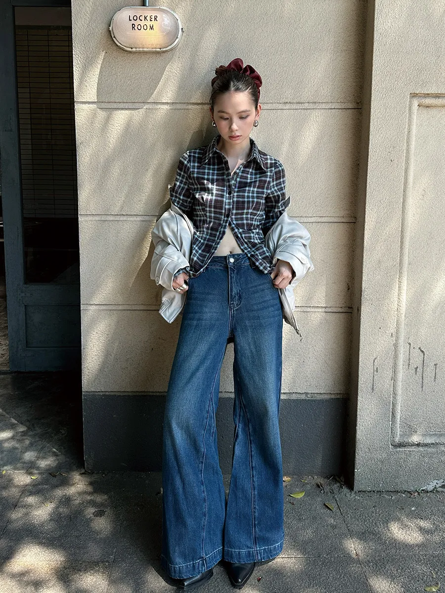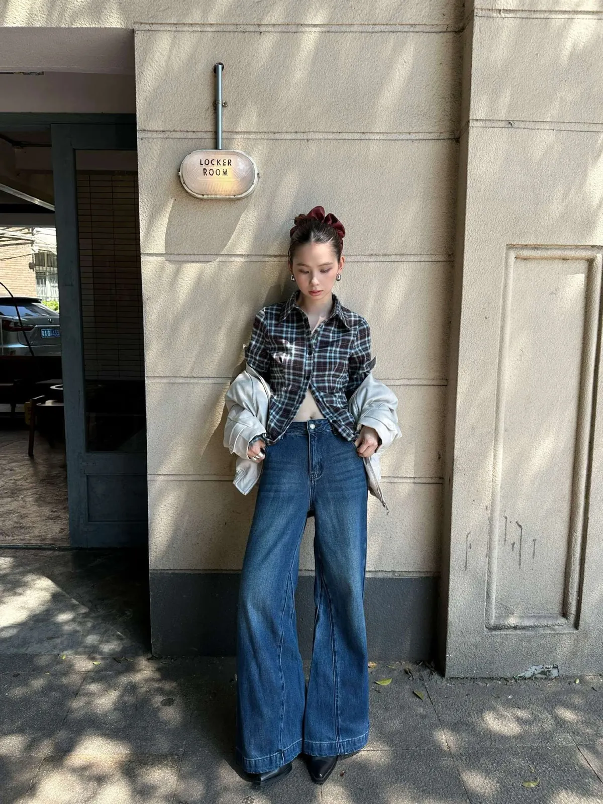 GIRLS 復古純色 闊腿 牛仔褲 附贈腰帶(深藍)