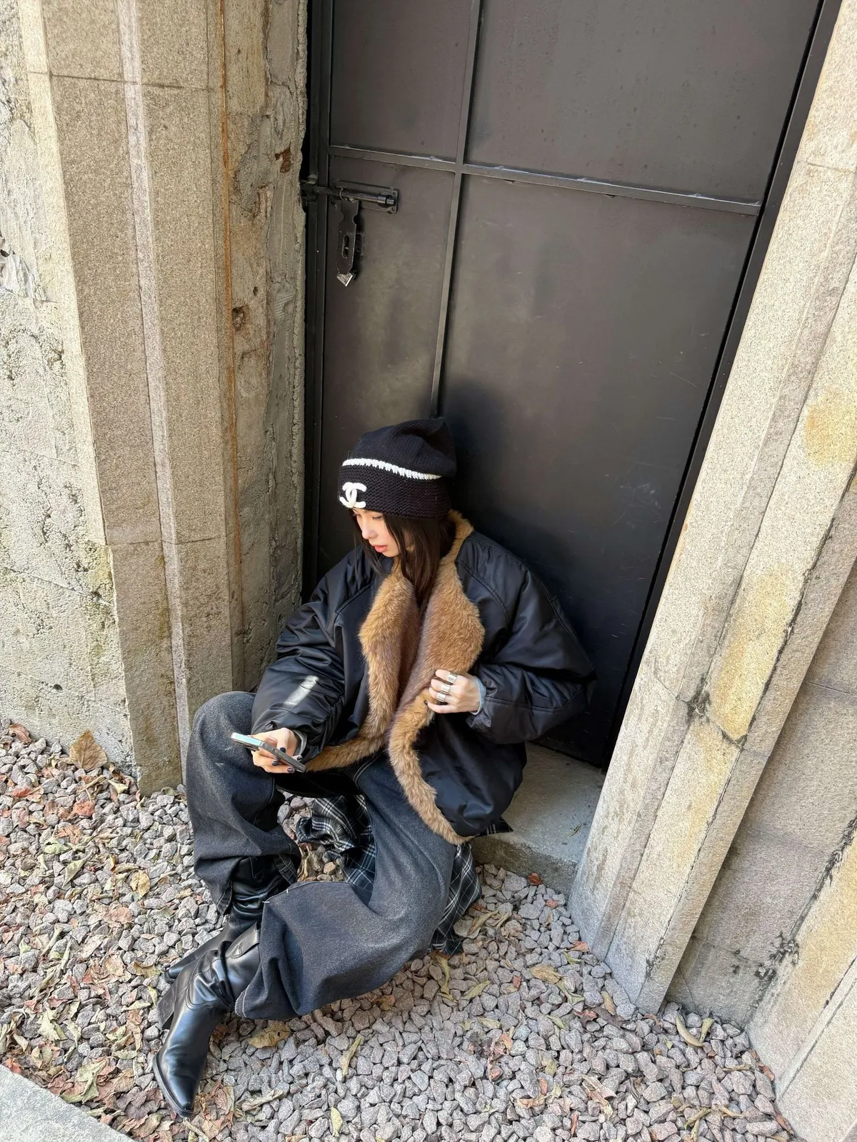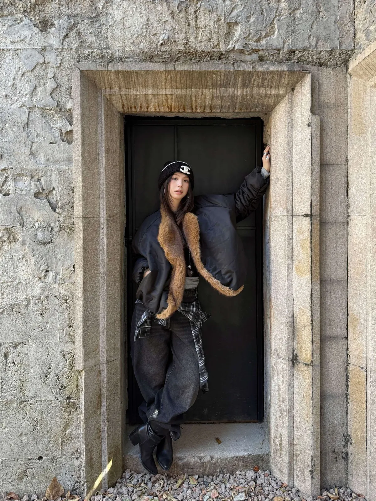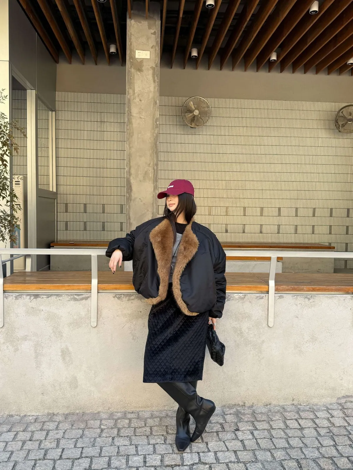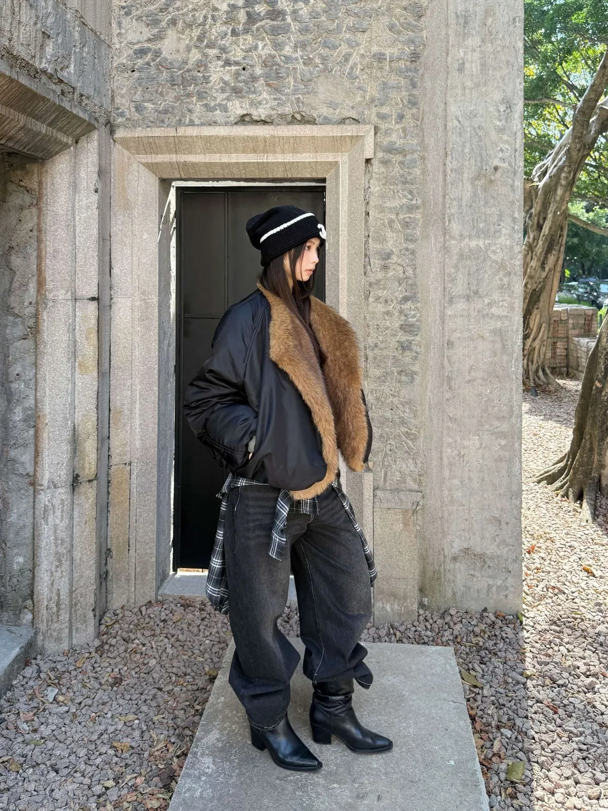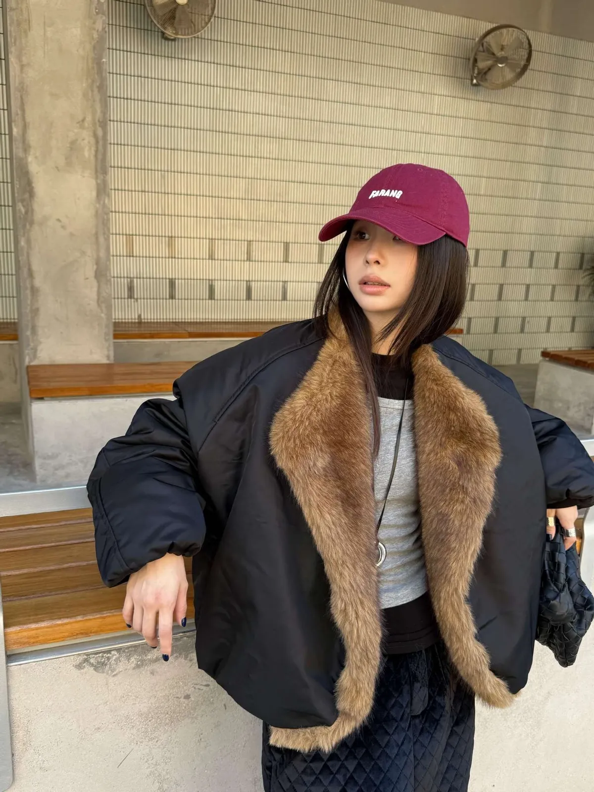 GIRLS 毛領拼接 飛行外套(黑/米白)
