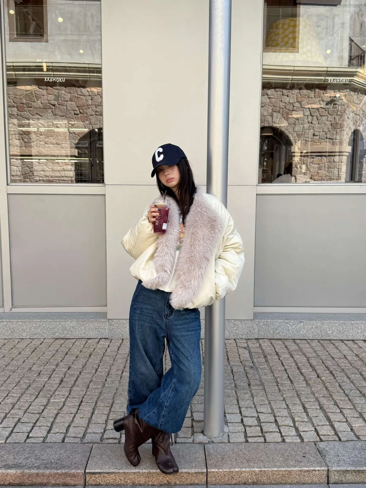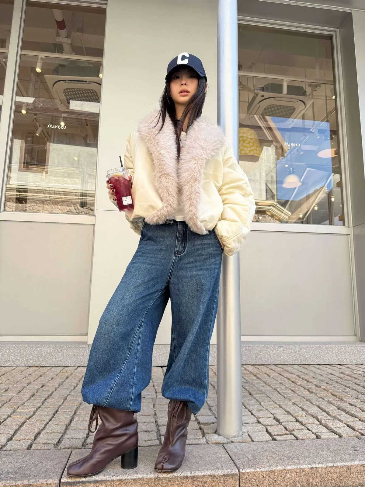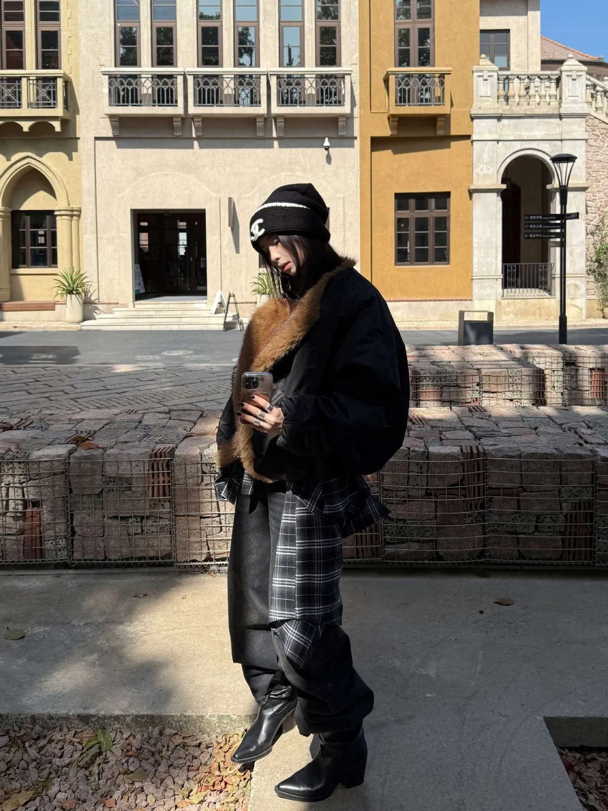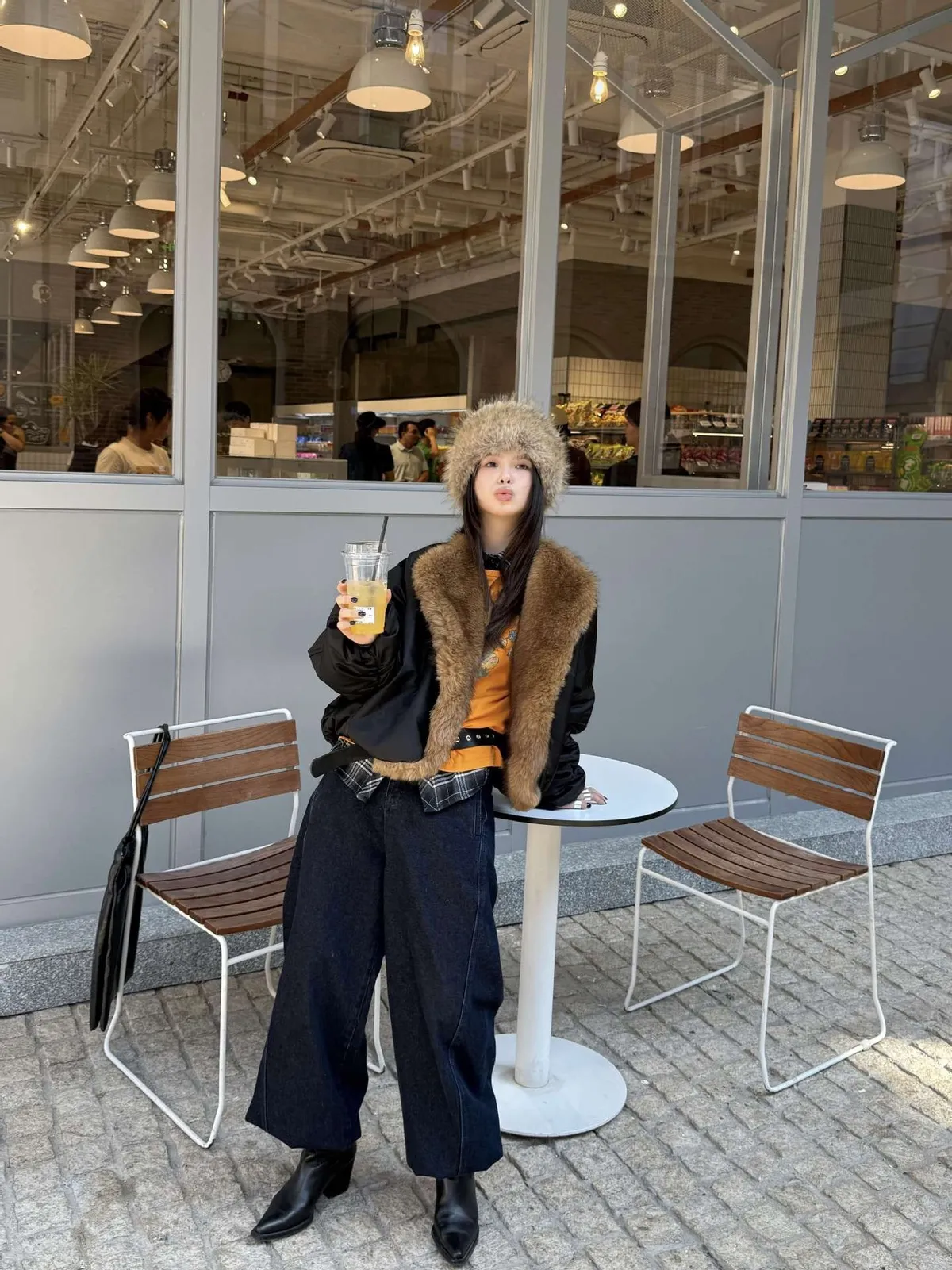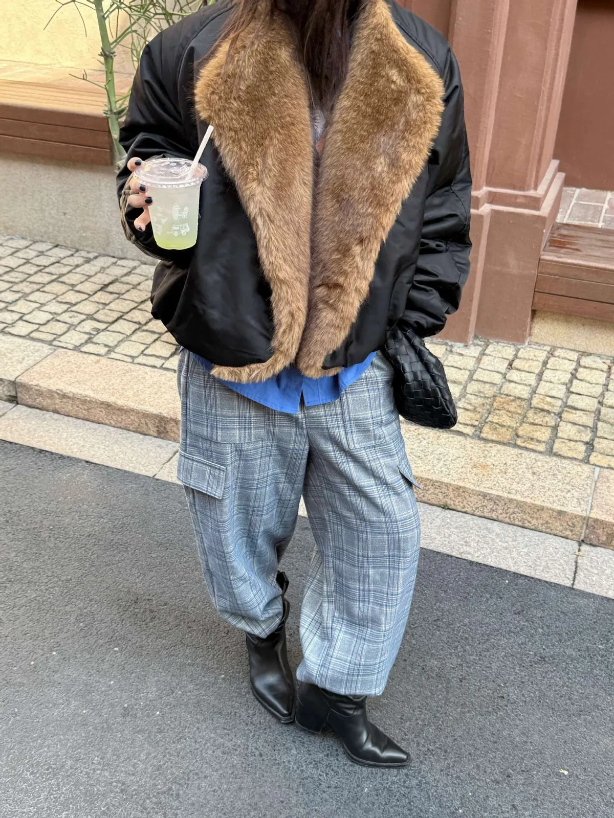 GIRLS 毛領拼接 飛行外套(黑/米白)