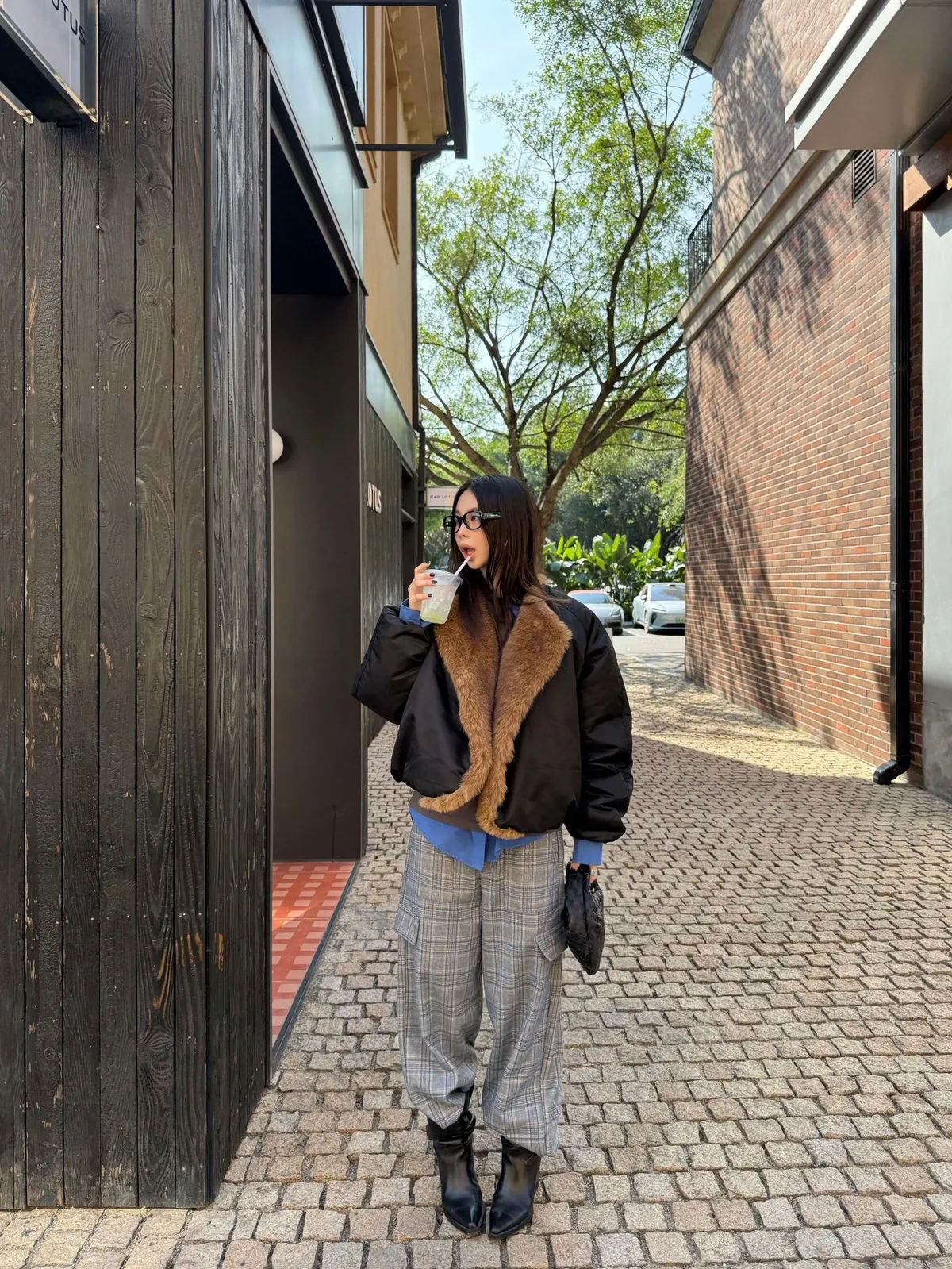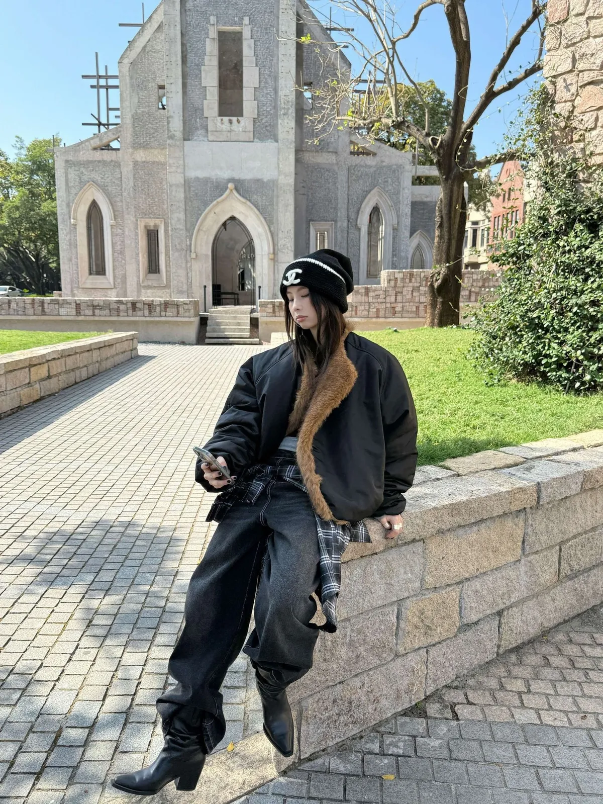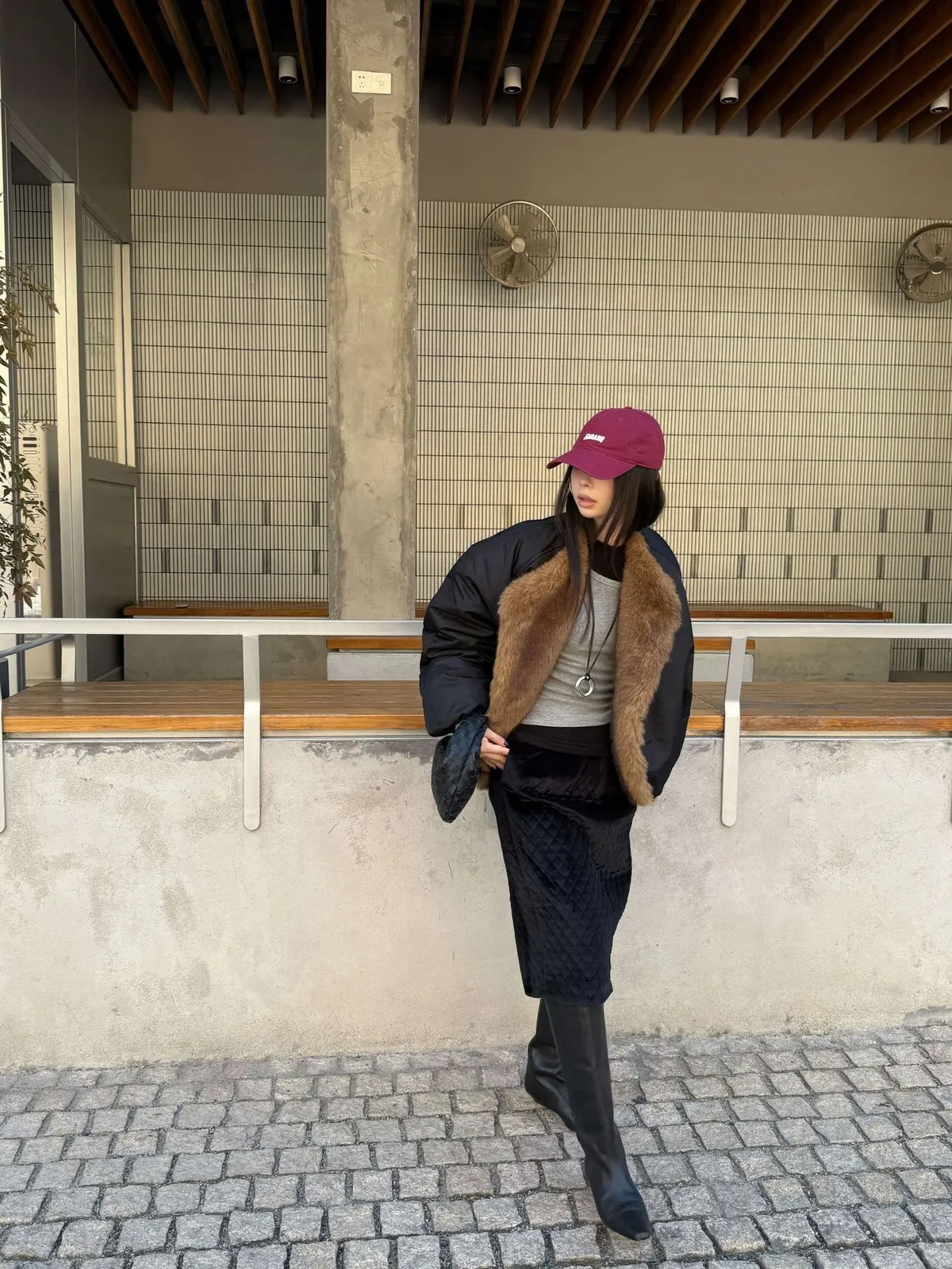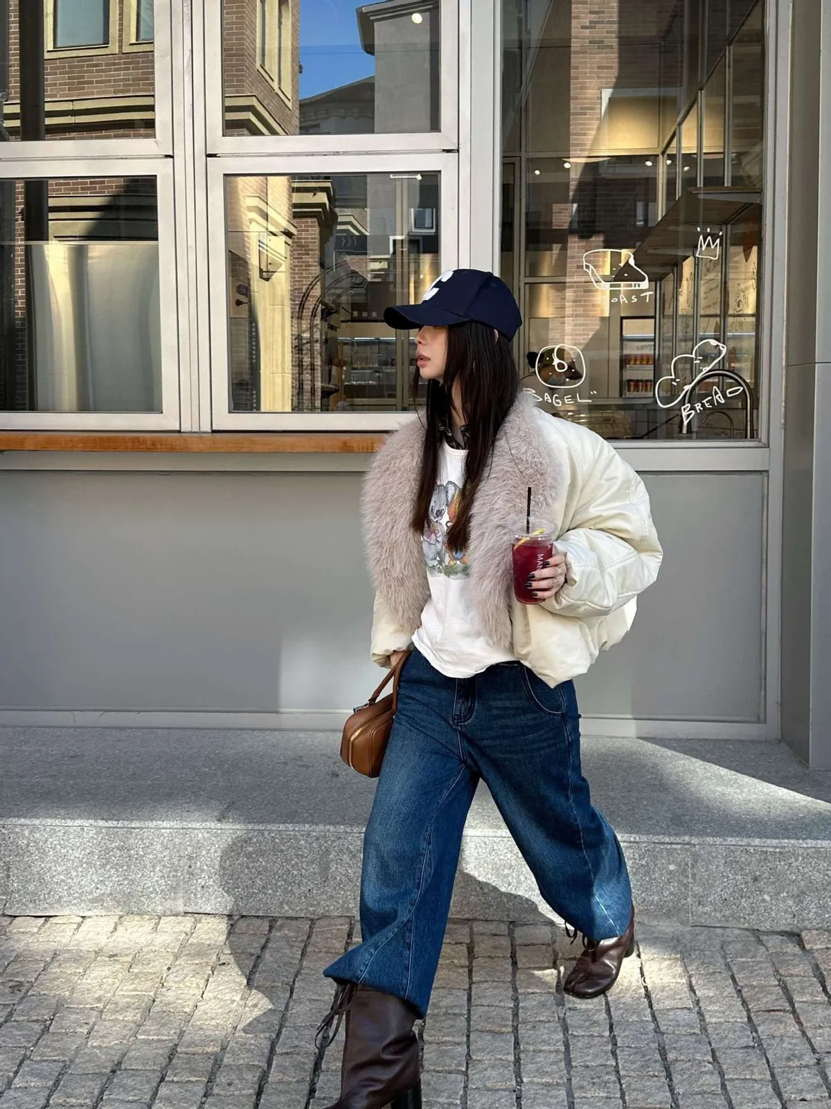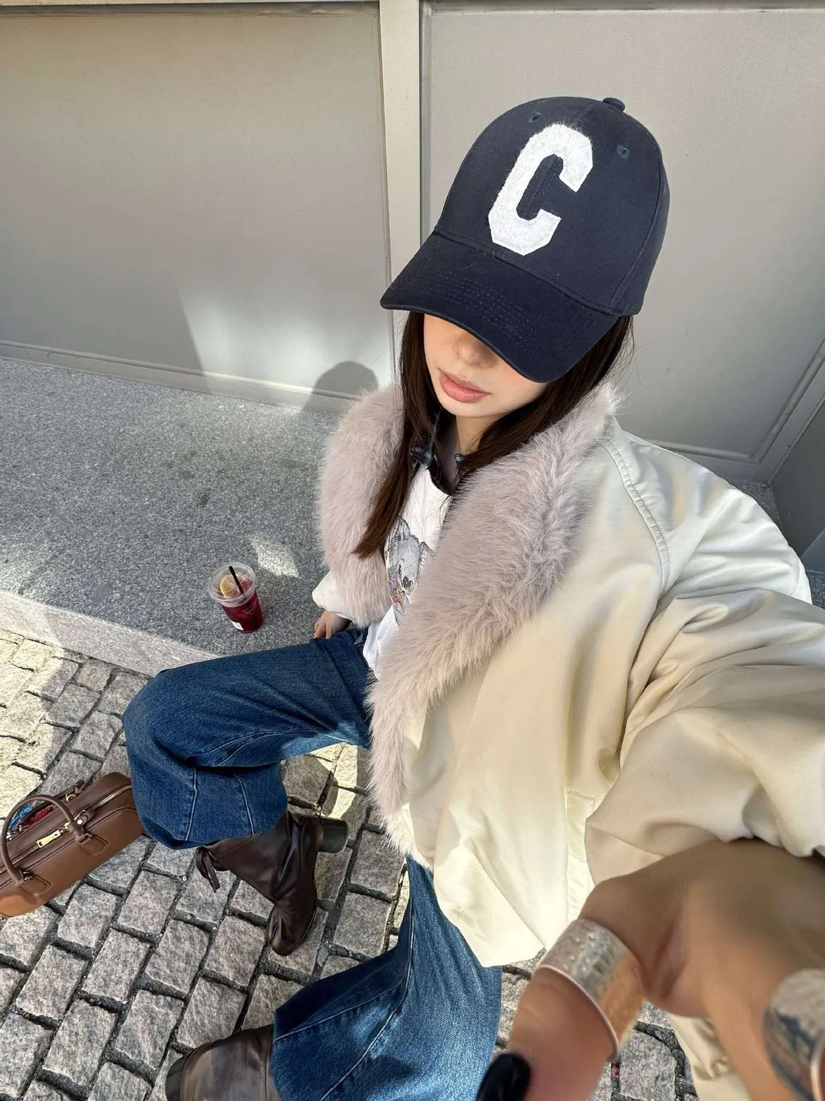 GIRLS 毛領拼接 飛行外套(黑/米白)