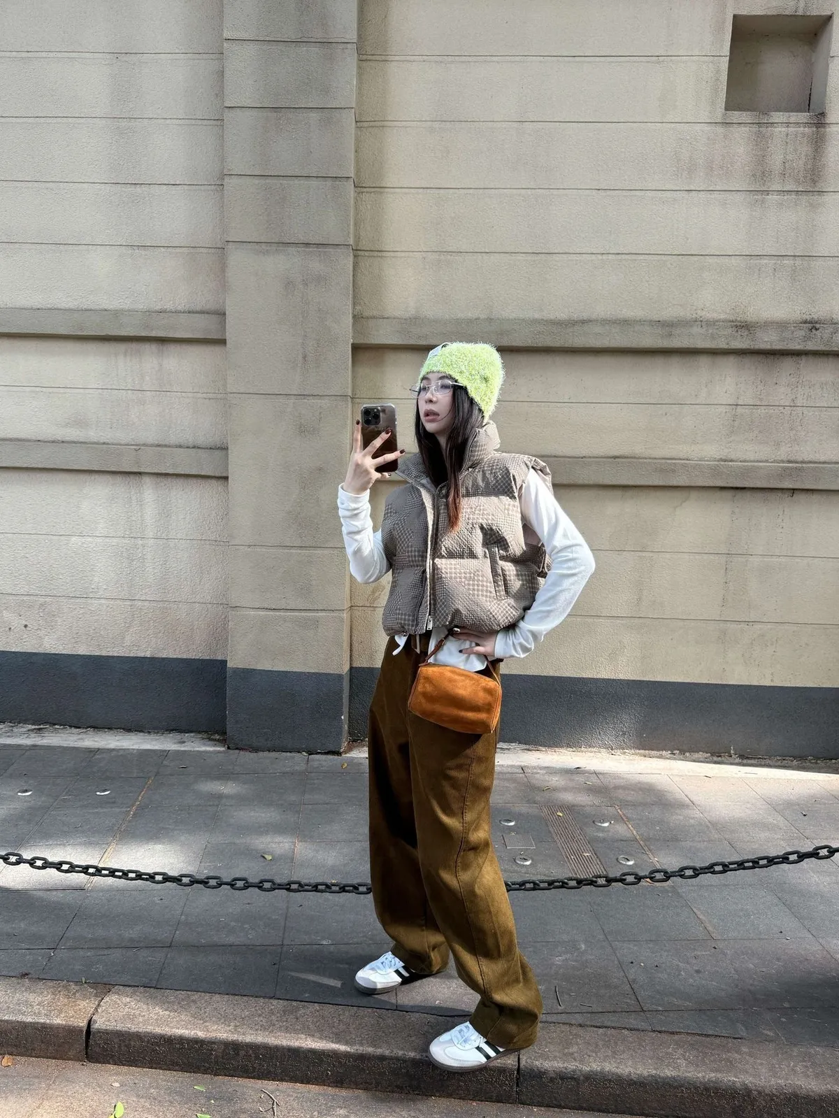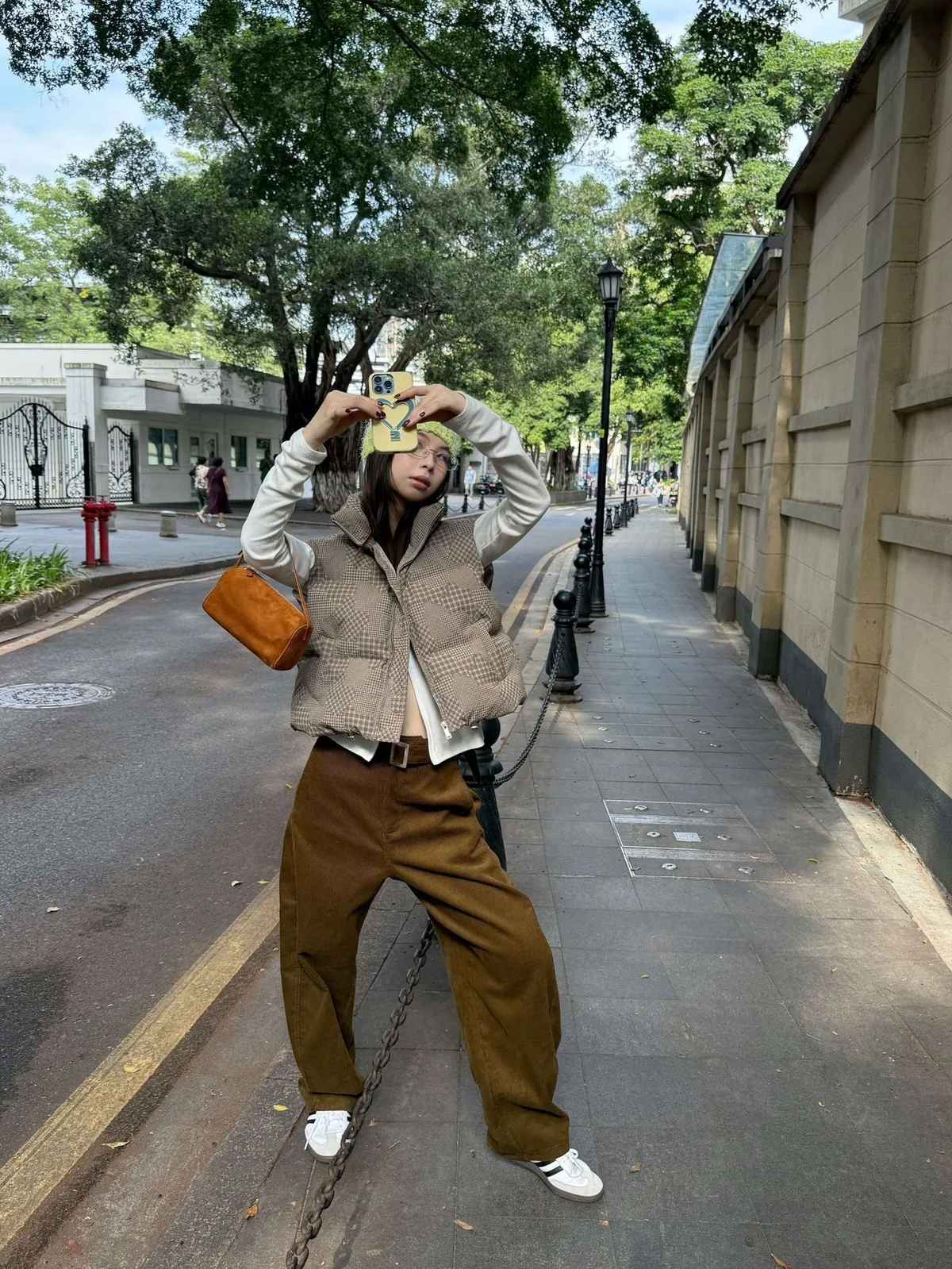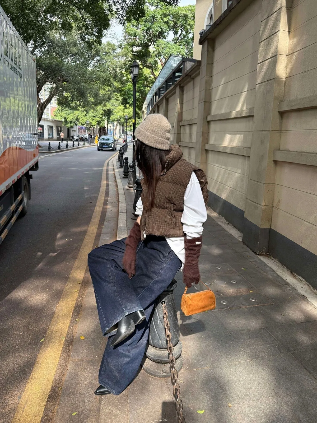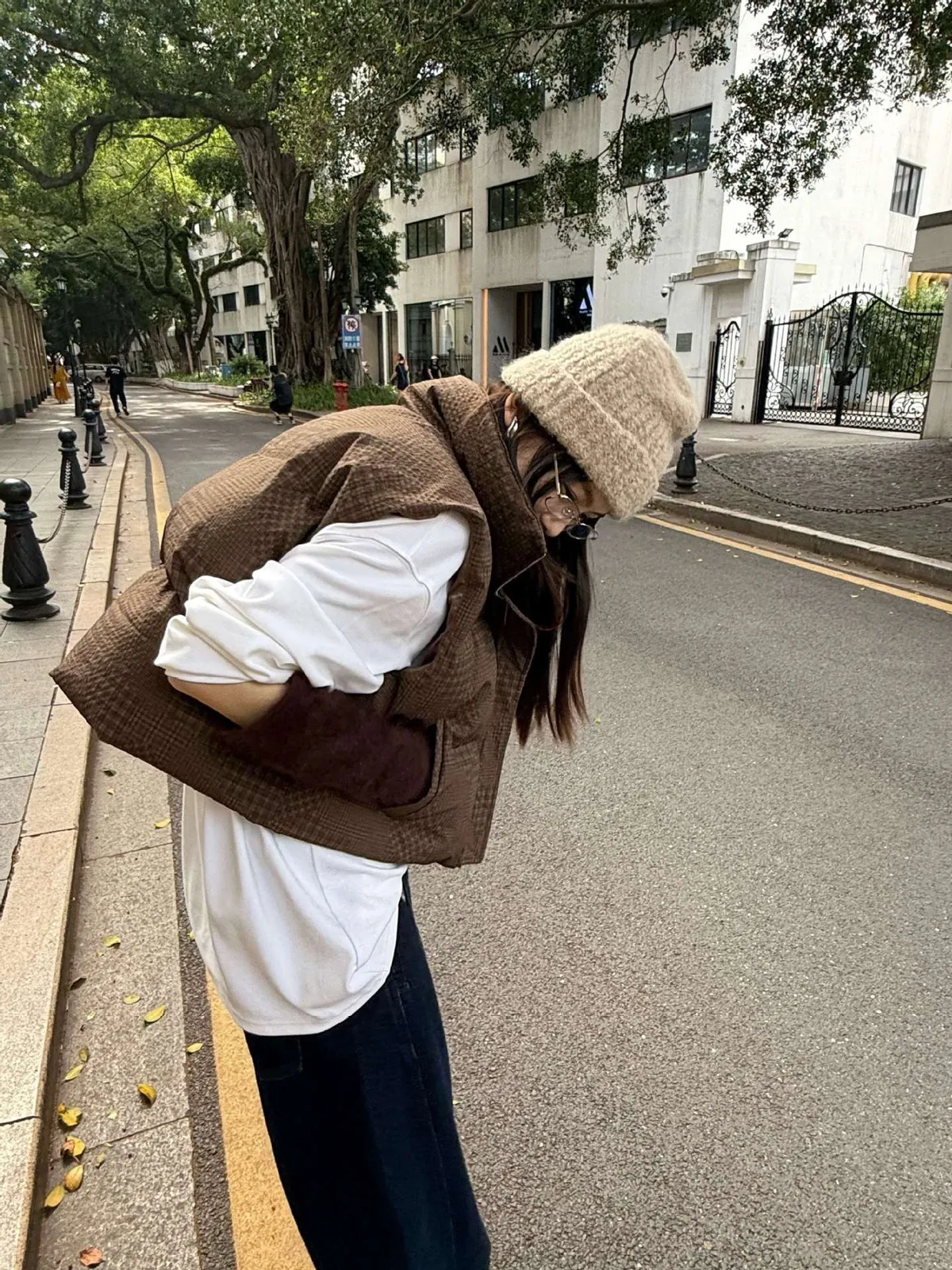 GIRLS 復古方塊 設計感 短版 羽絨背心(岩石灰/深咖)