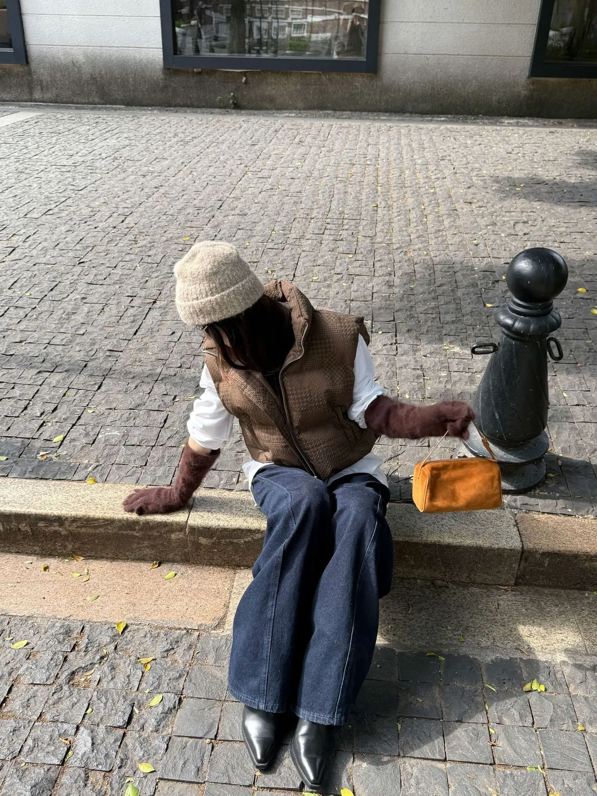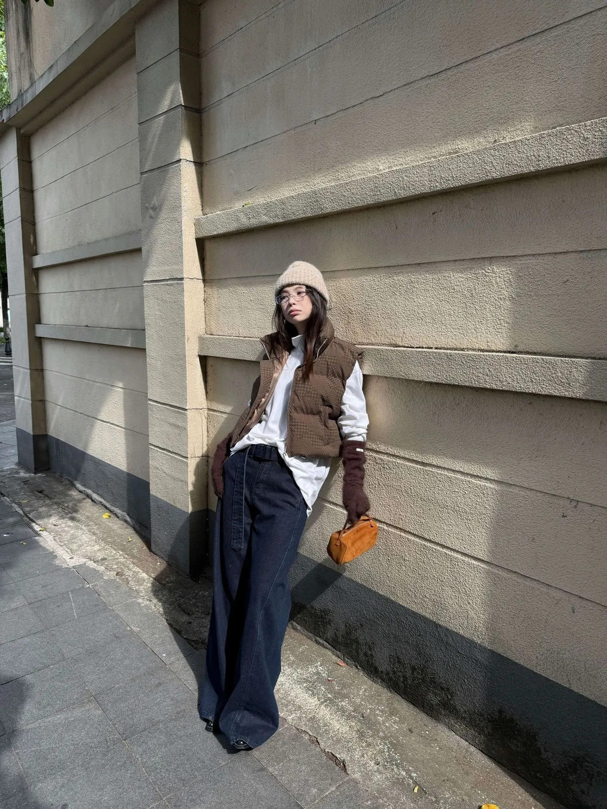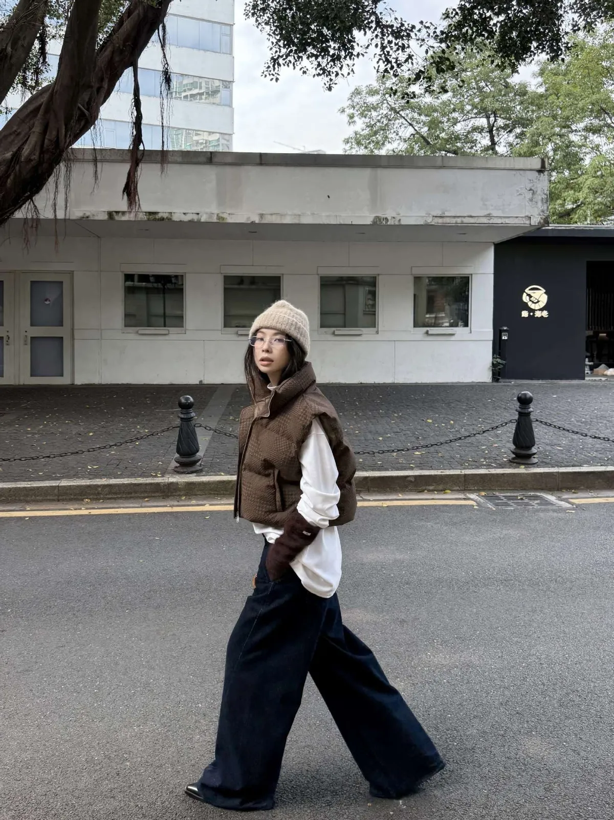 GIRLS 復古方塊 設計感 短版 羽絨背心(岩石灰/深咖)
