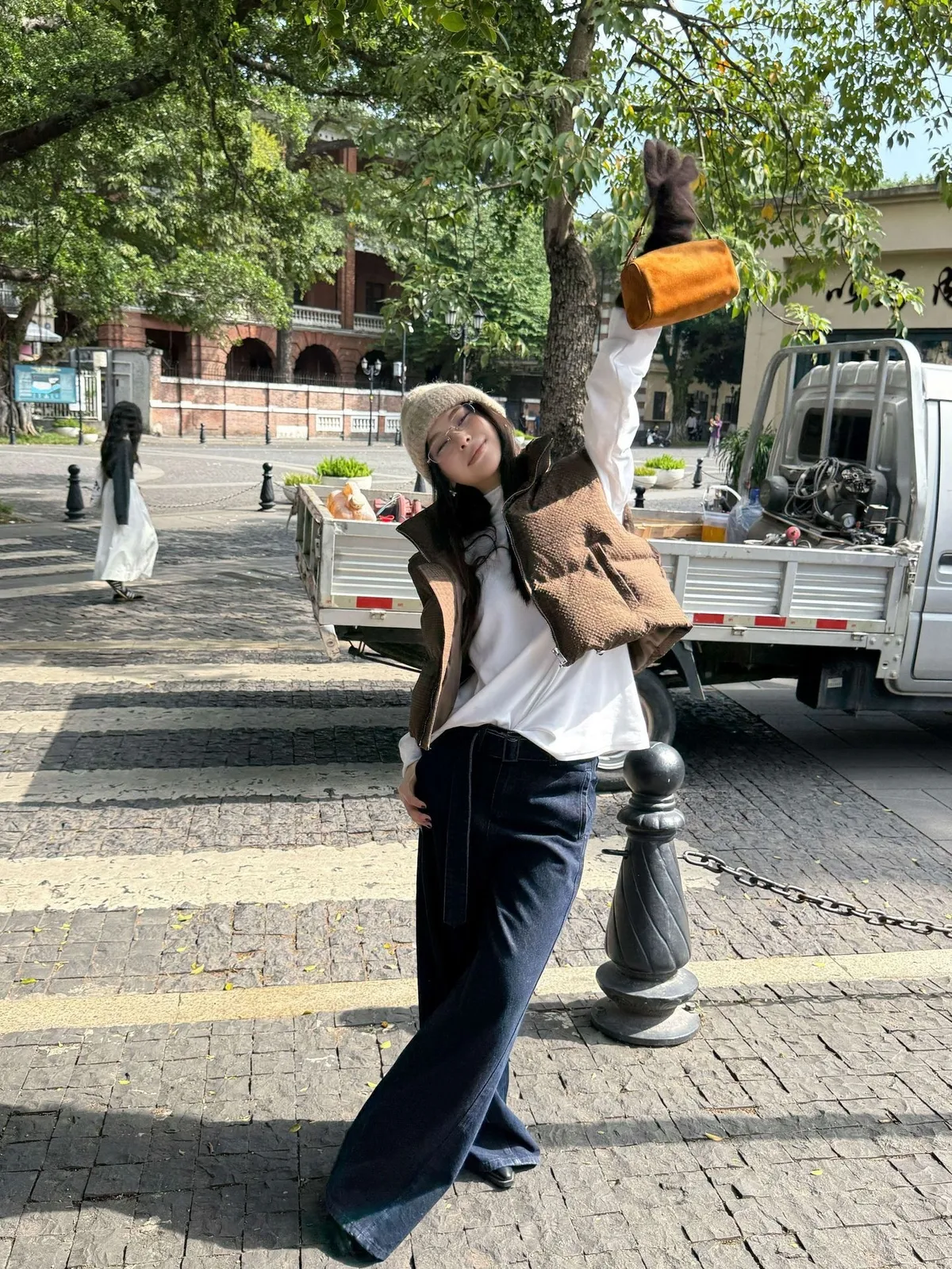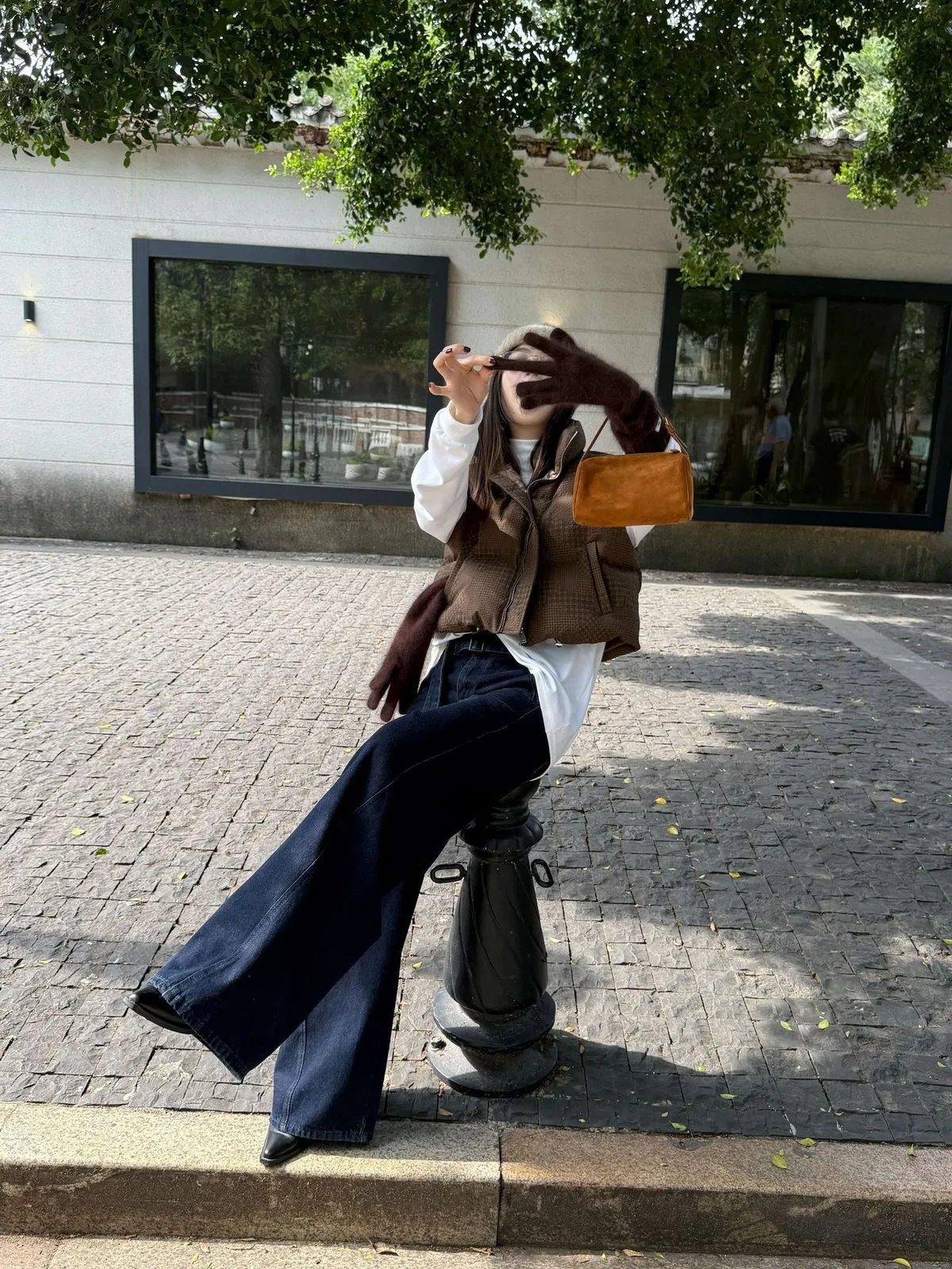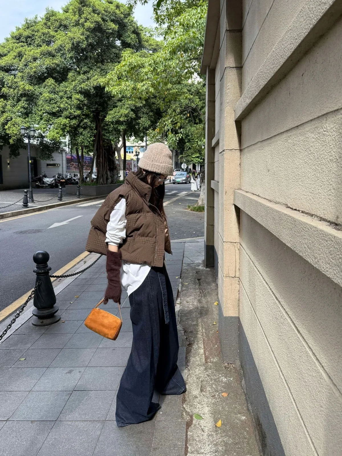 GIRLS 復古方塊 設計感 短版 羽絨背心(岩石灰/深咖)