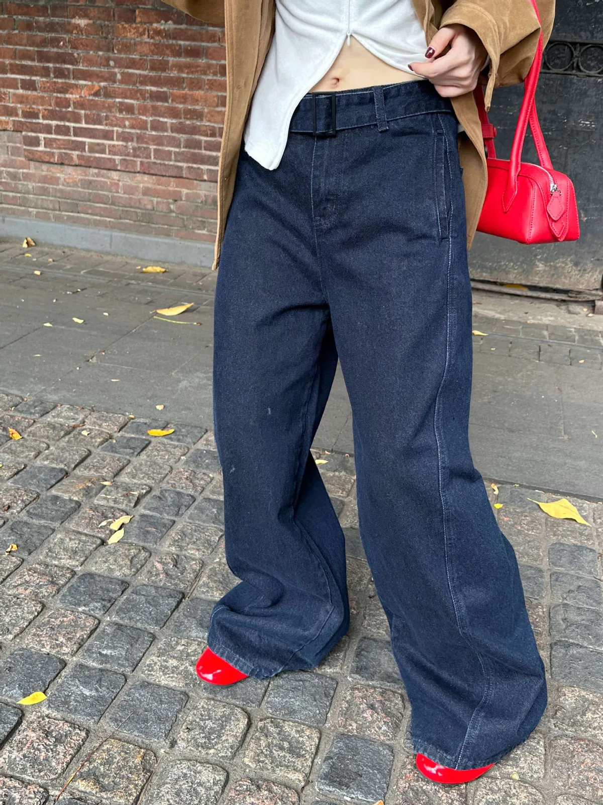 GIRLS 復古純色 闊腿 牛仔褲 附贈腰帶(深藍)
