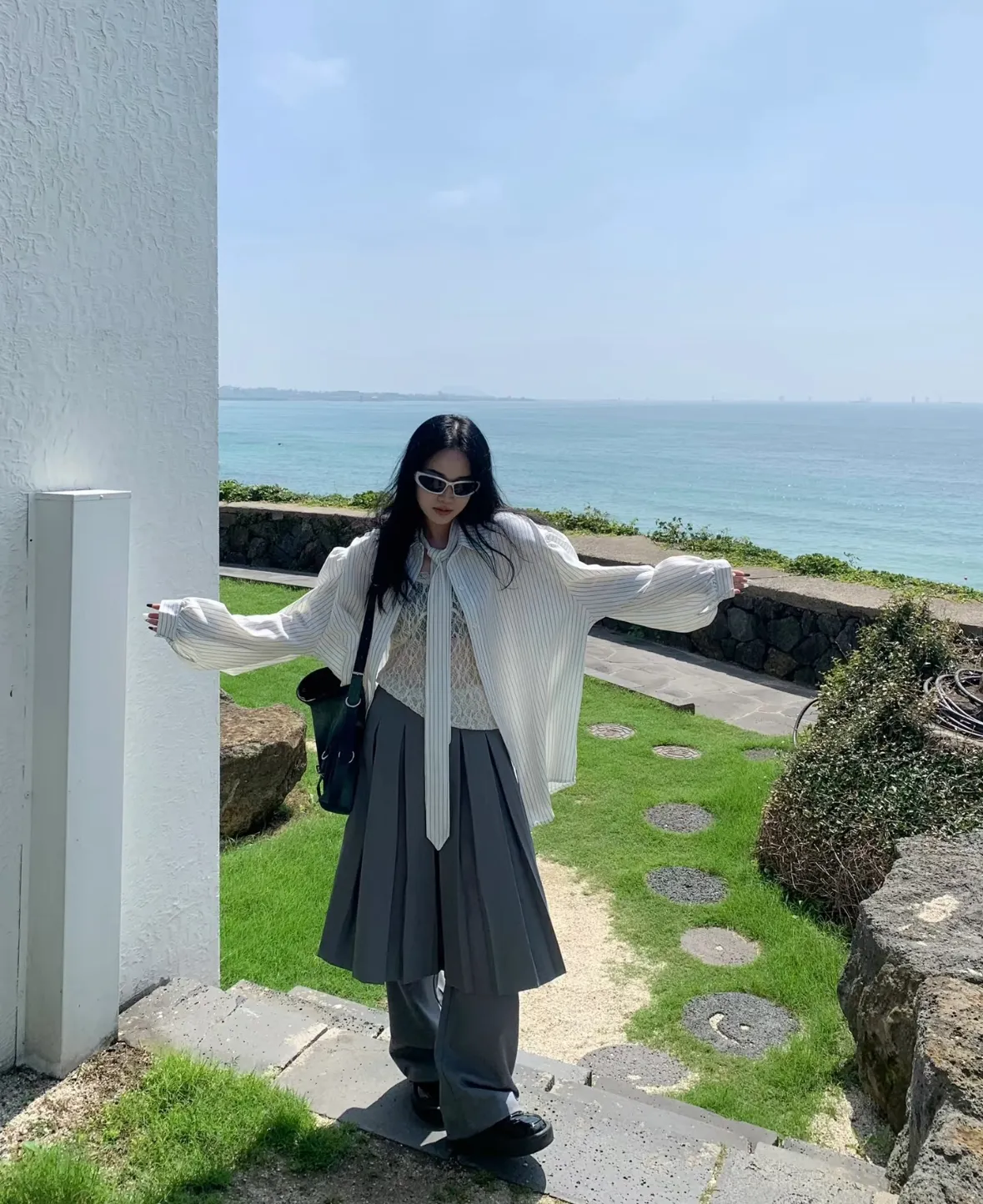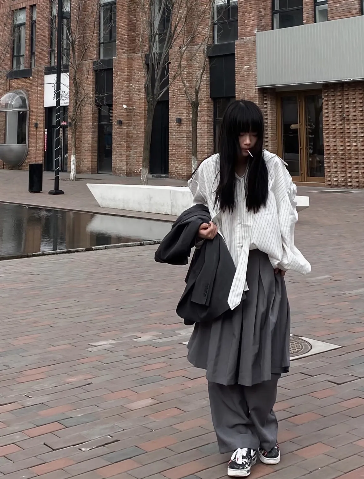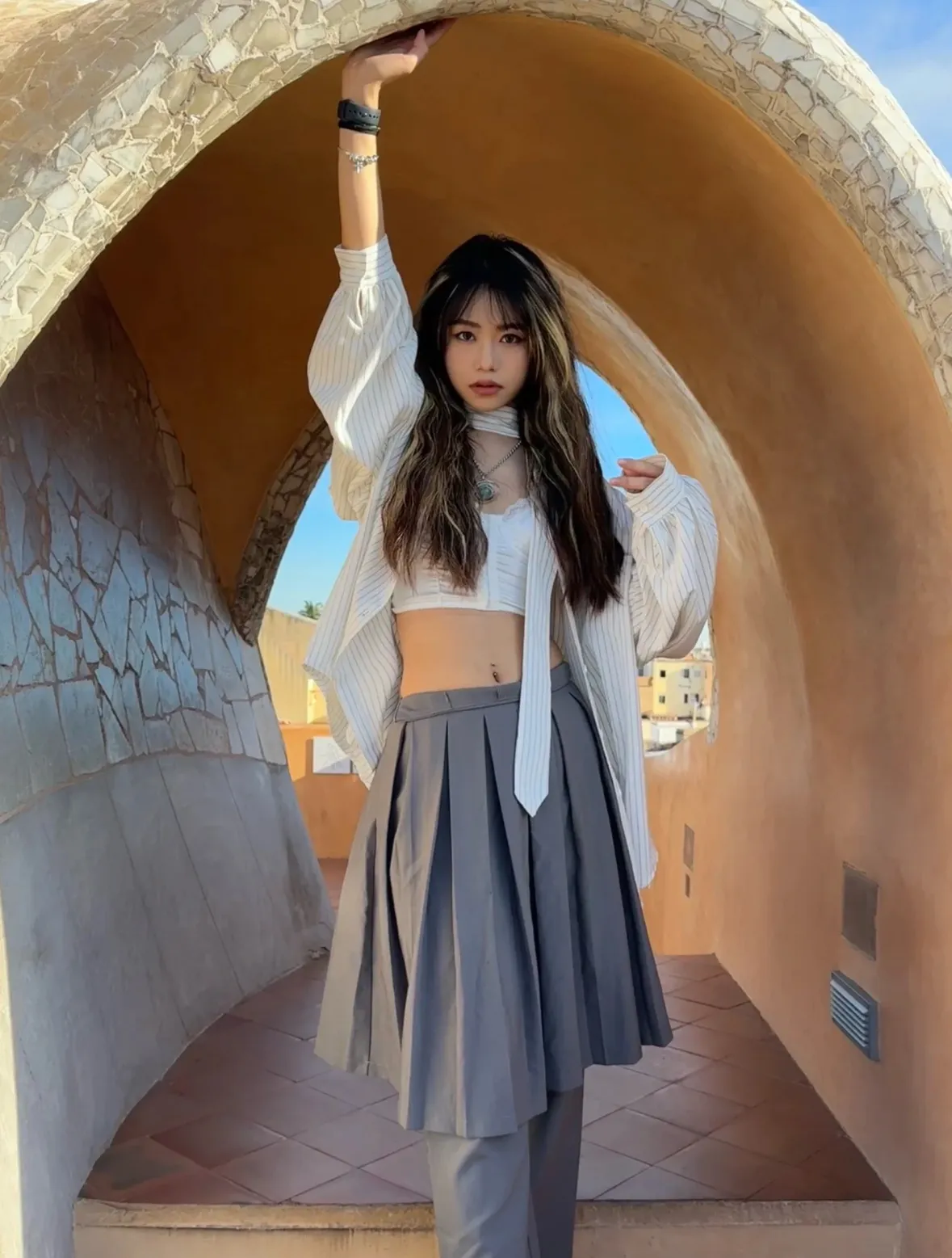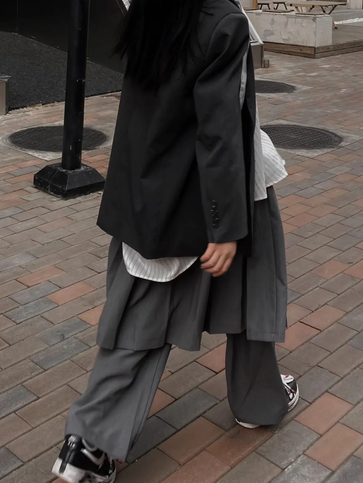 GIRLS 假兩件 百褶裙 西裝褲(灰色)