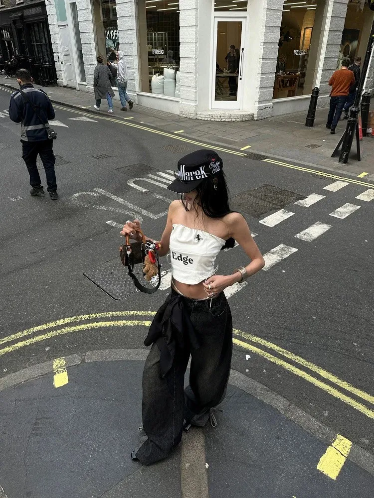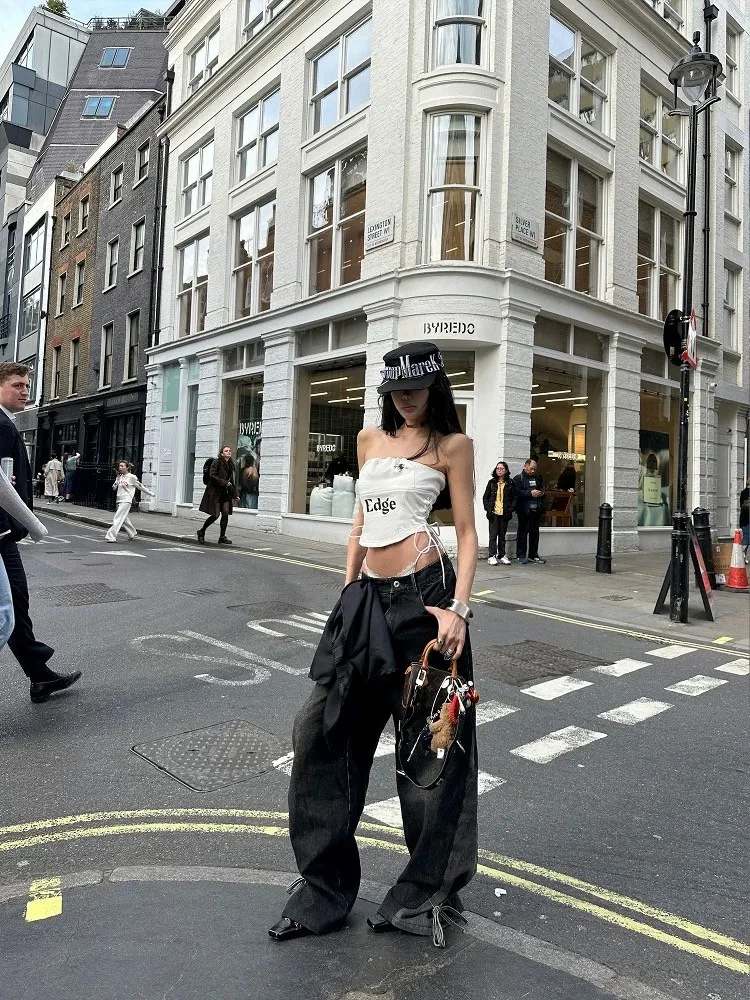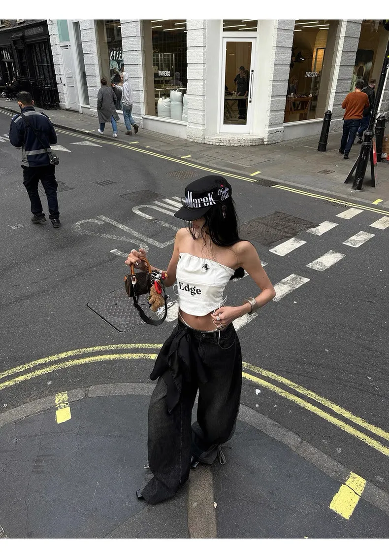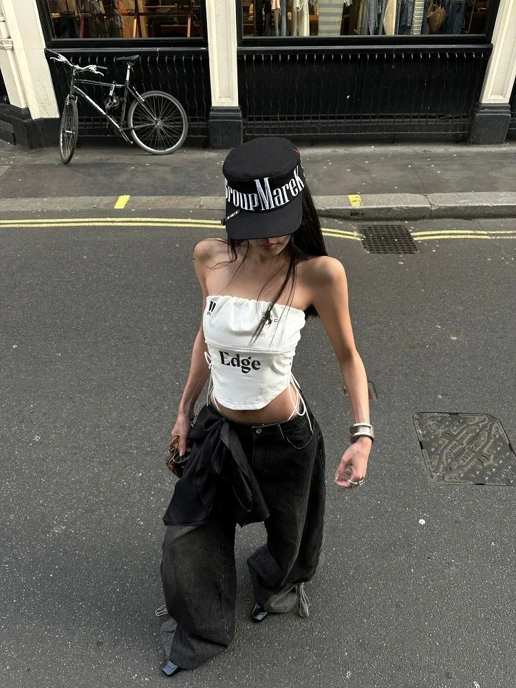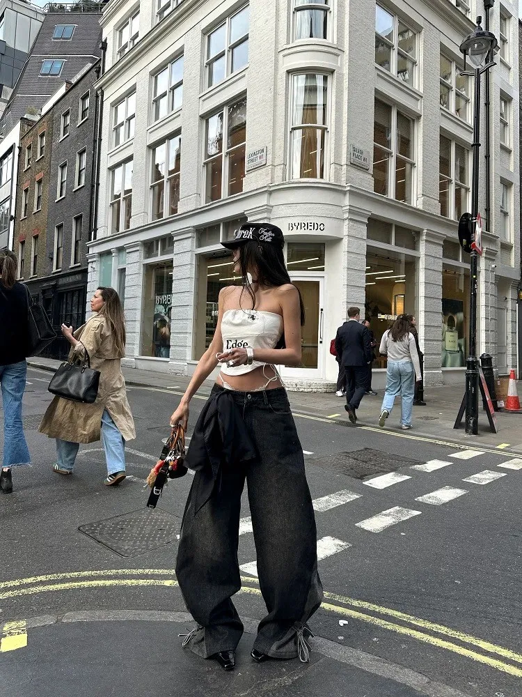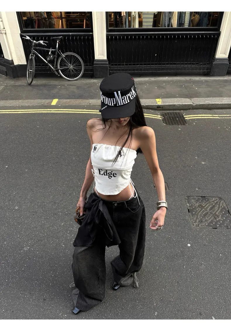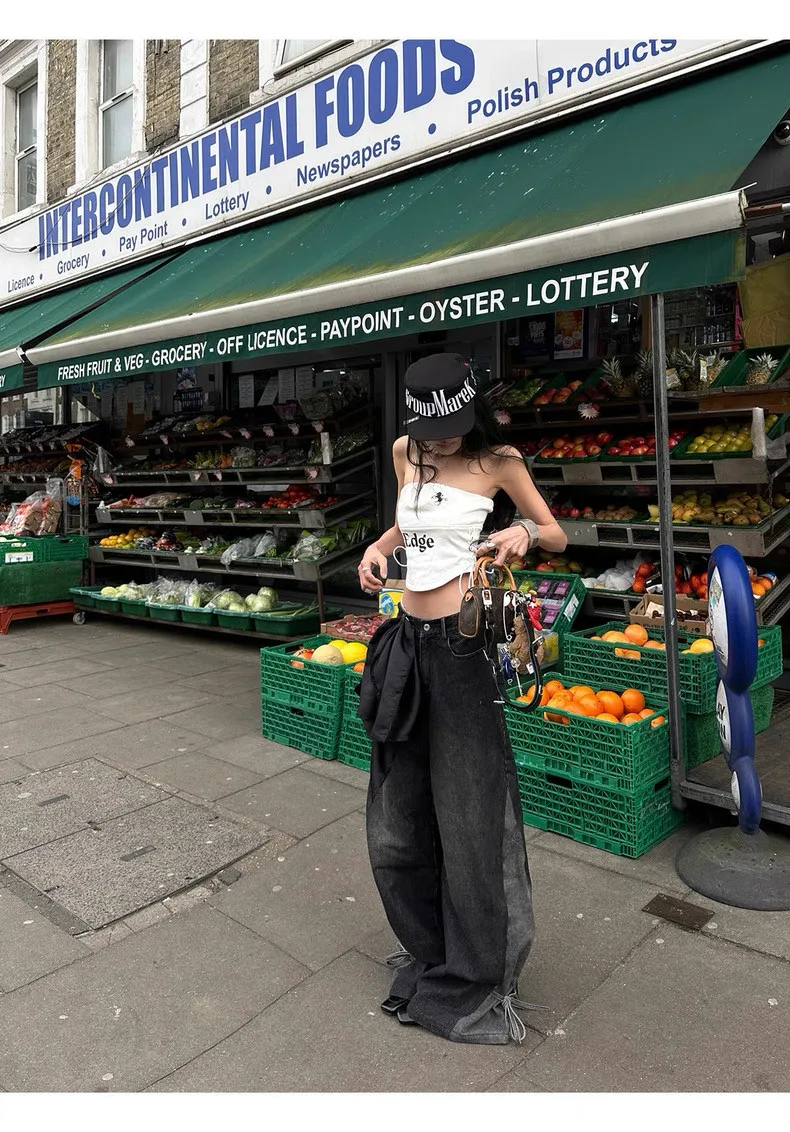 GIRLS 撞色拼接 綁帶 牛仔褲(黑色)