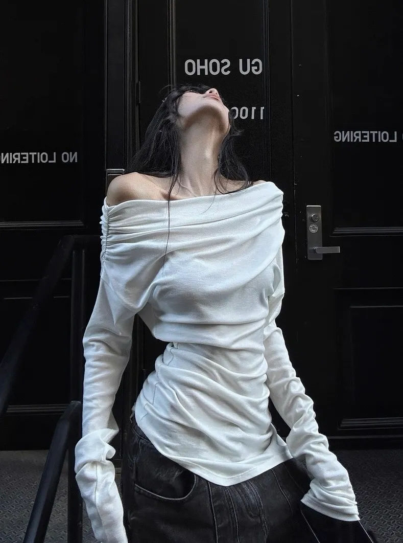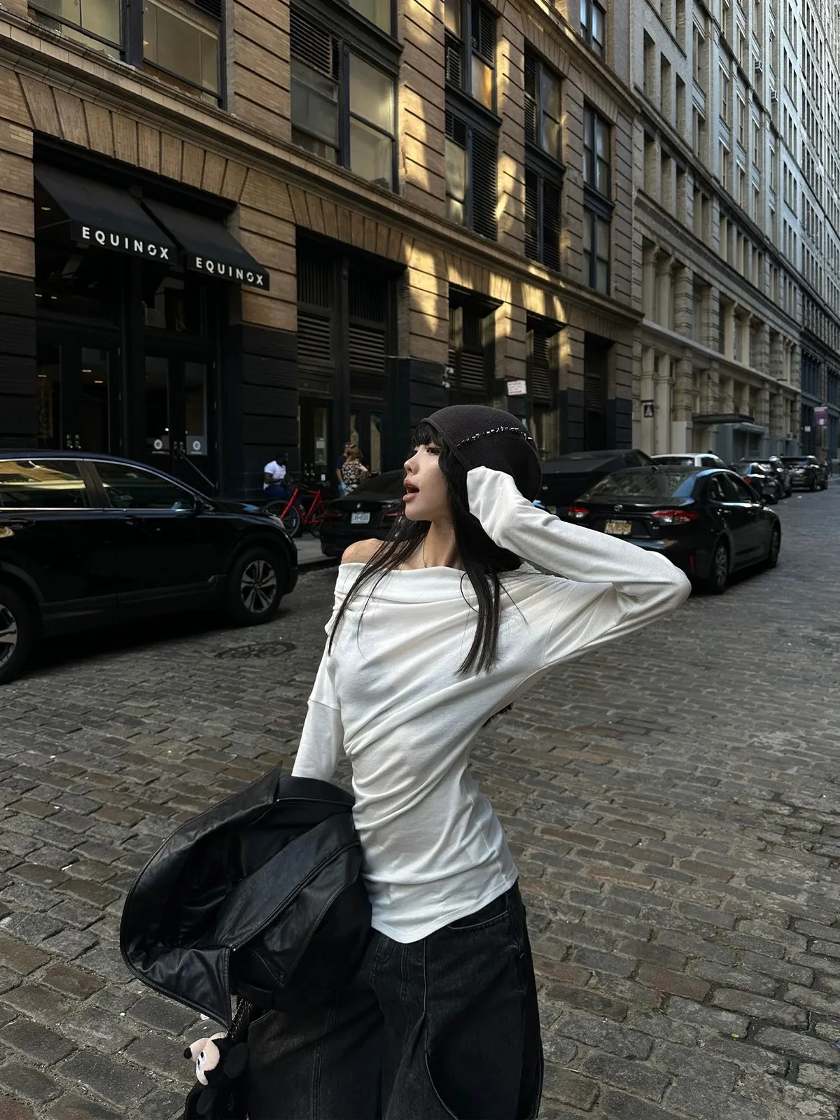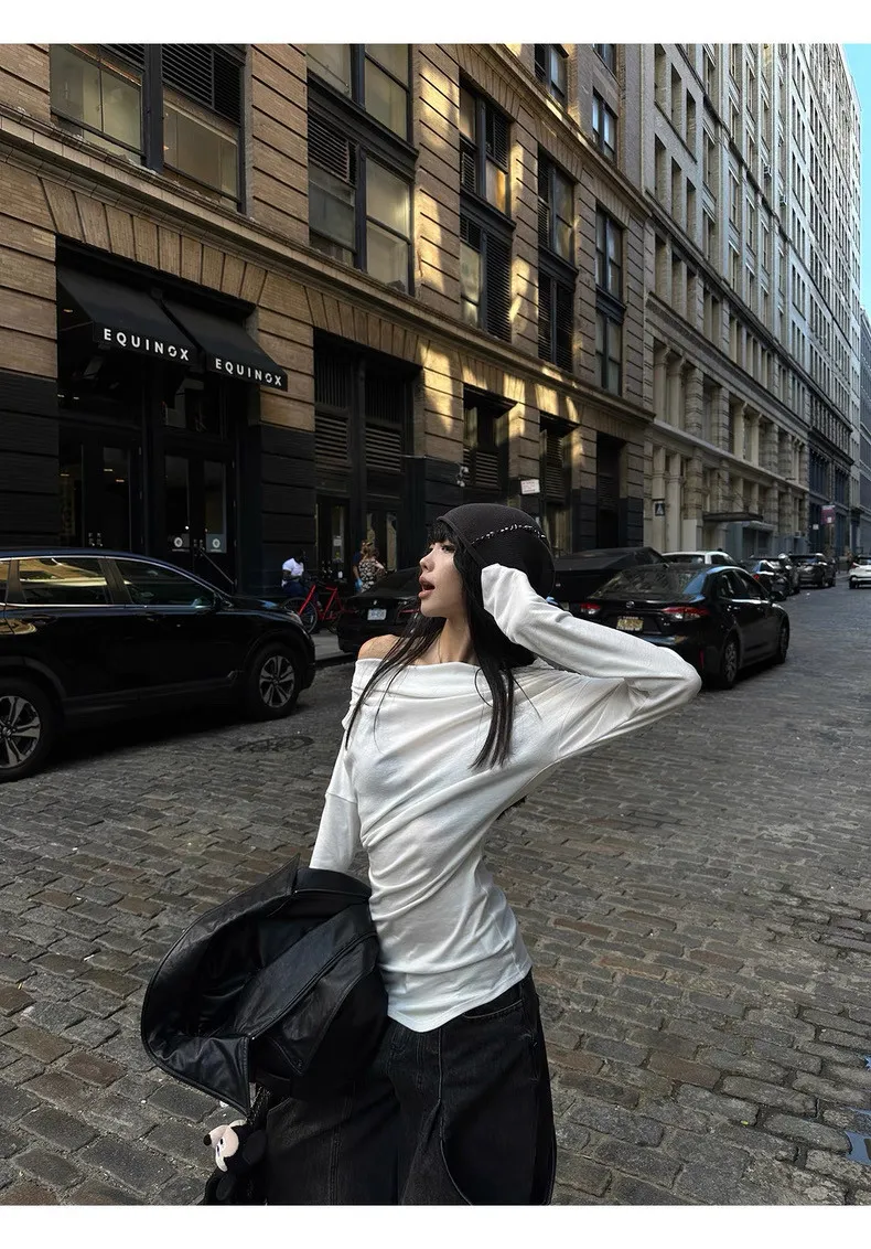 GIRLS 一字領 堆疊露肩 薄長袖(白色)