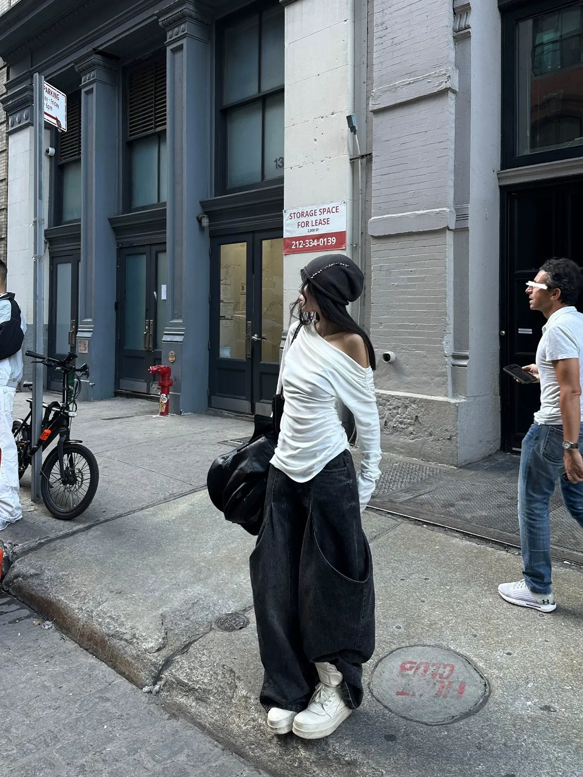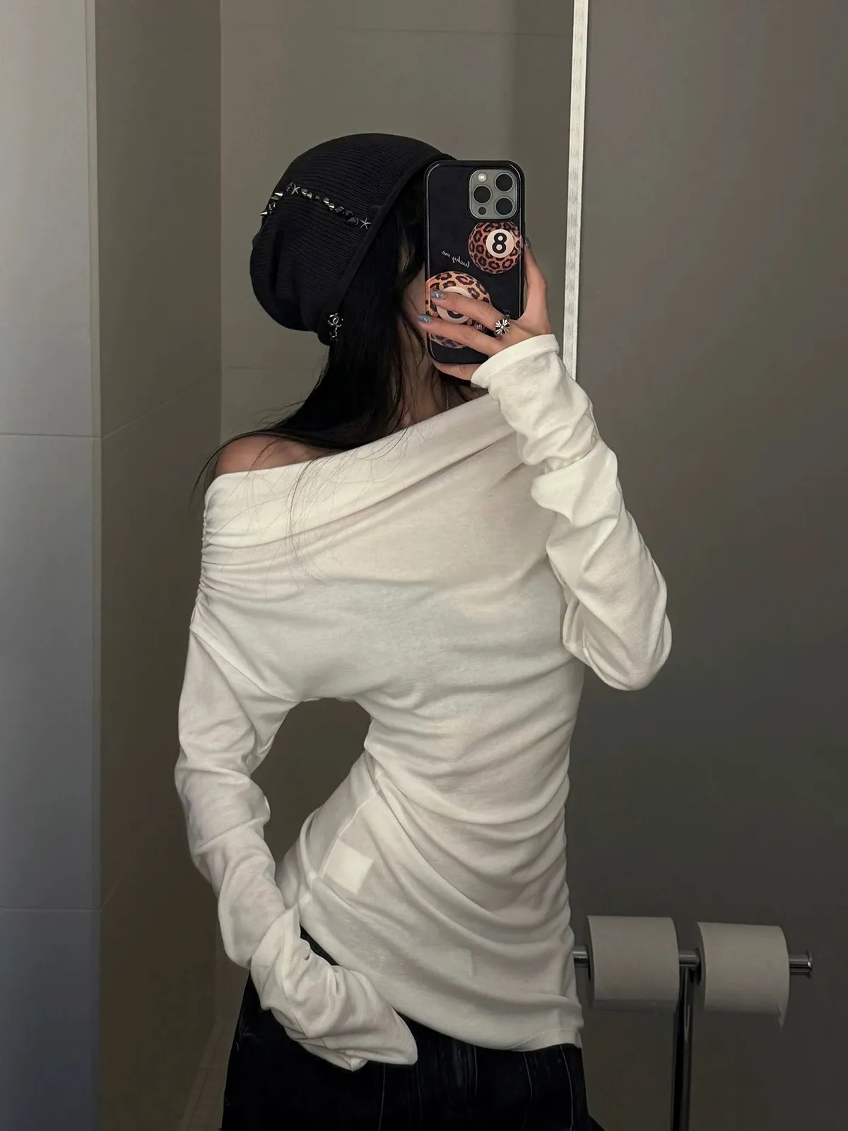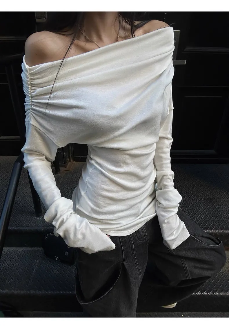 GIRLS 一字領 堆疊露肩 薄長袖(白色)