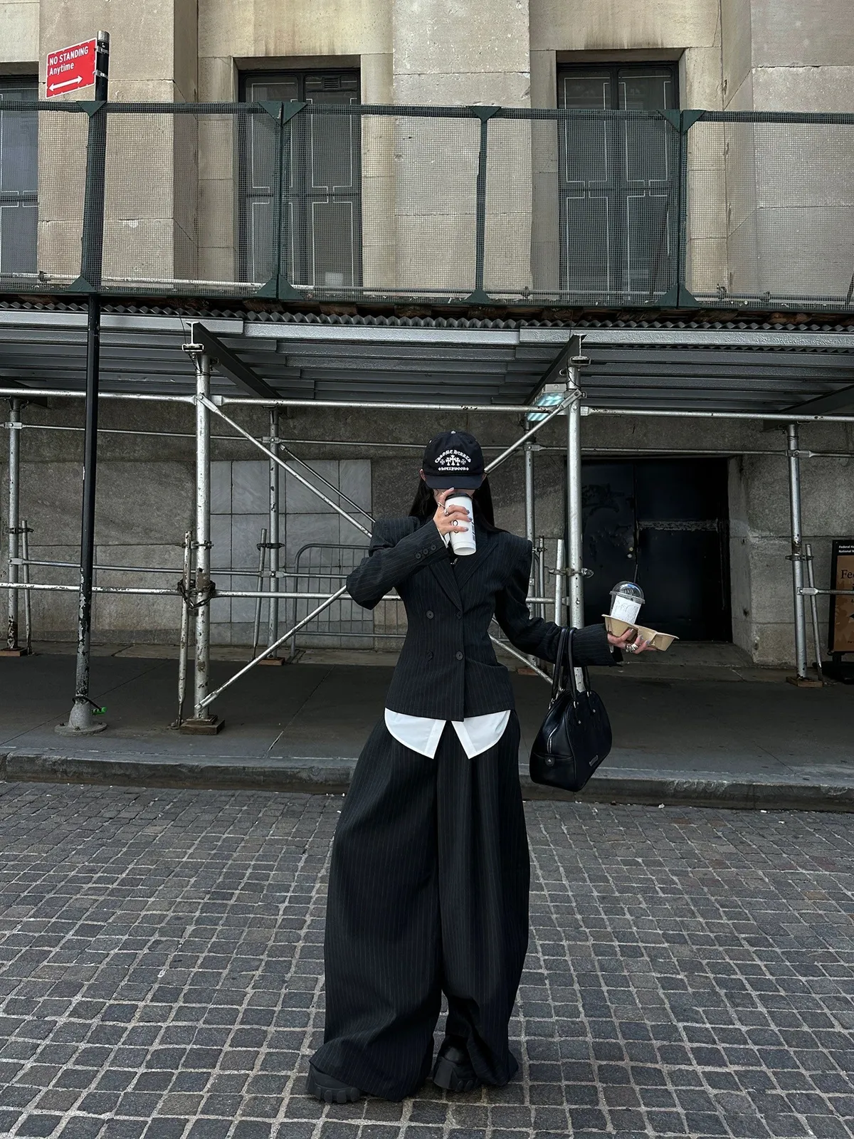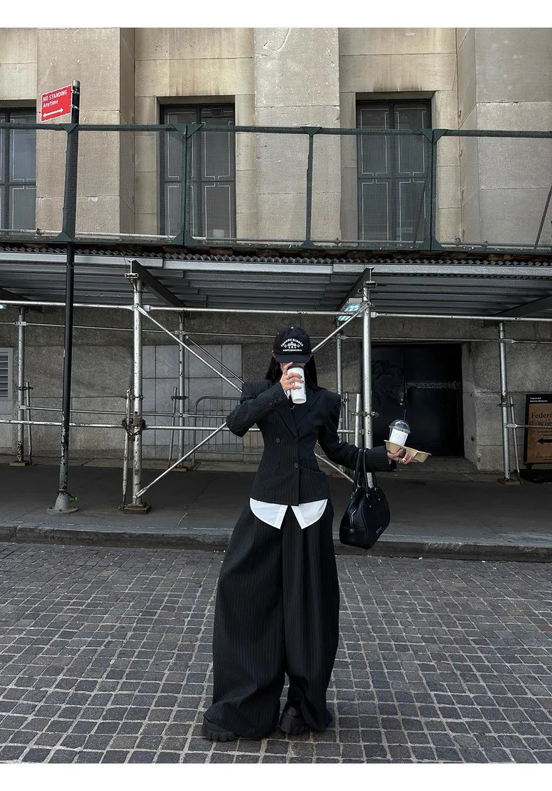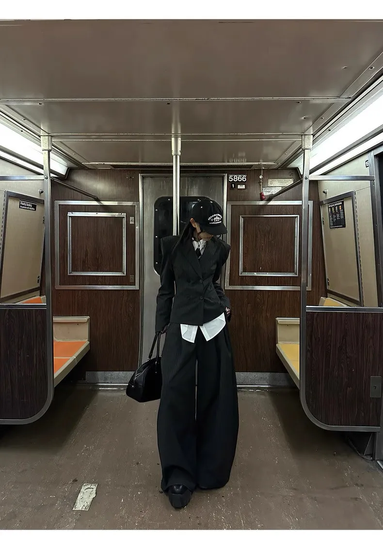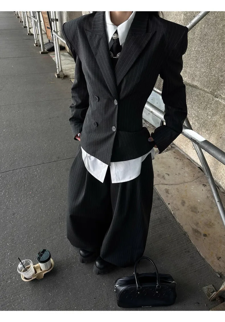 GIRLS 槍駁領 條紋 墊肩修身 西裝外套 襯衫(黑色)