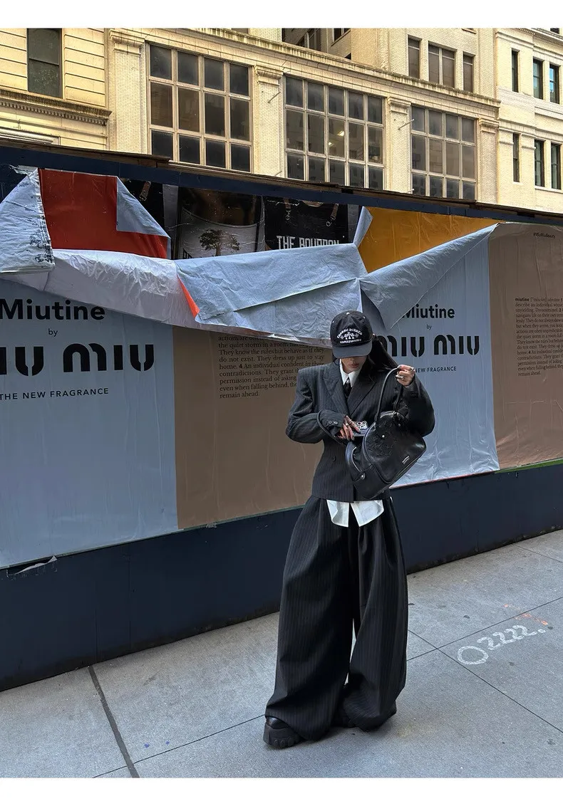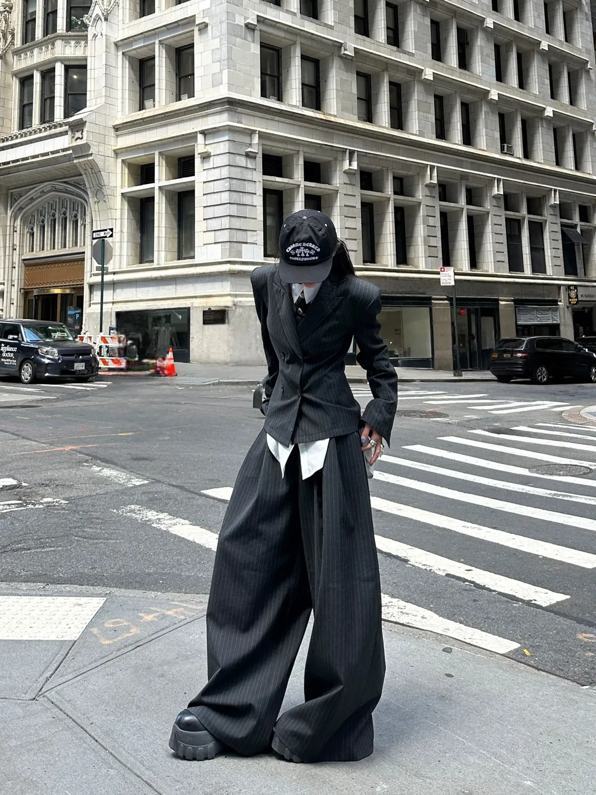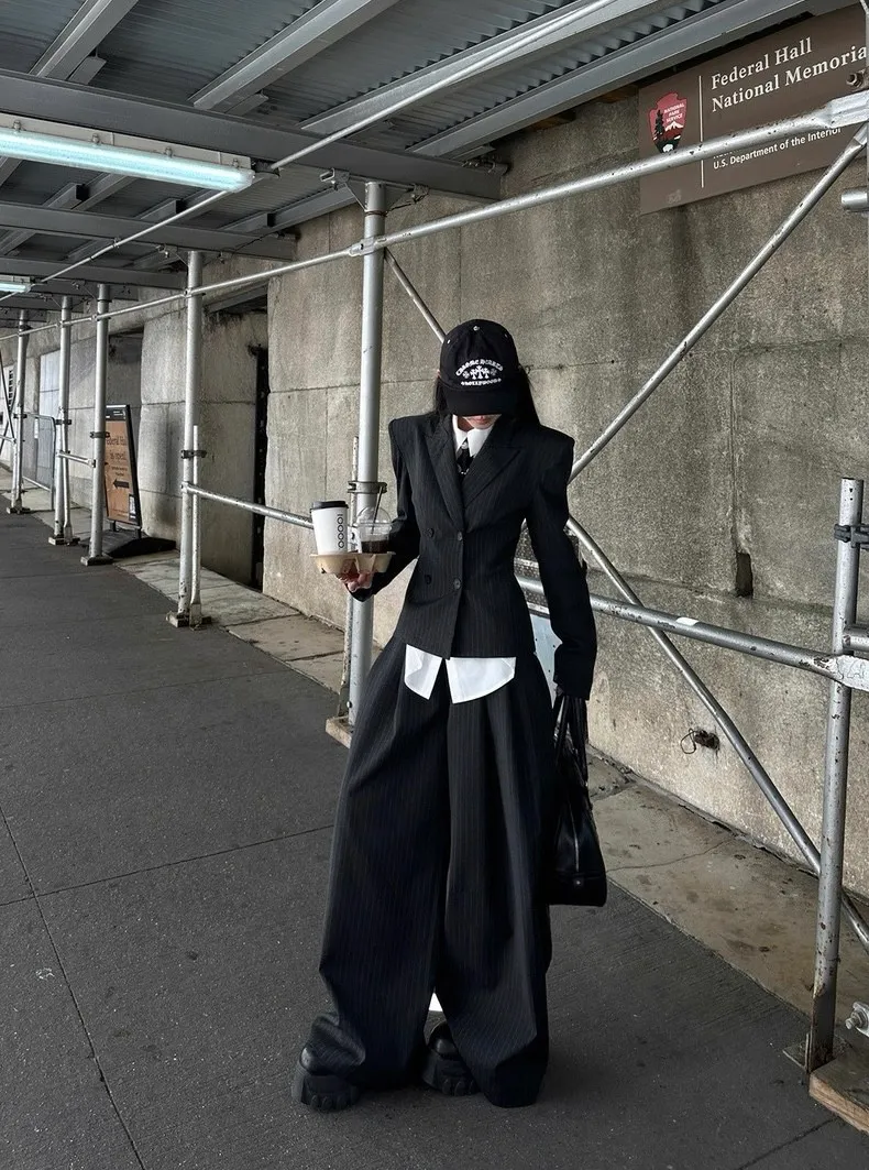 GIRLS 槍駁領 條紋 墊肩修身 西裝外套 襯衫(黑色)