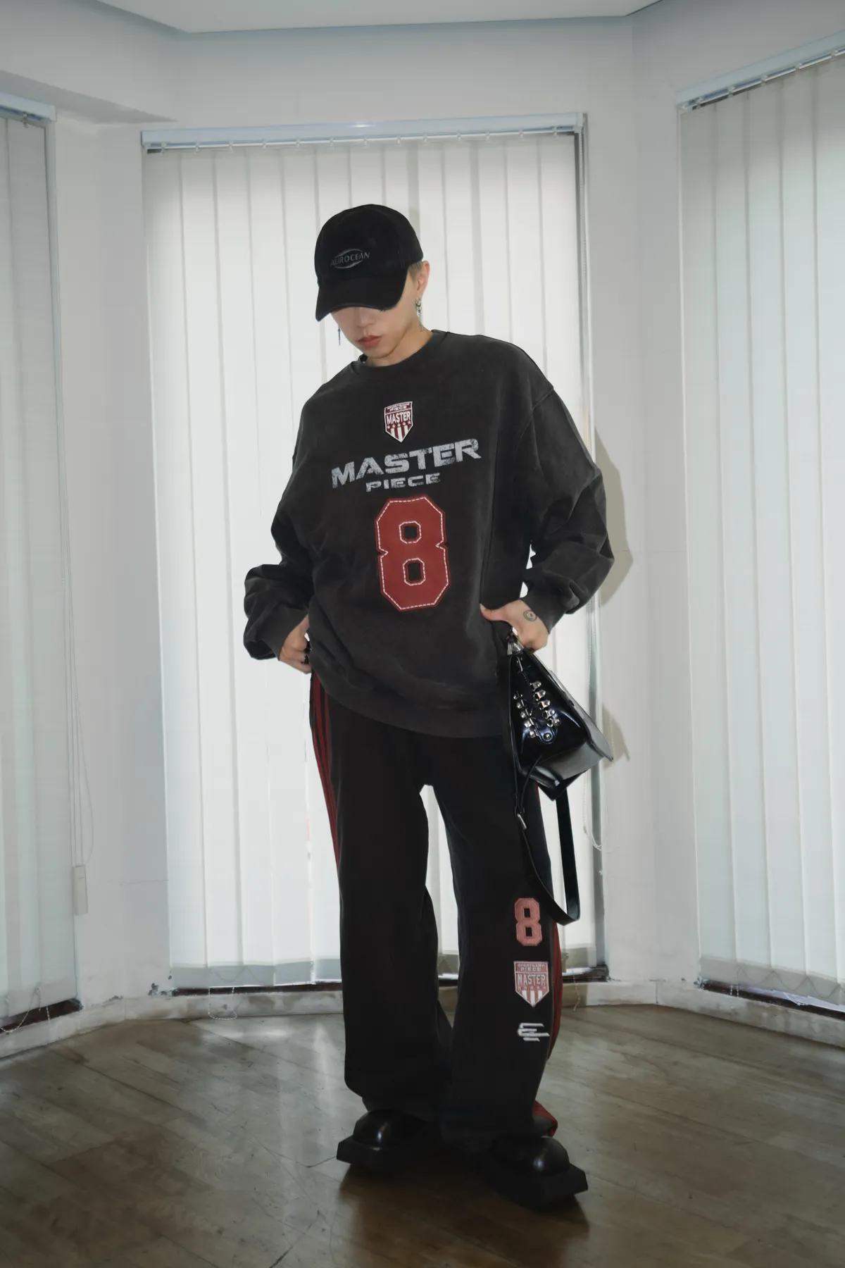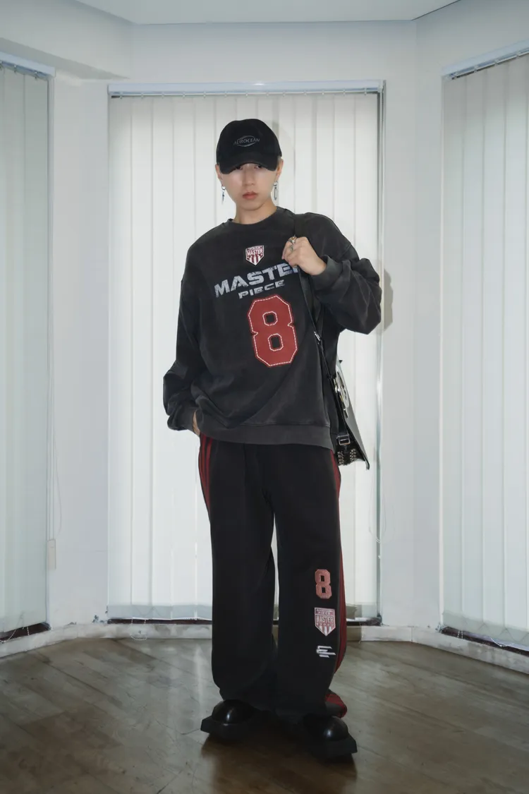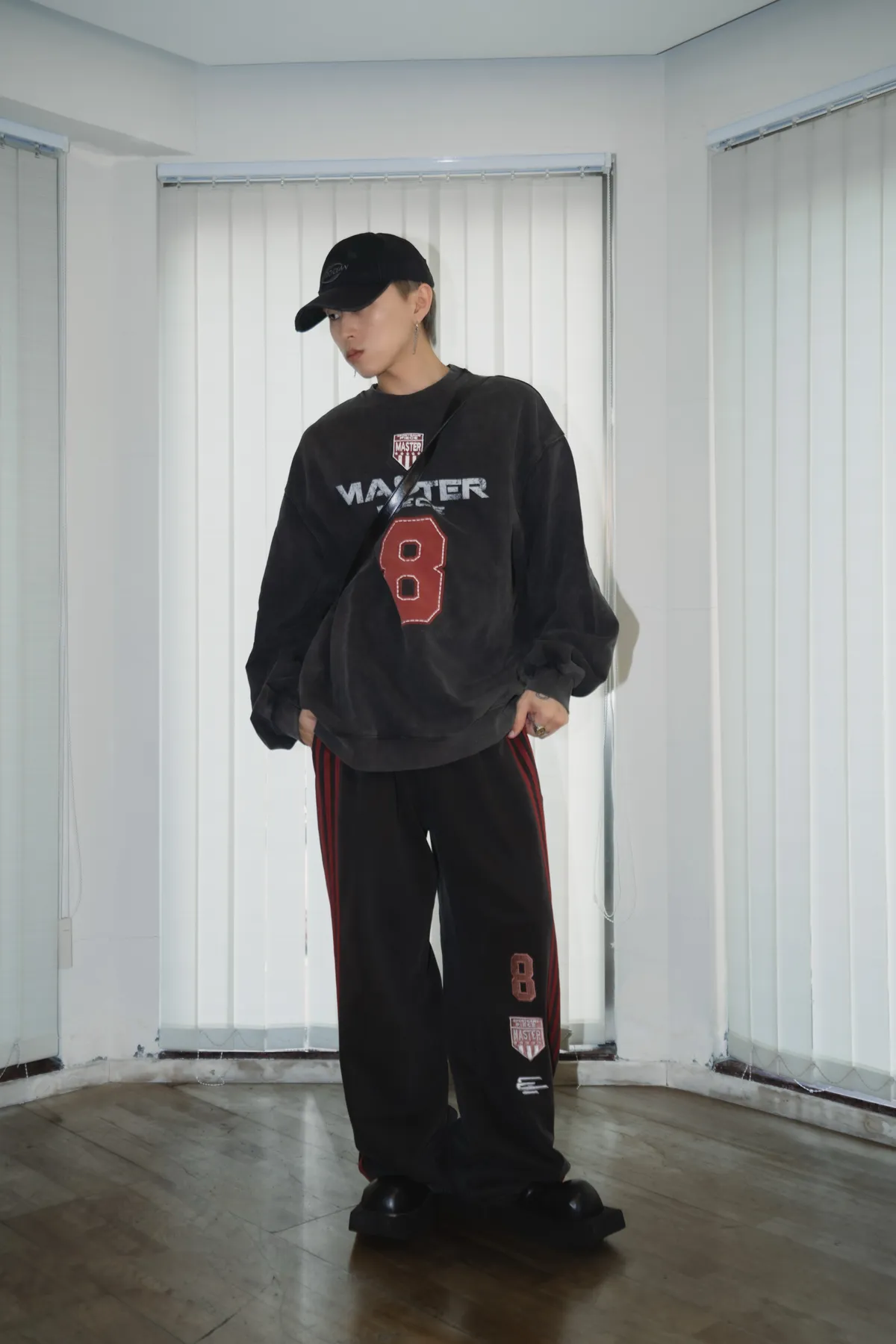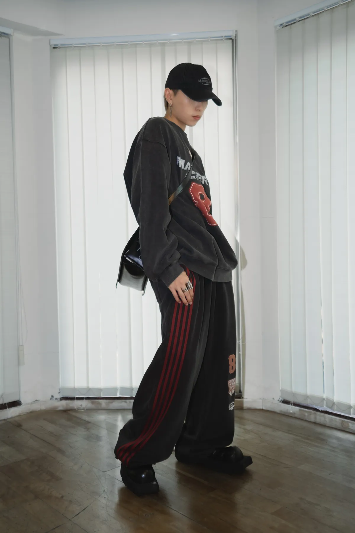 復古運動 水洗 刺繡布貼 大學踢 長褲 棉褲 套裝(水洗黑)