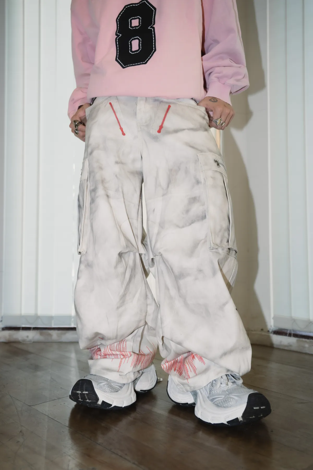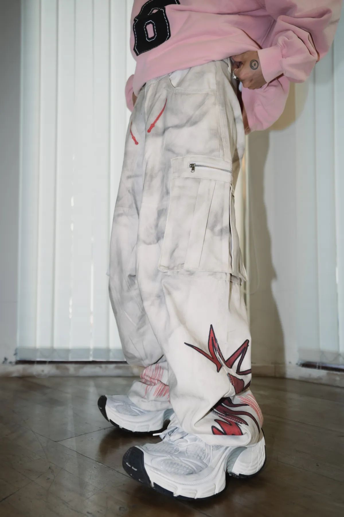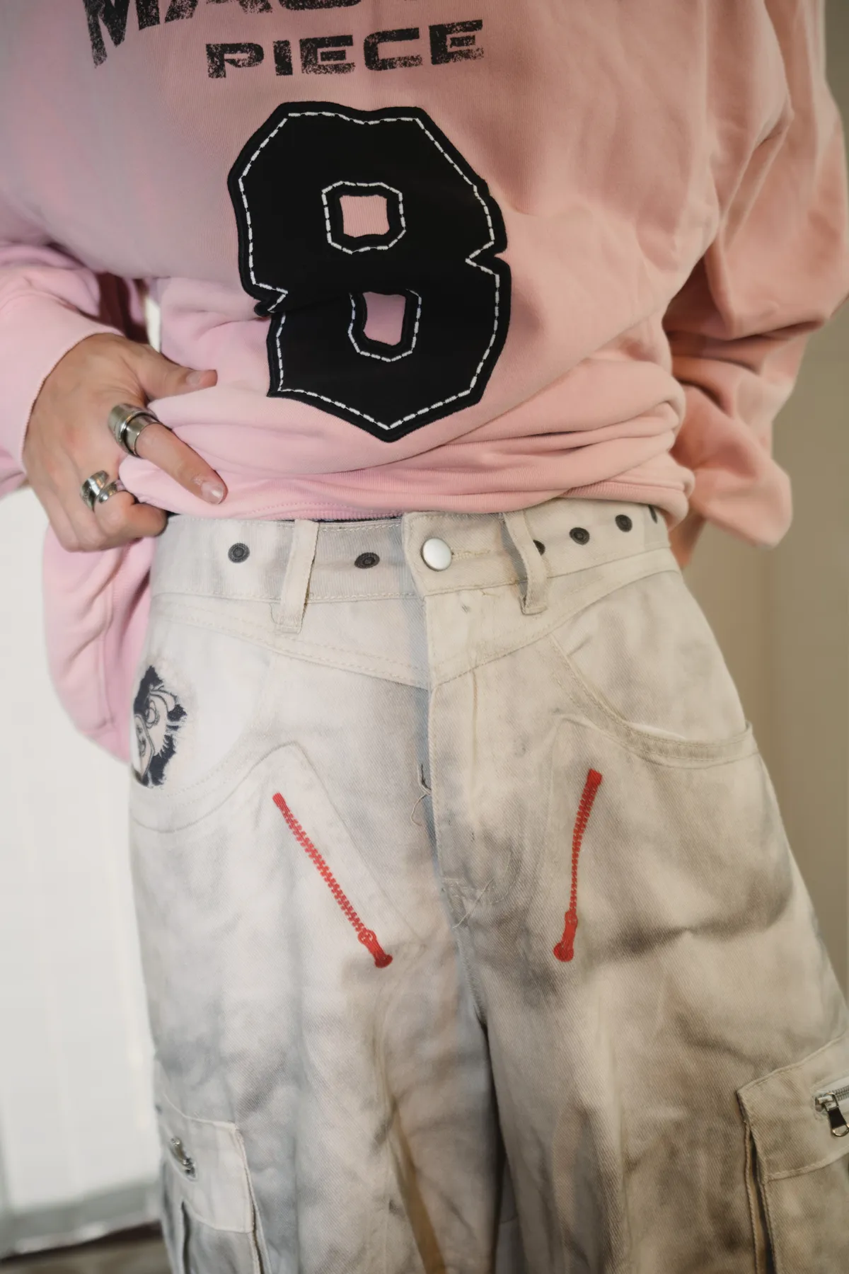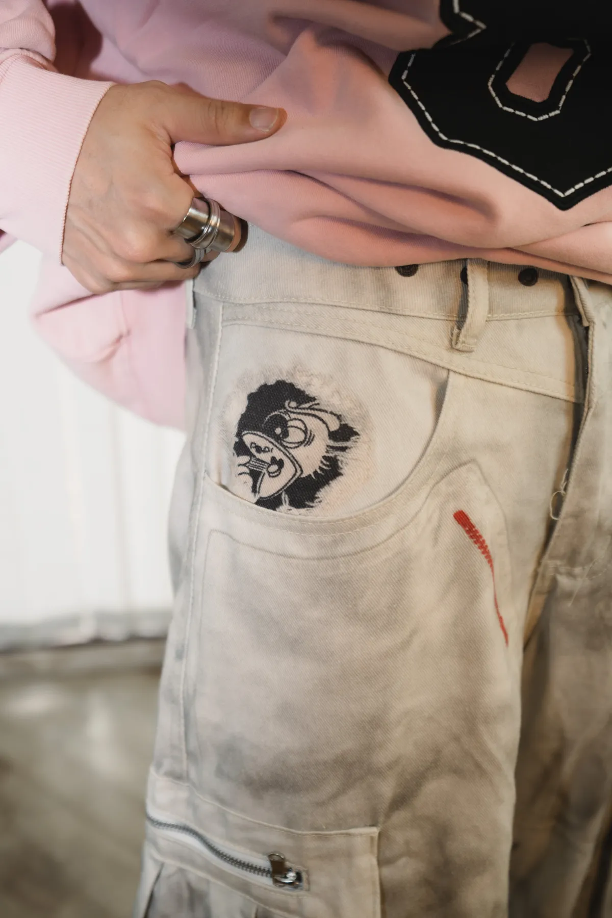 髒染塗鴉 大口袋 牛仔褲(髒染白)