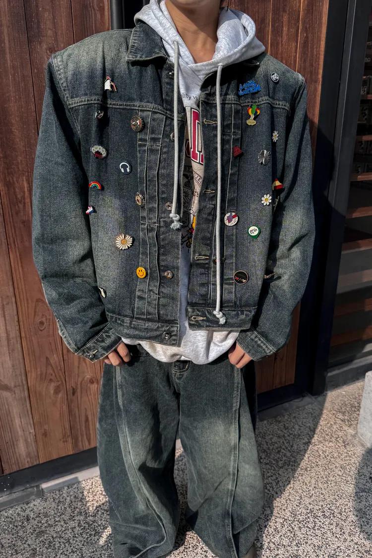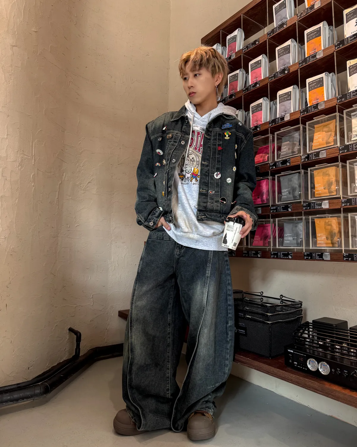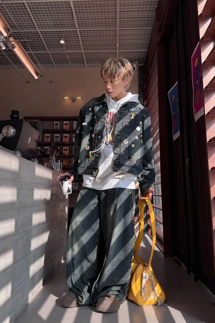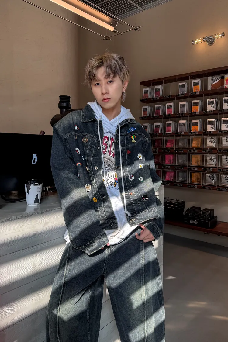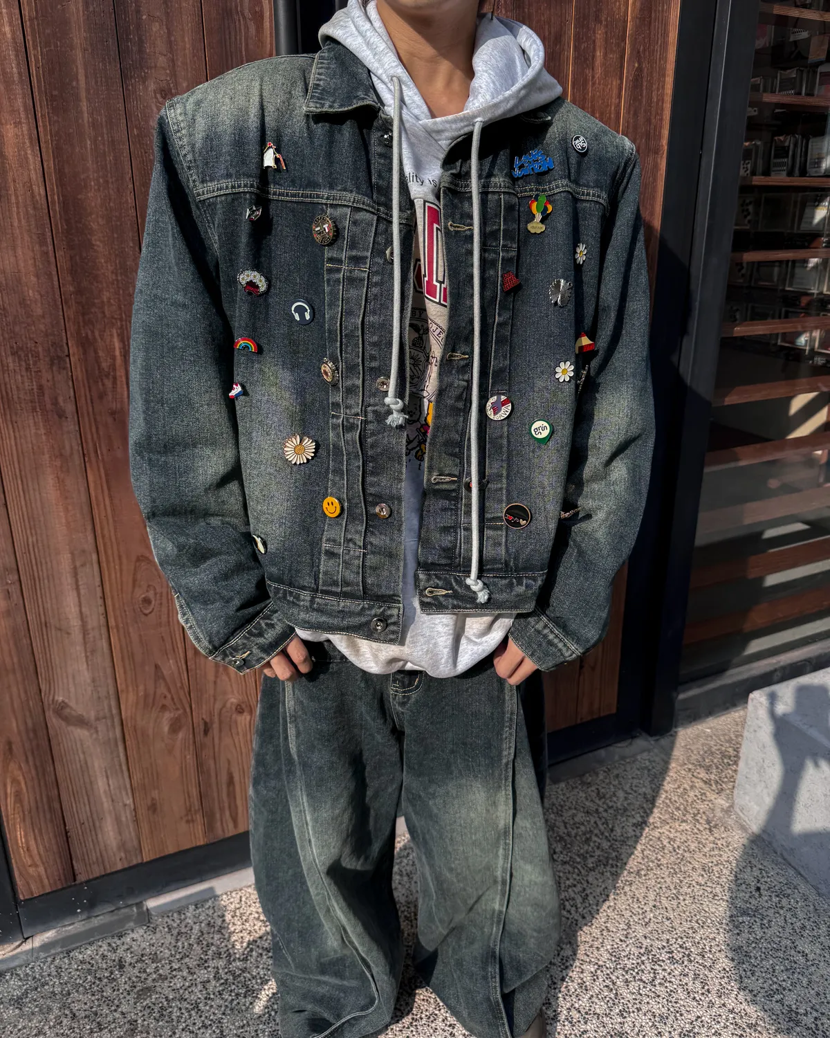 多重別針 寬短 牛仔外套 解構彎刀 牛仔褲 套裝(藍色)