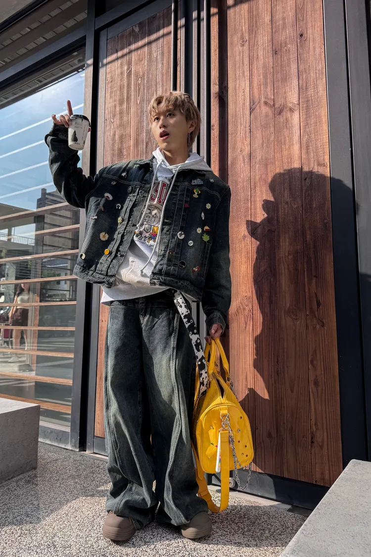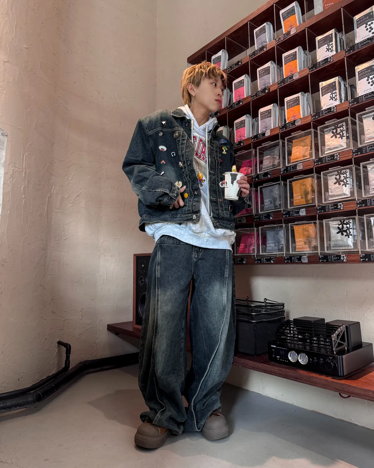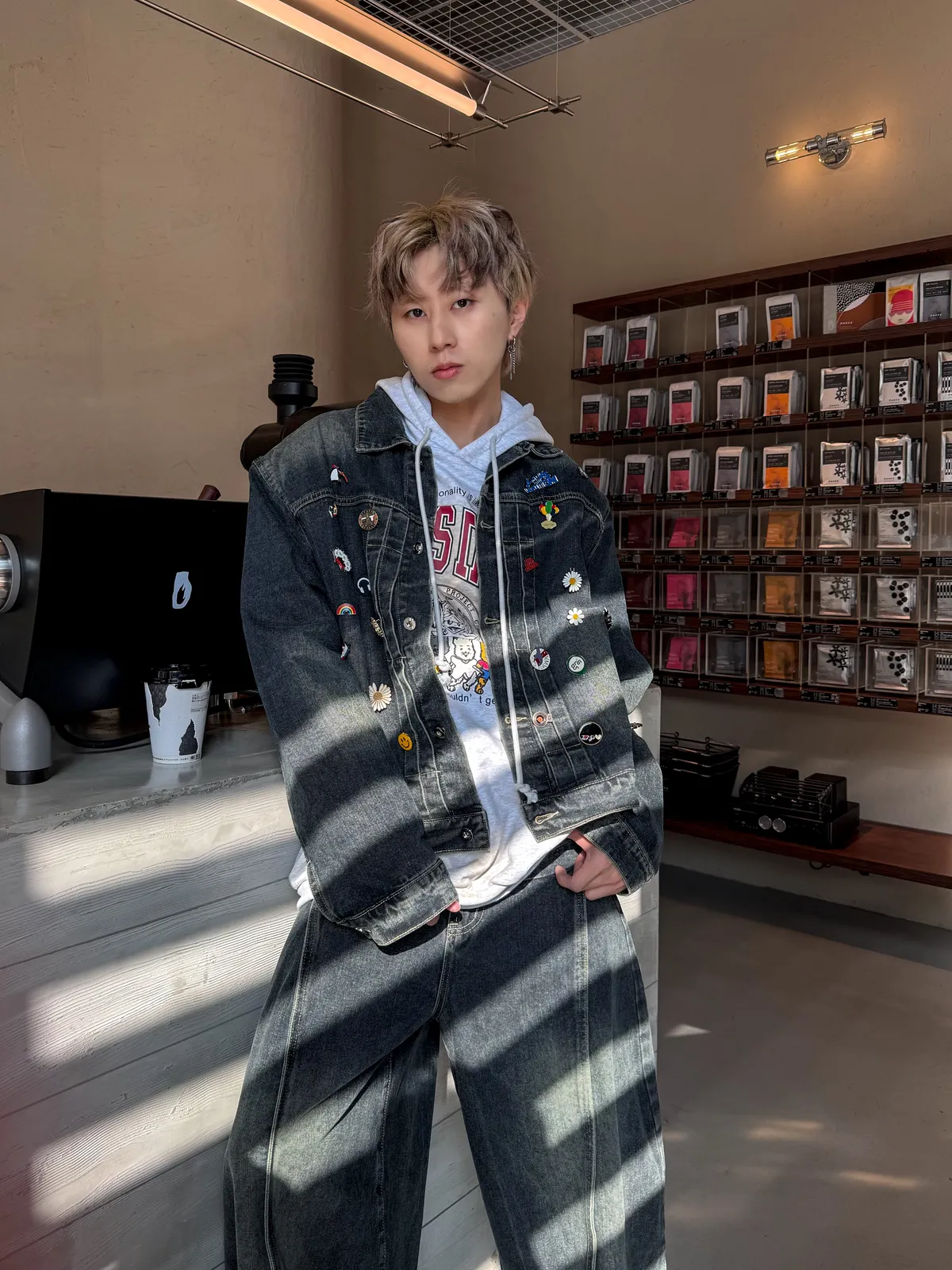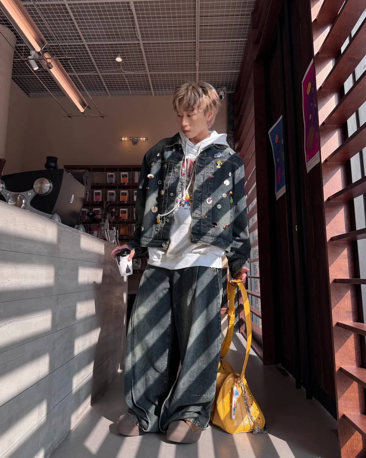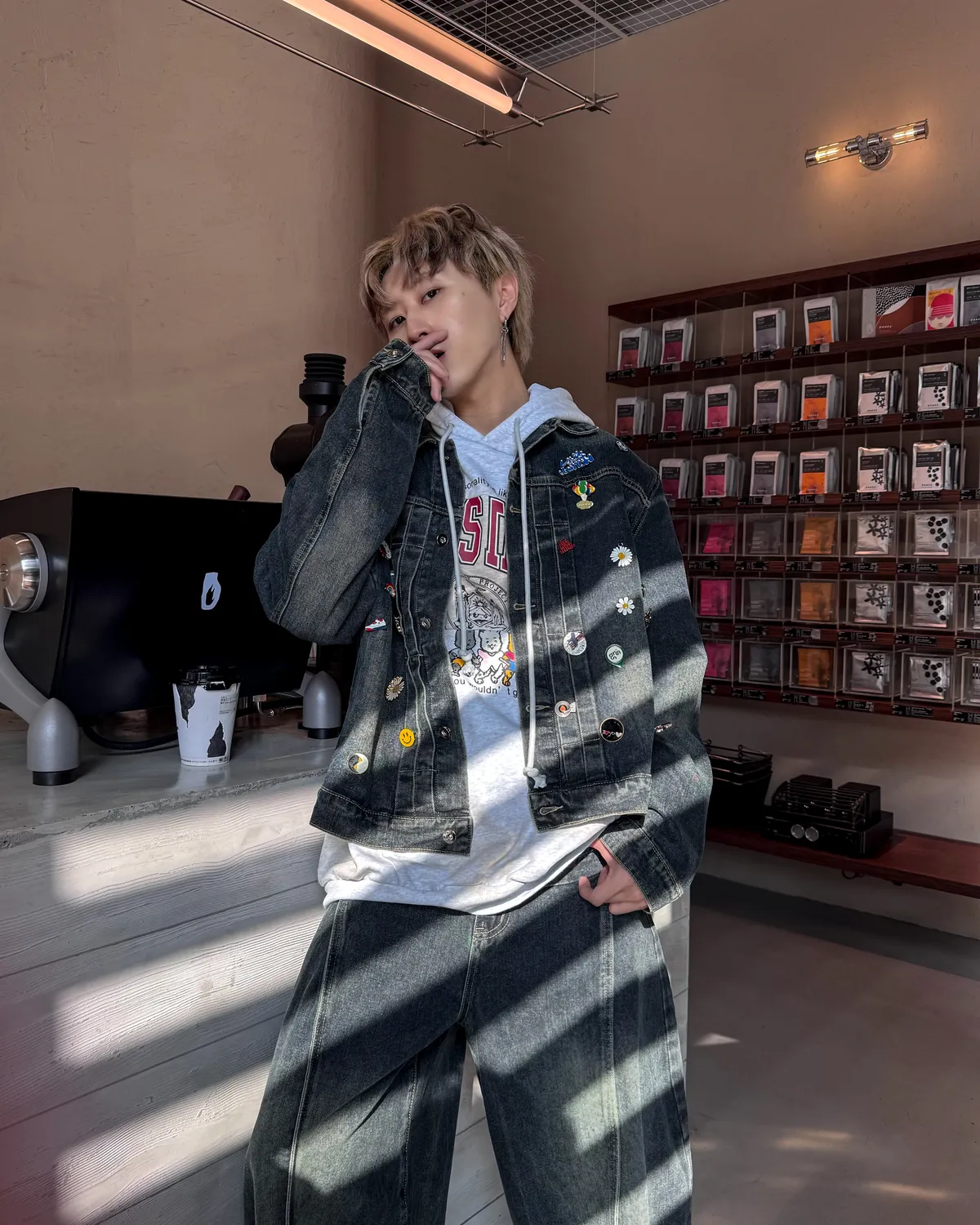 多重別針 寬短 牛仔外套 解構彎刀 牛仔褲 套裝(藍色)