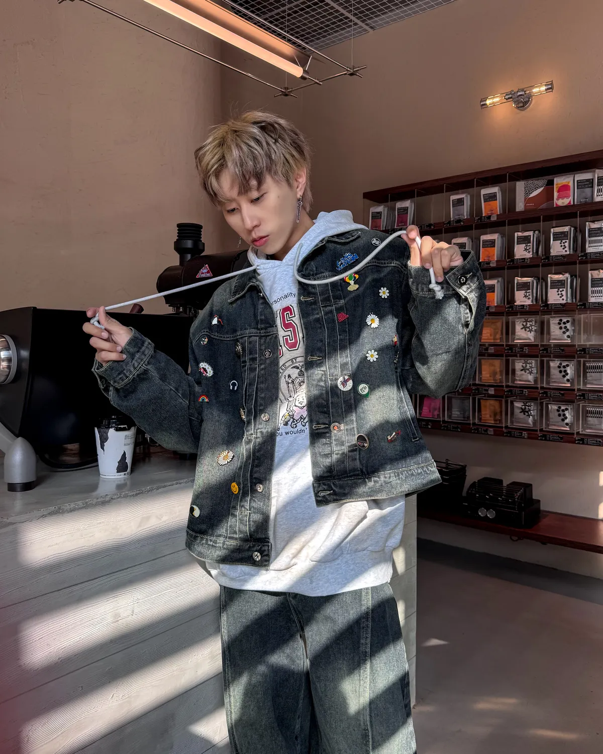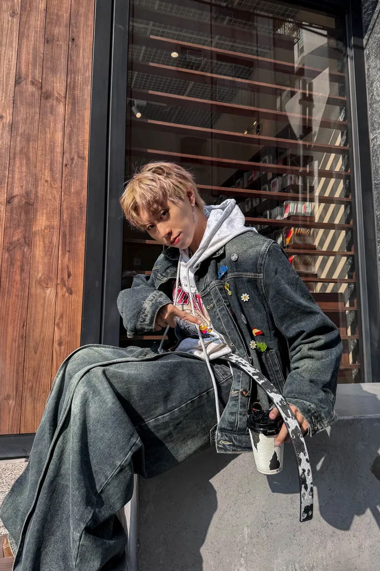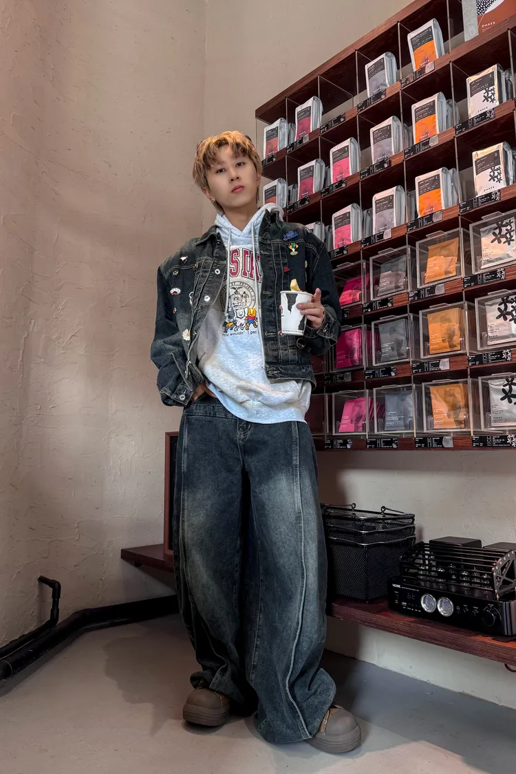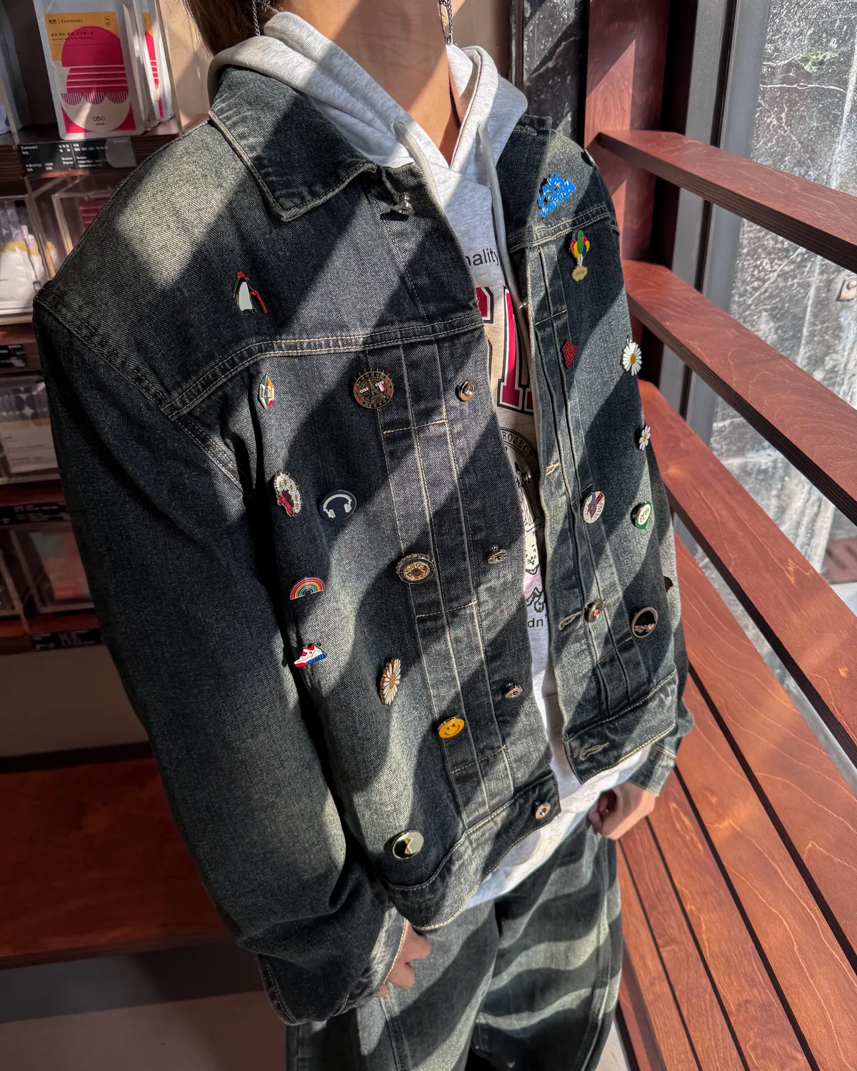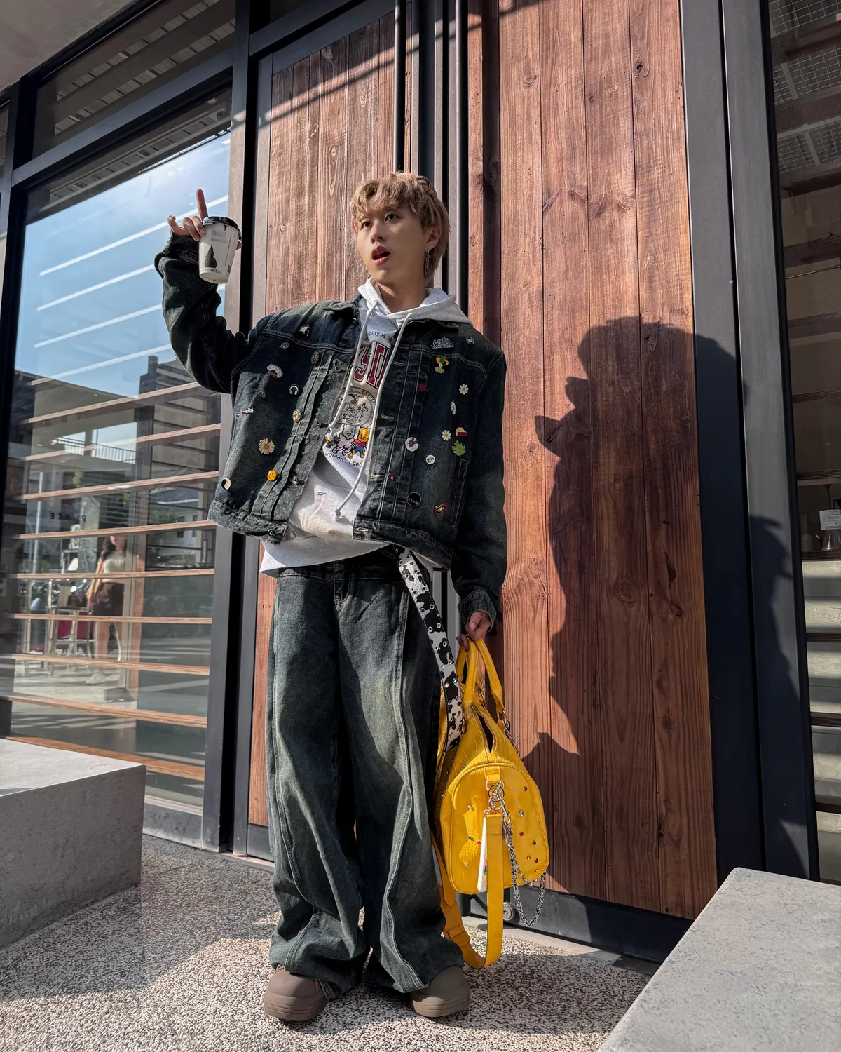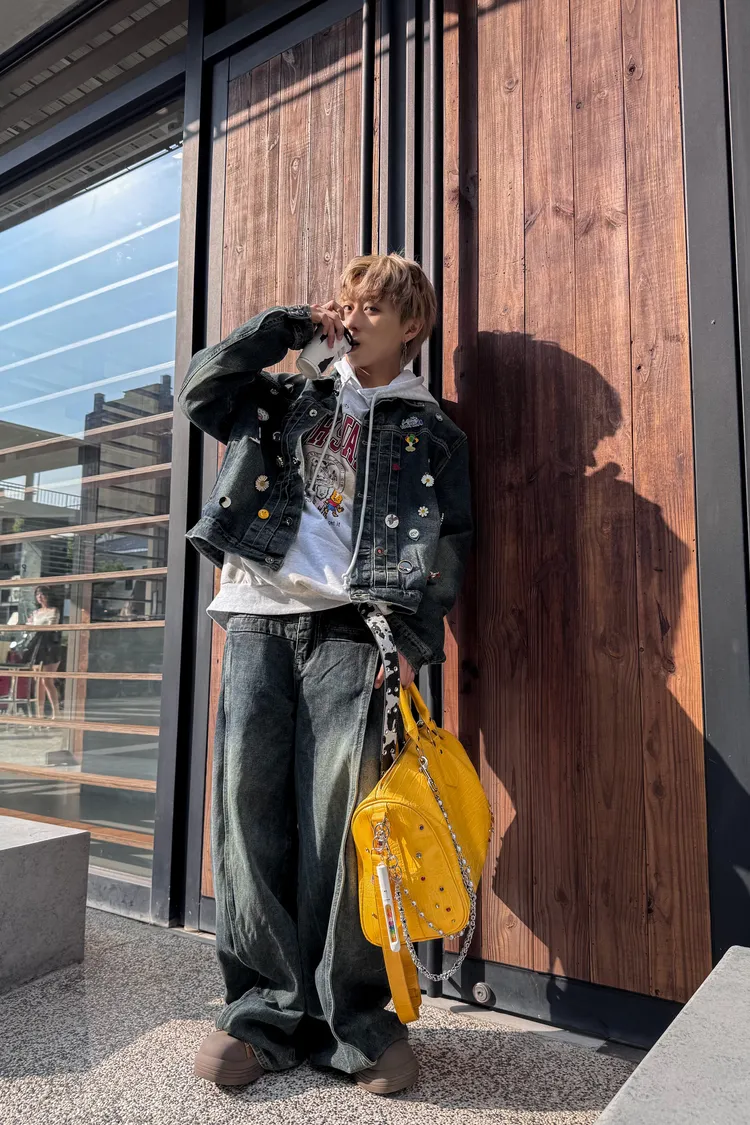 多重別針 寬短 牛仔外套 解構彎刀 牛仔褲 套裝(藍色)