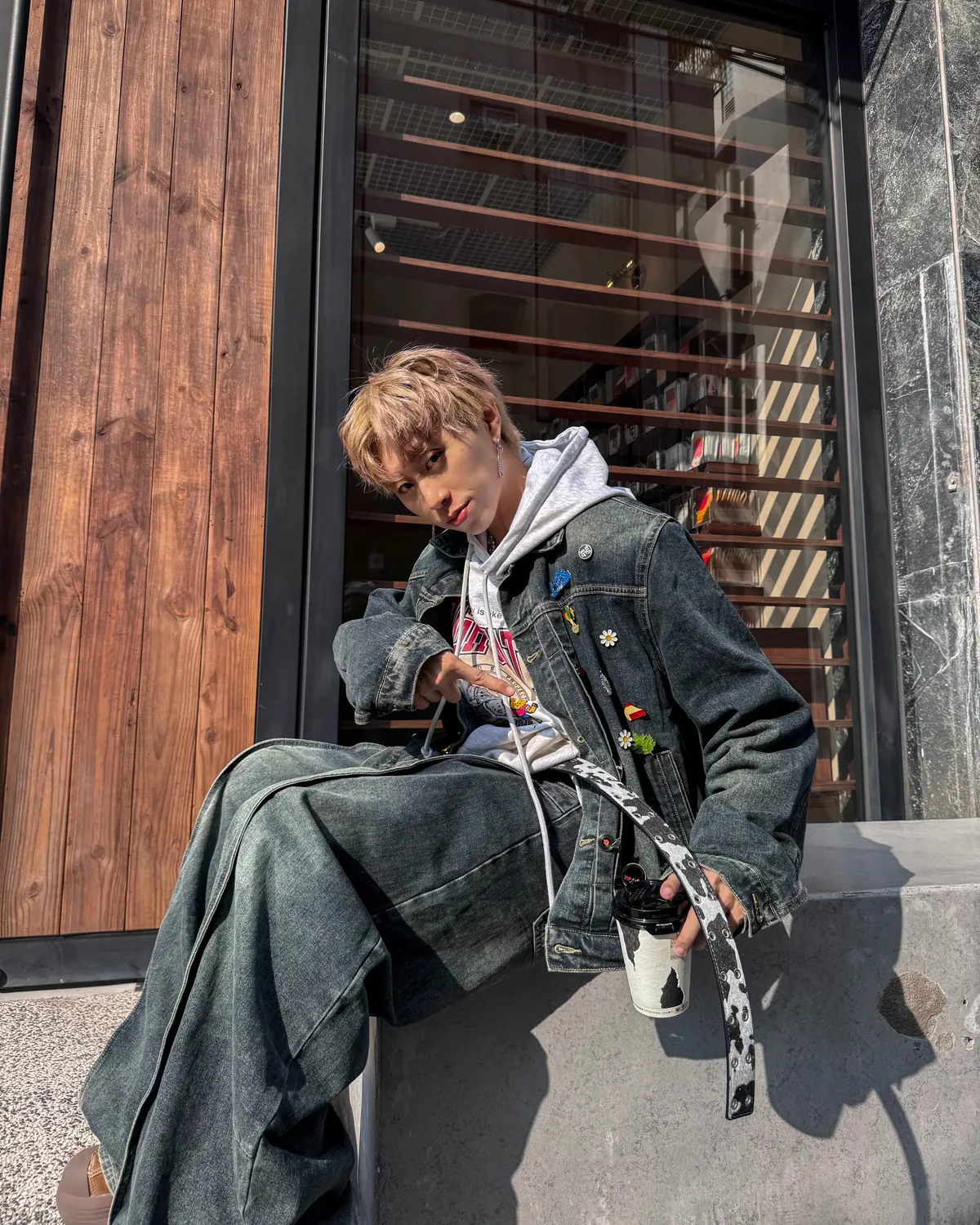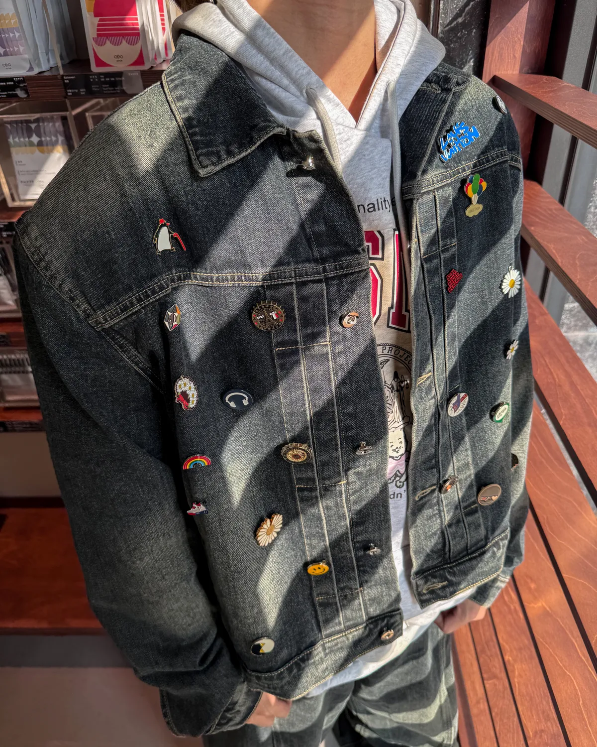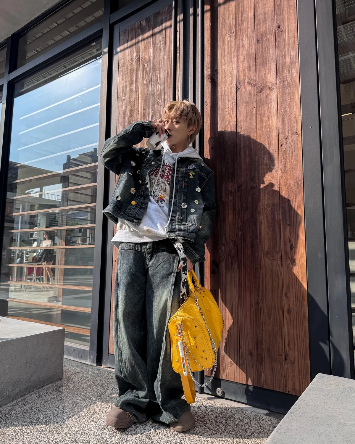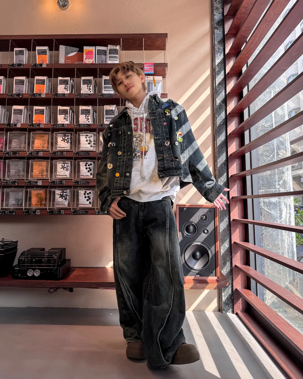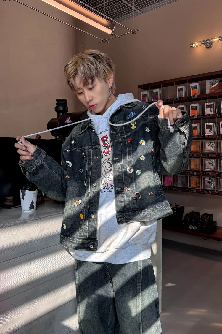 多重別針 寬短 牛仔外套 解構彎刀 牛仔褲 套裝(藍色)