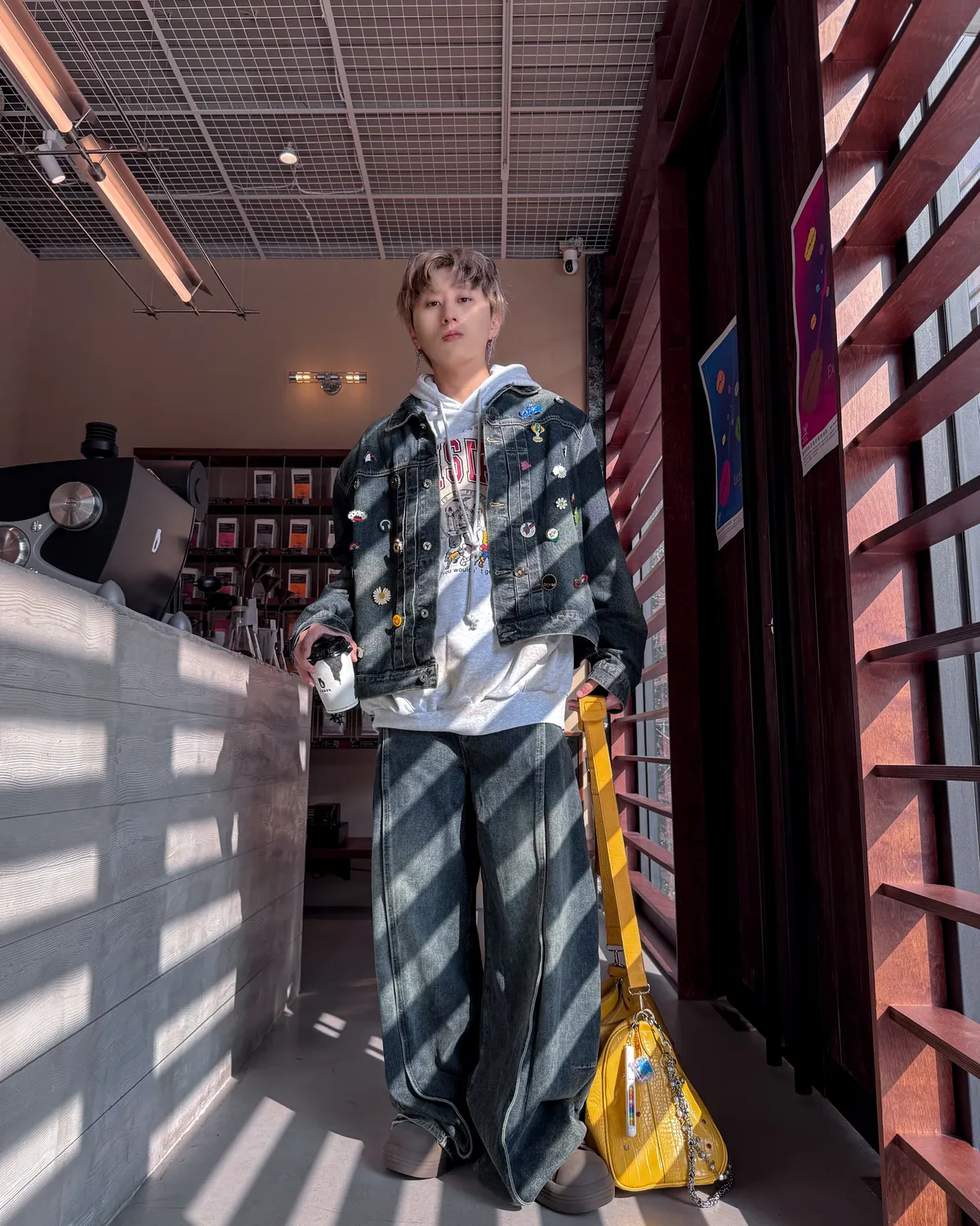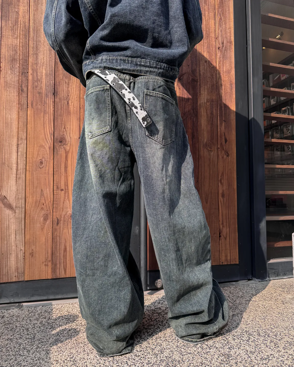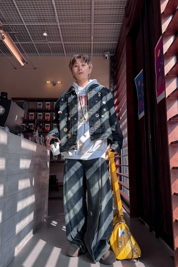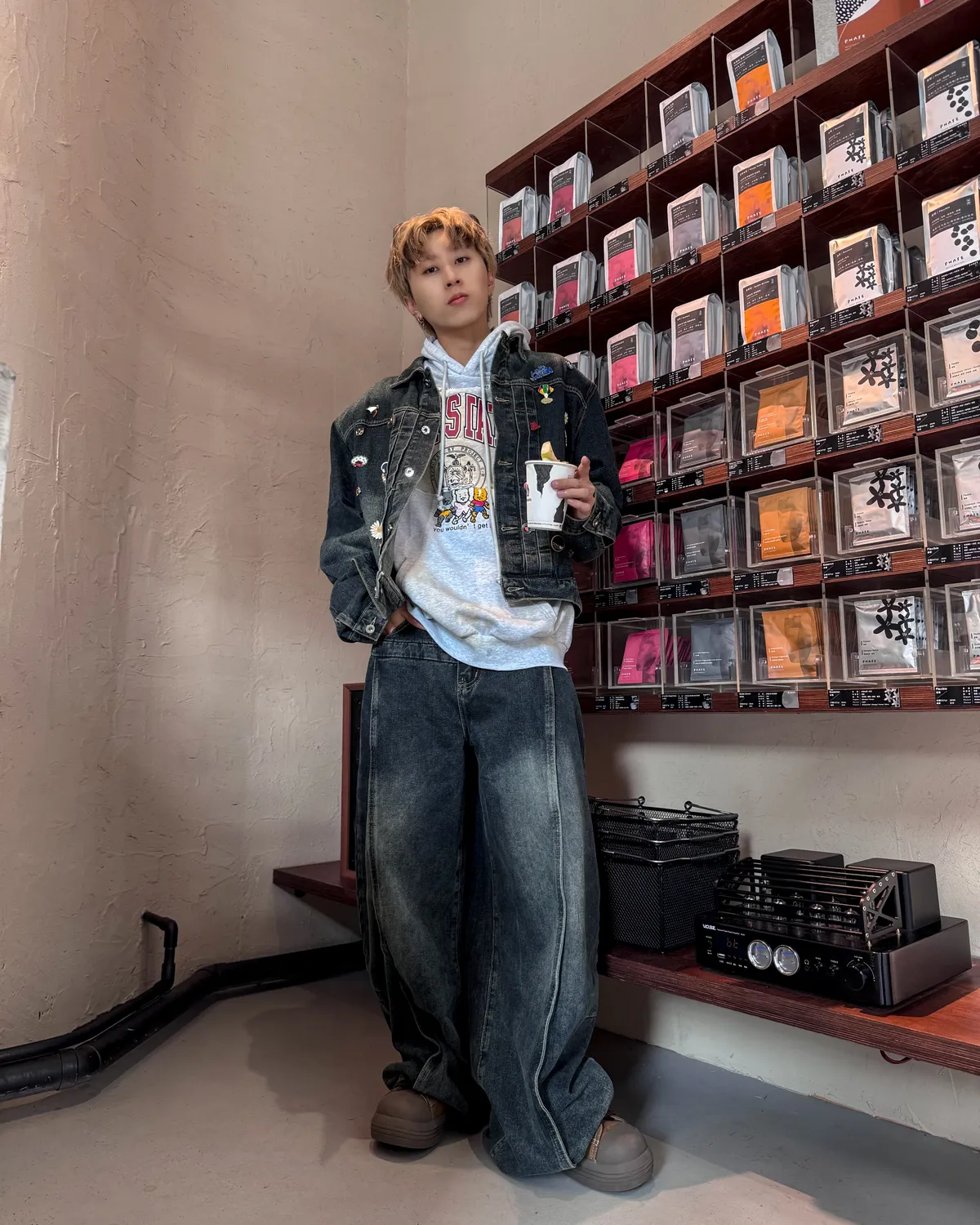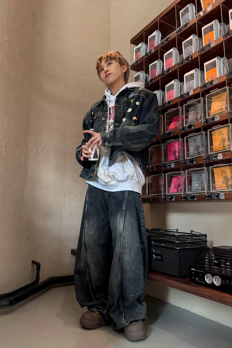 多重別針 寬短 牛仔外套 解構彎刀 牛仔褲 套裝(藍色)