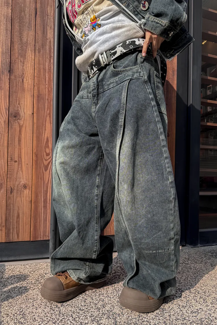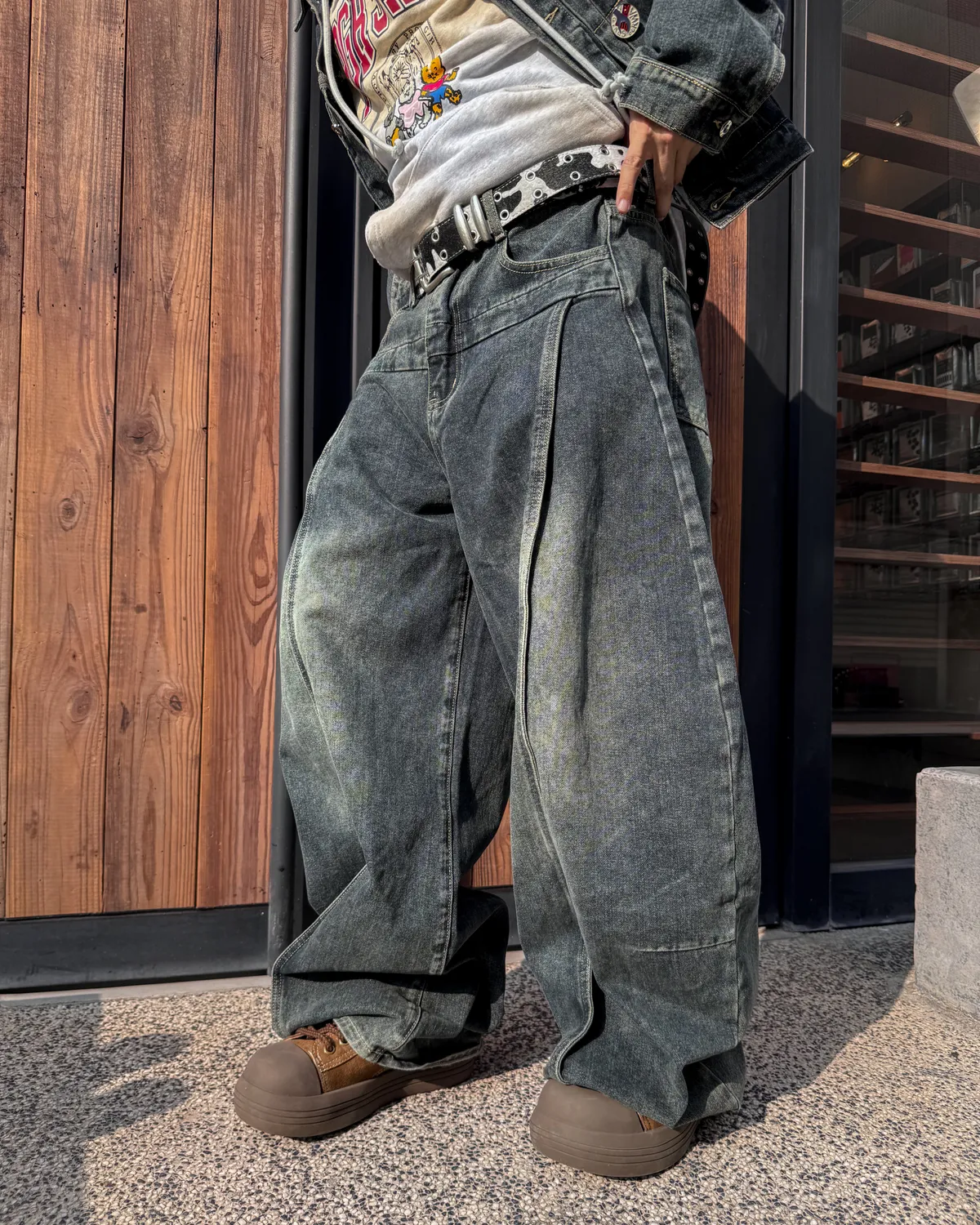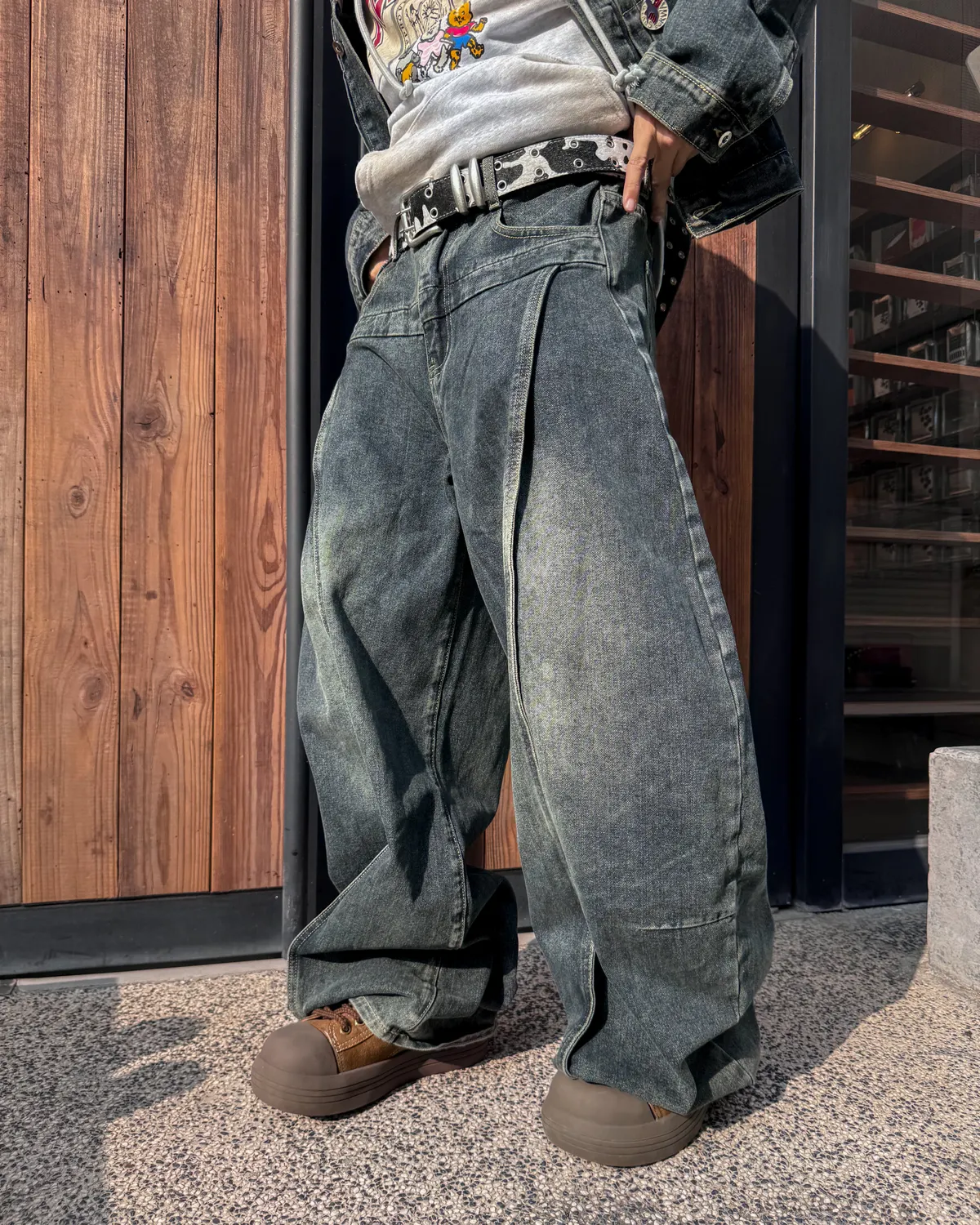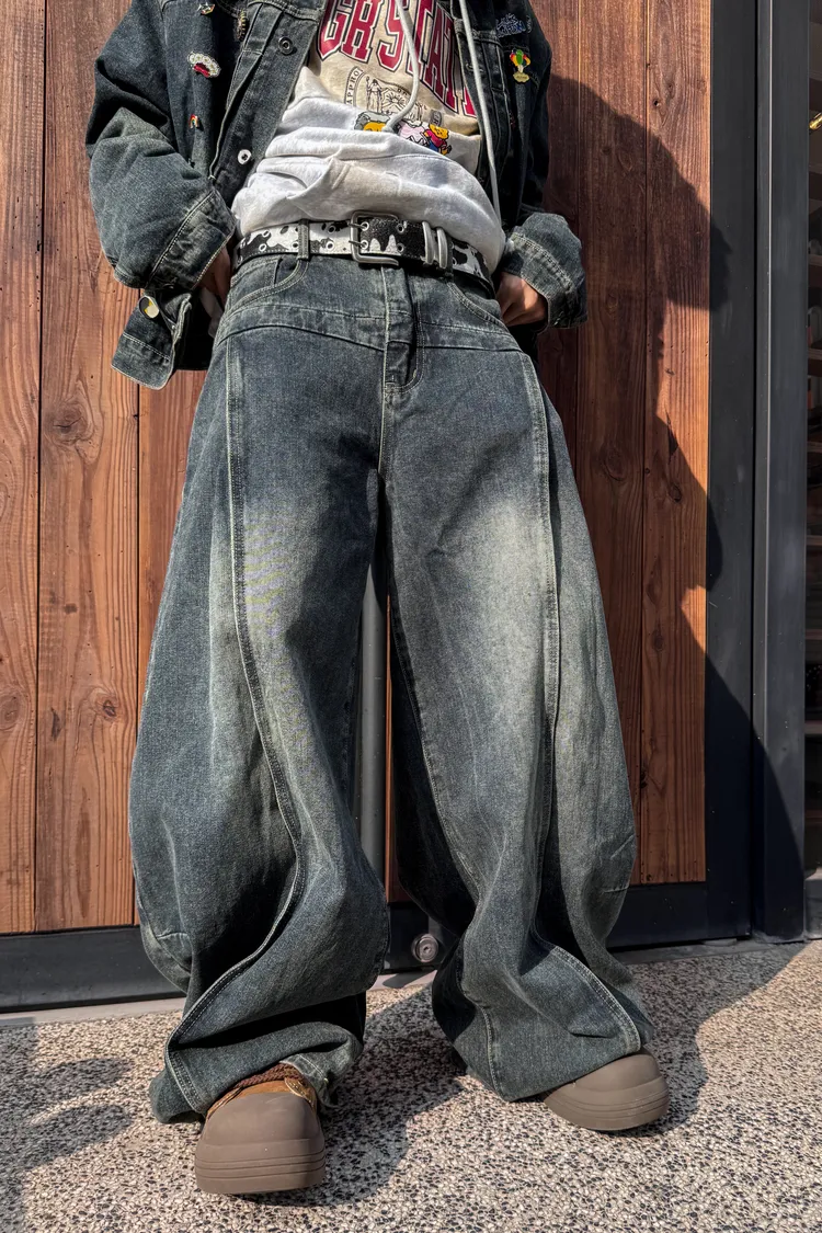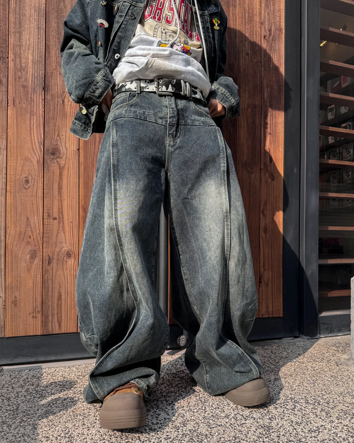 多重別針 寬短 牛仔外套 解構彎刀 牛仔褲 套裝(藍色)