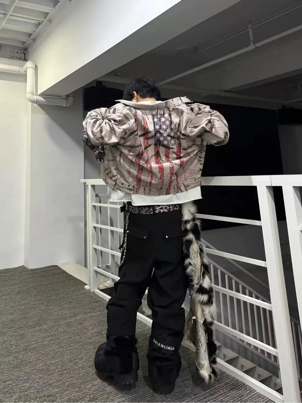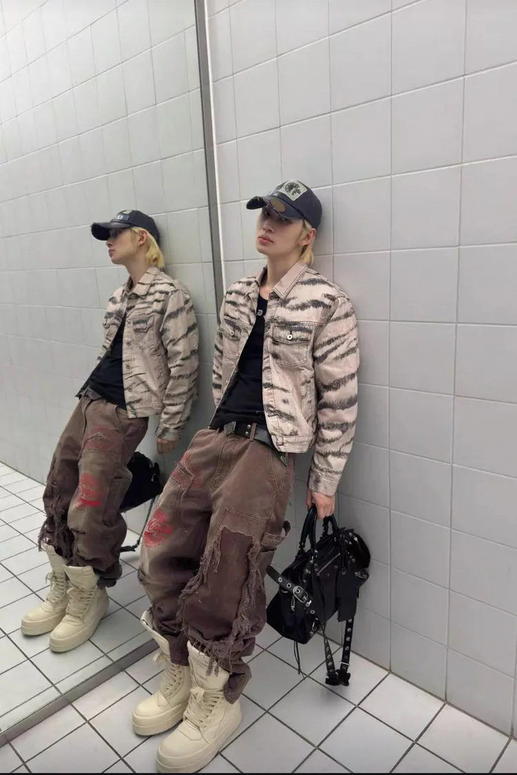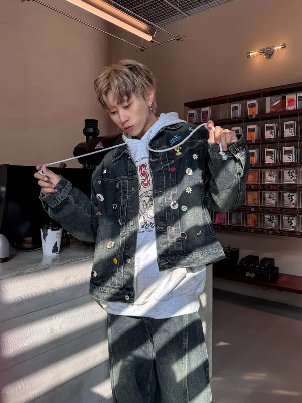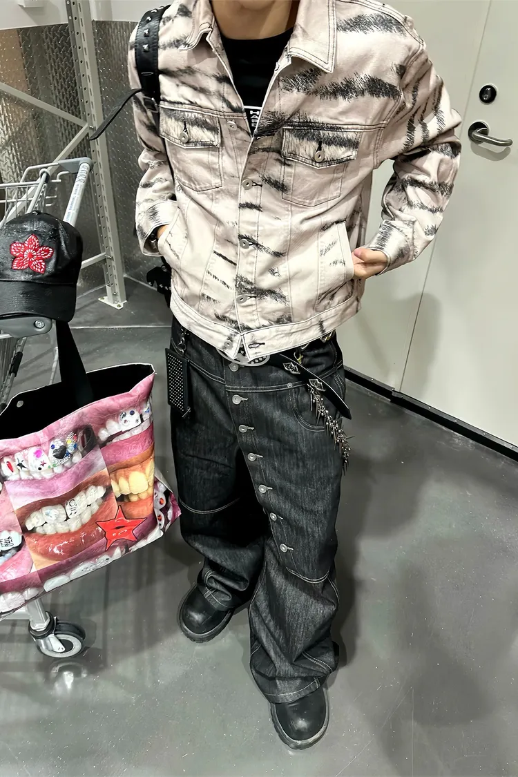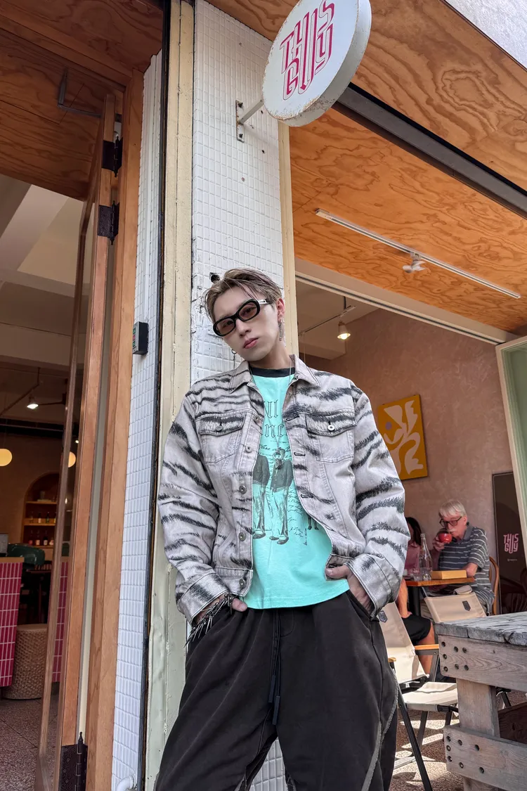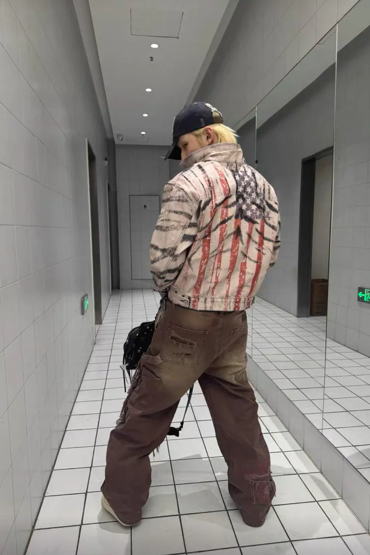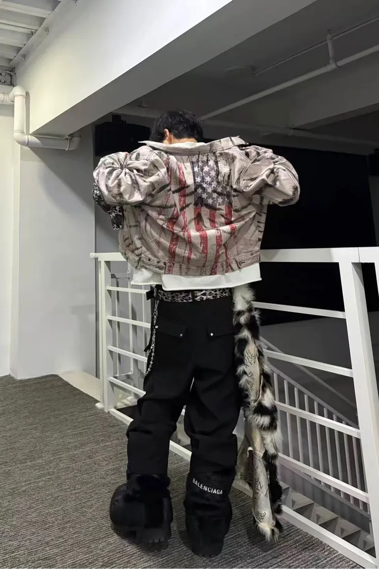虎紋國旗 寬短水洗 牛仔外套(卡其)