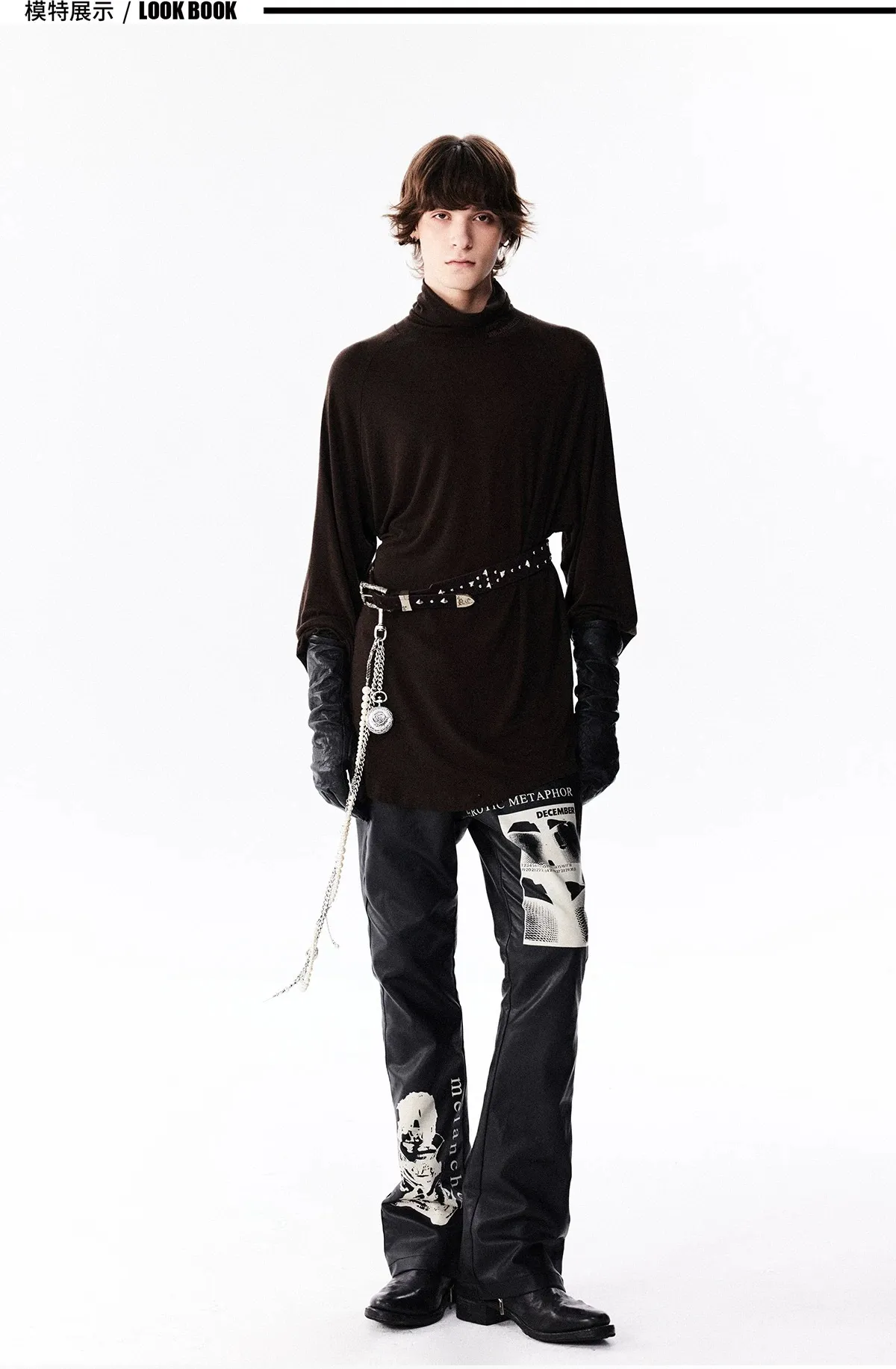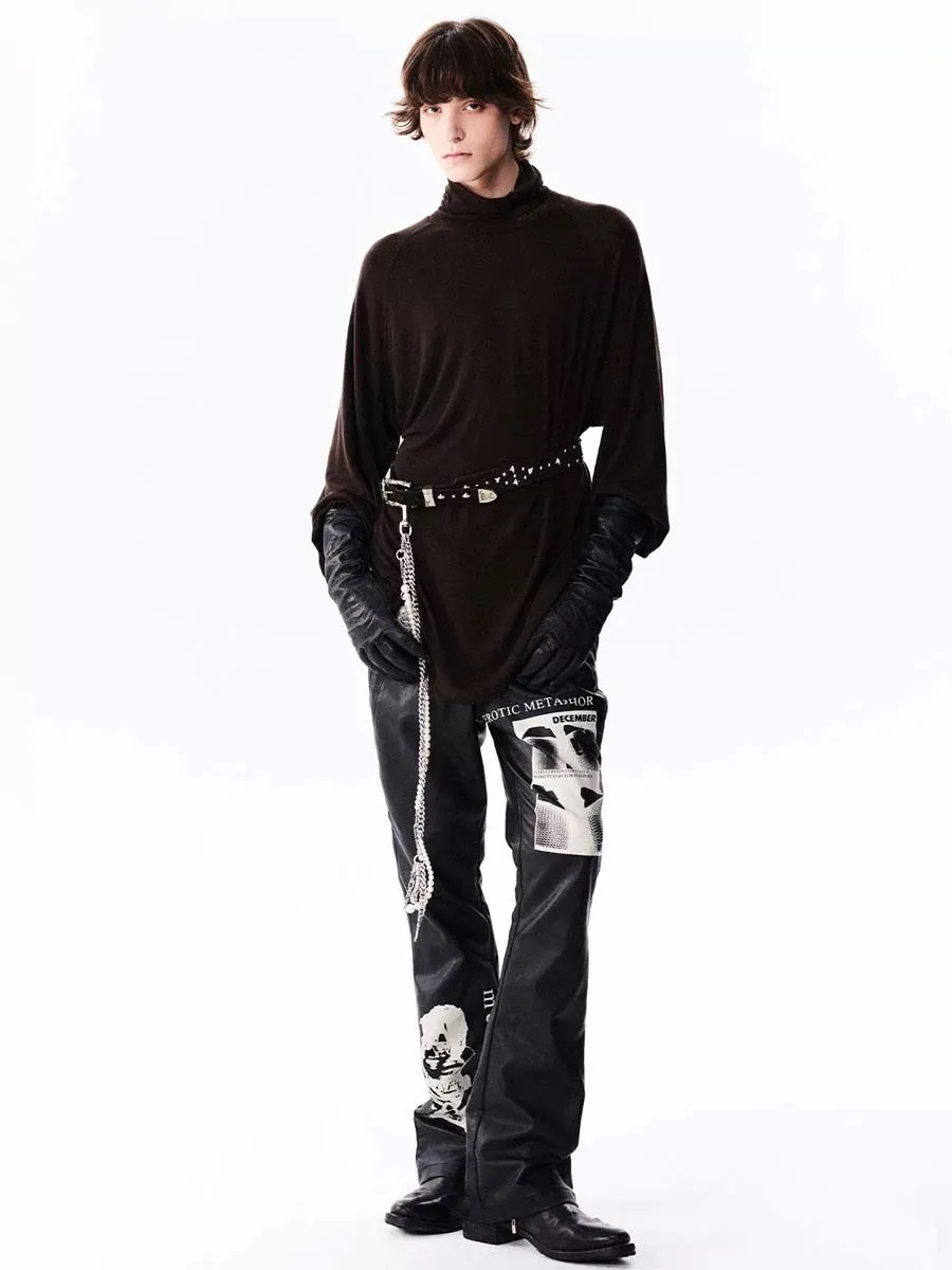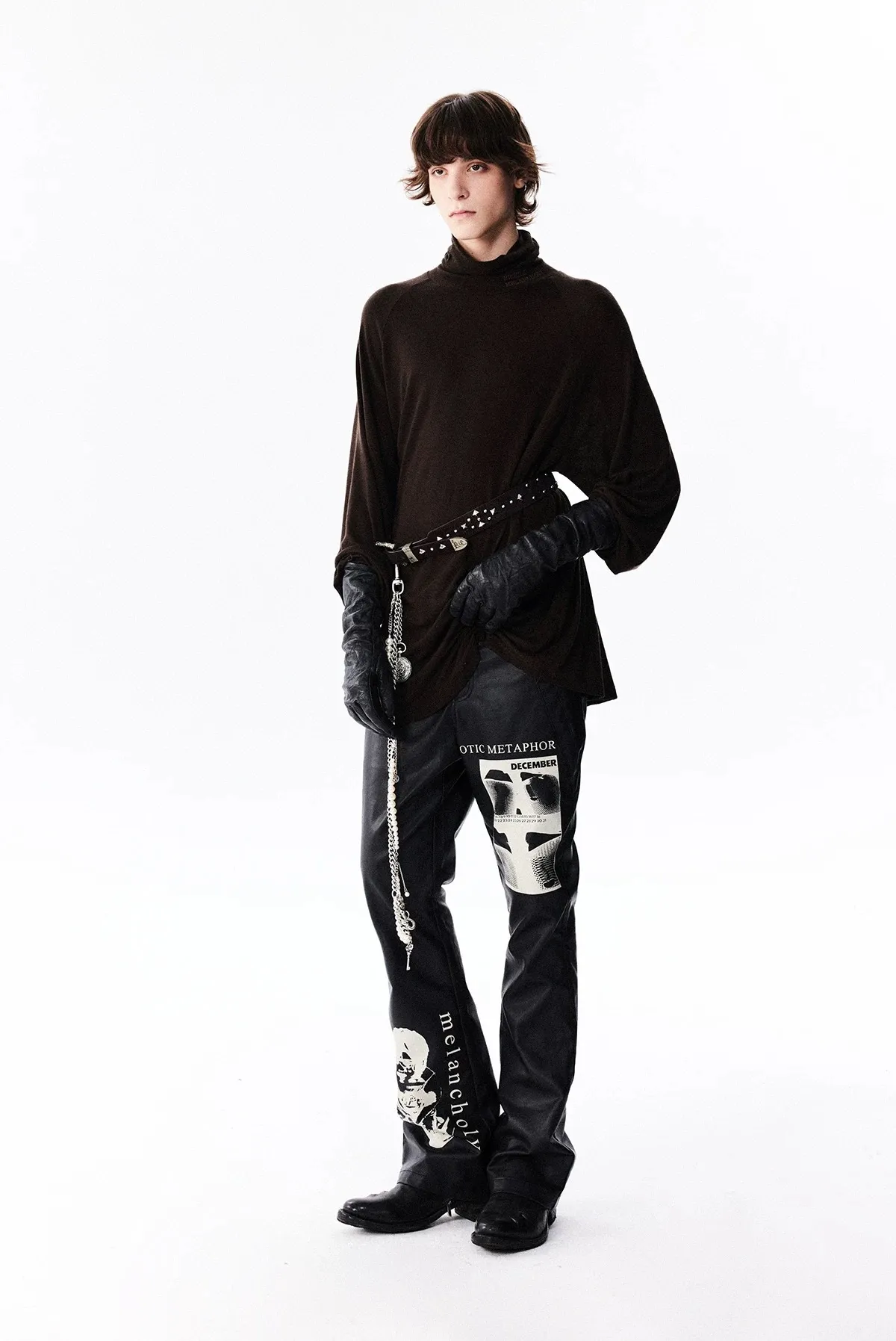 ARGUE 盔甲區塊感 皮革拼接 闊腿 牛仔褲(黑色)