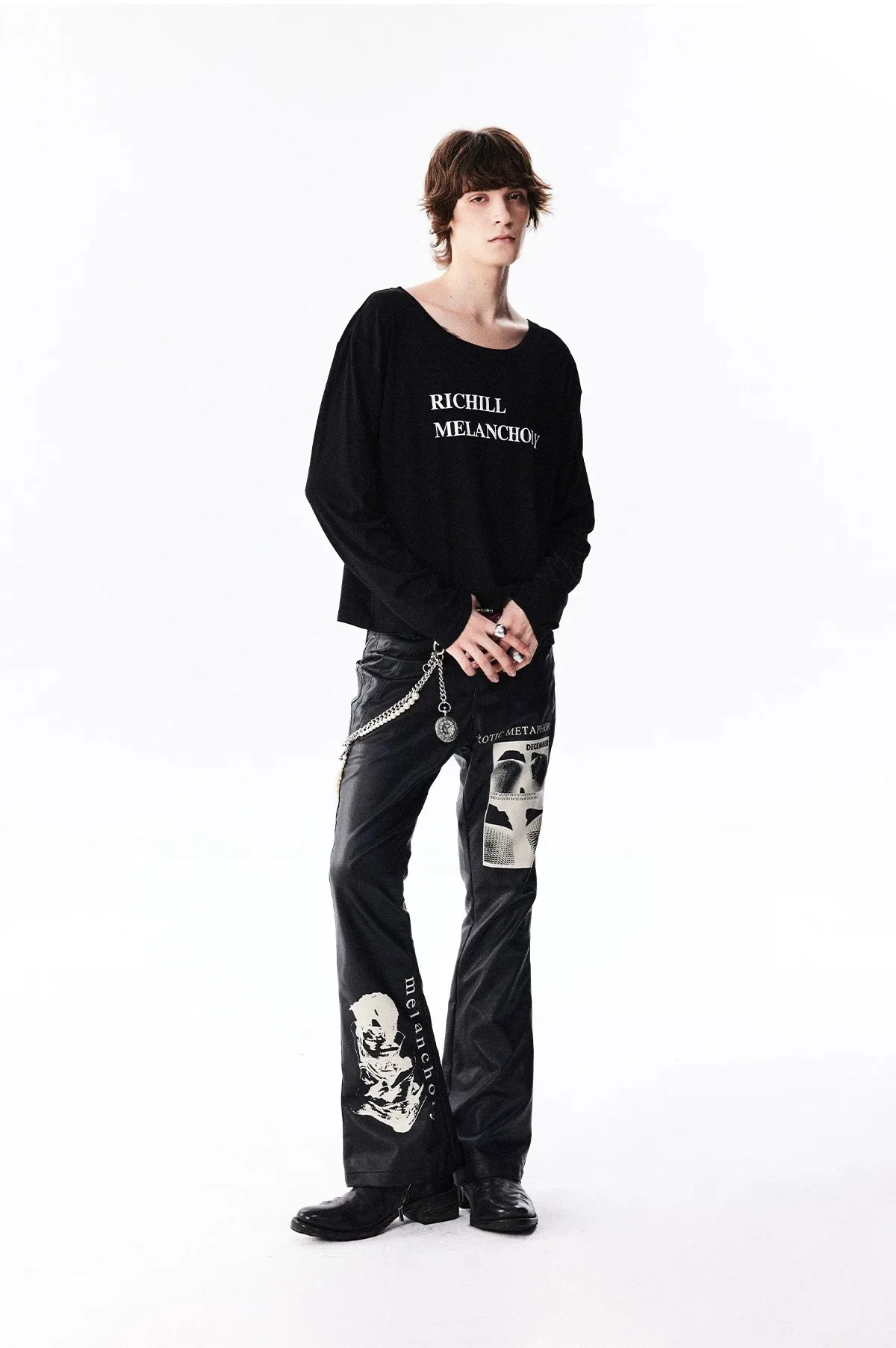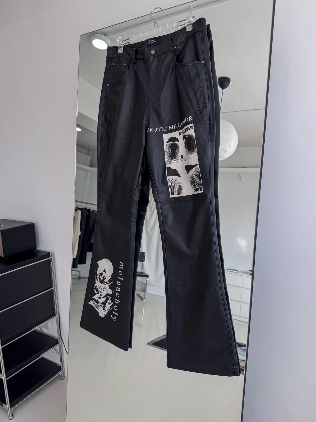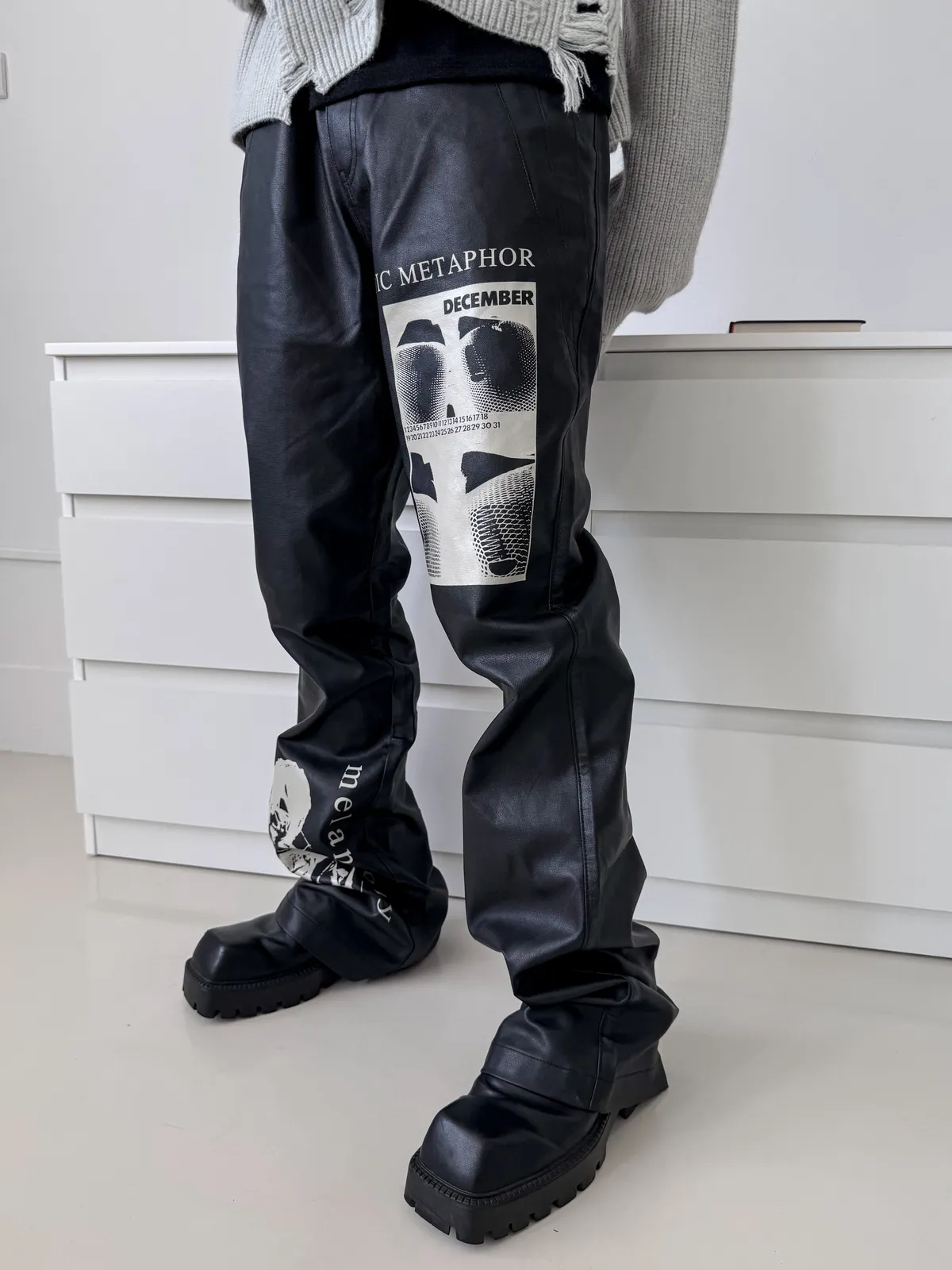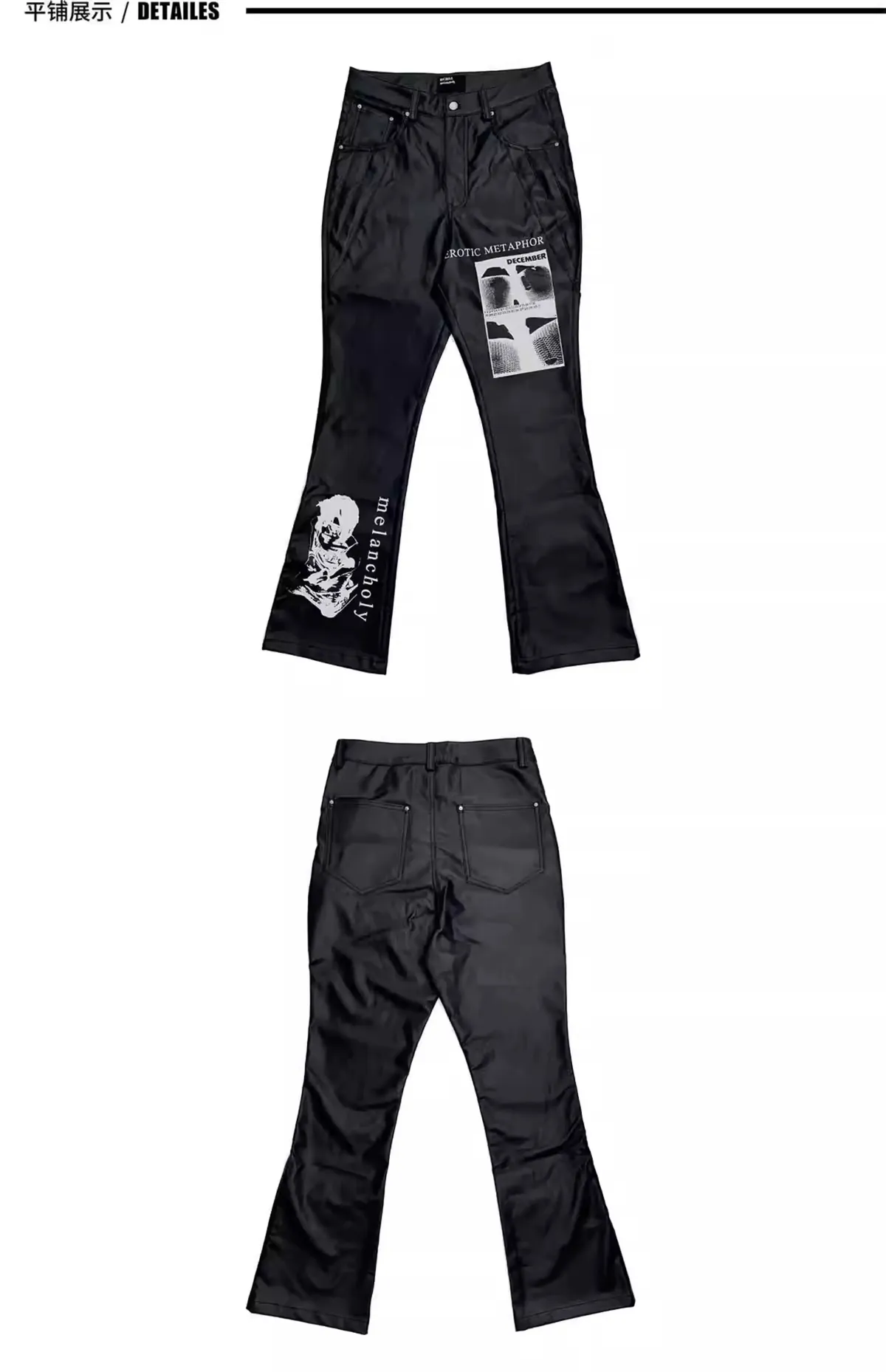 RICHILL 人像印花 微喇叭 皮褲 長褲(黑色)