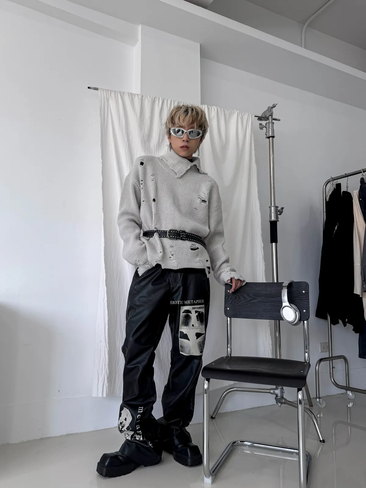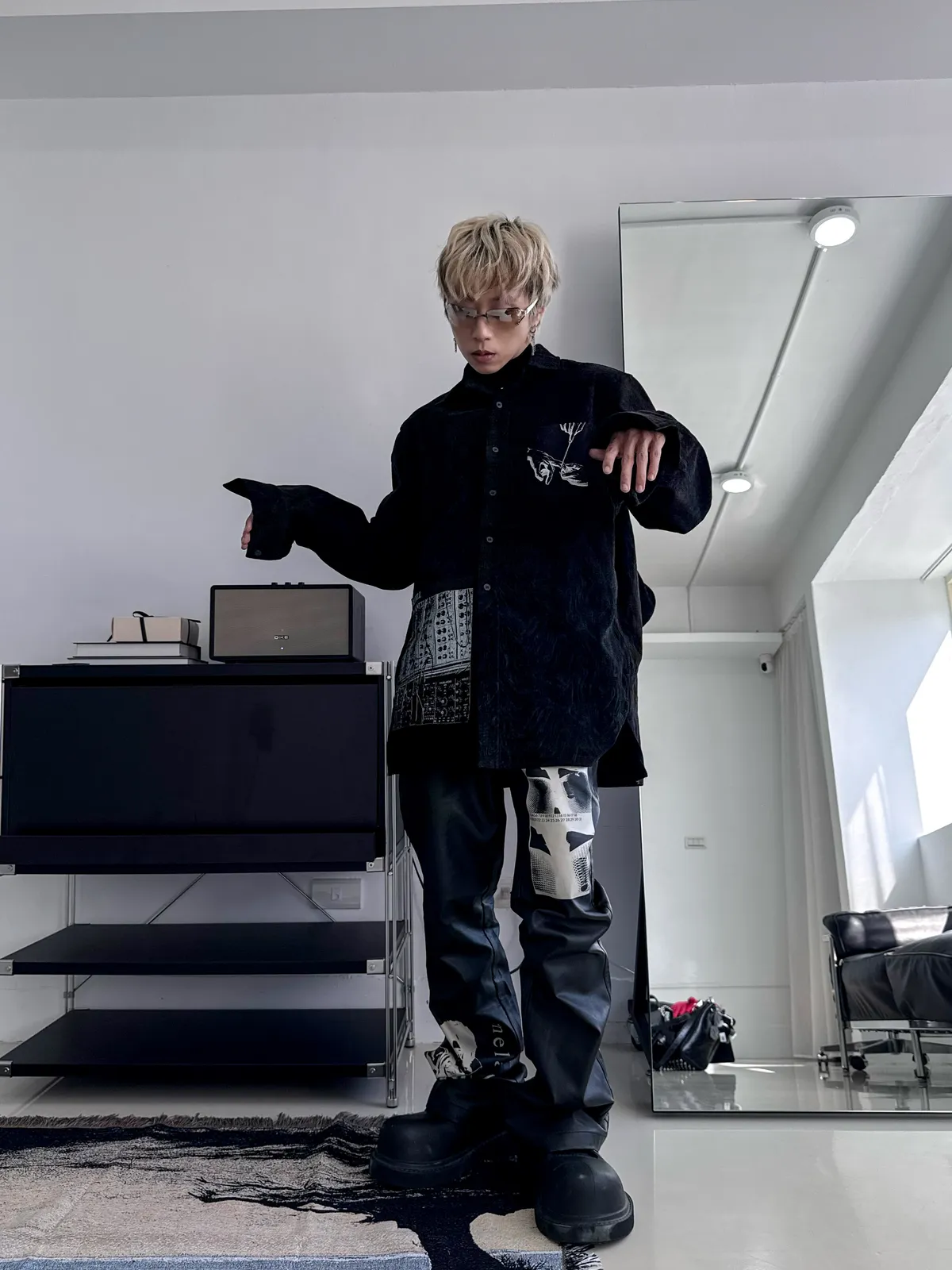 ARGUE 盔甲區塊感 皮革拼接 闊腿 牛仔褲(黑色)