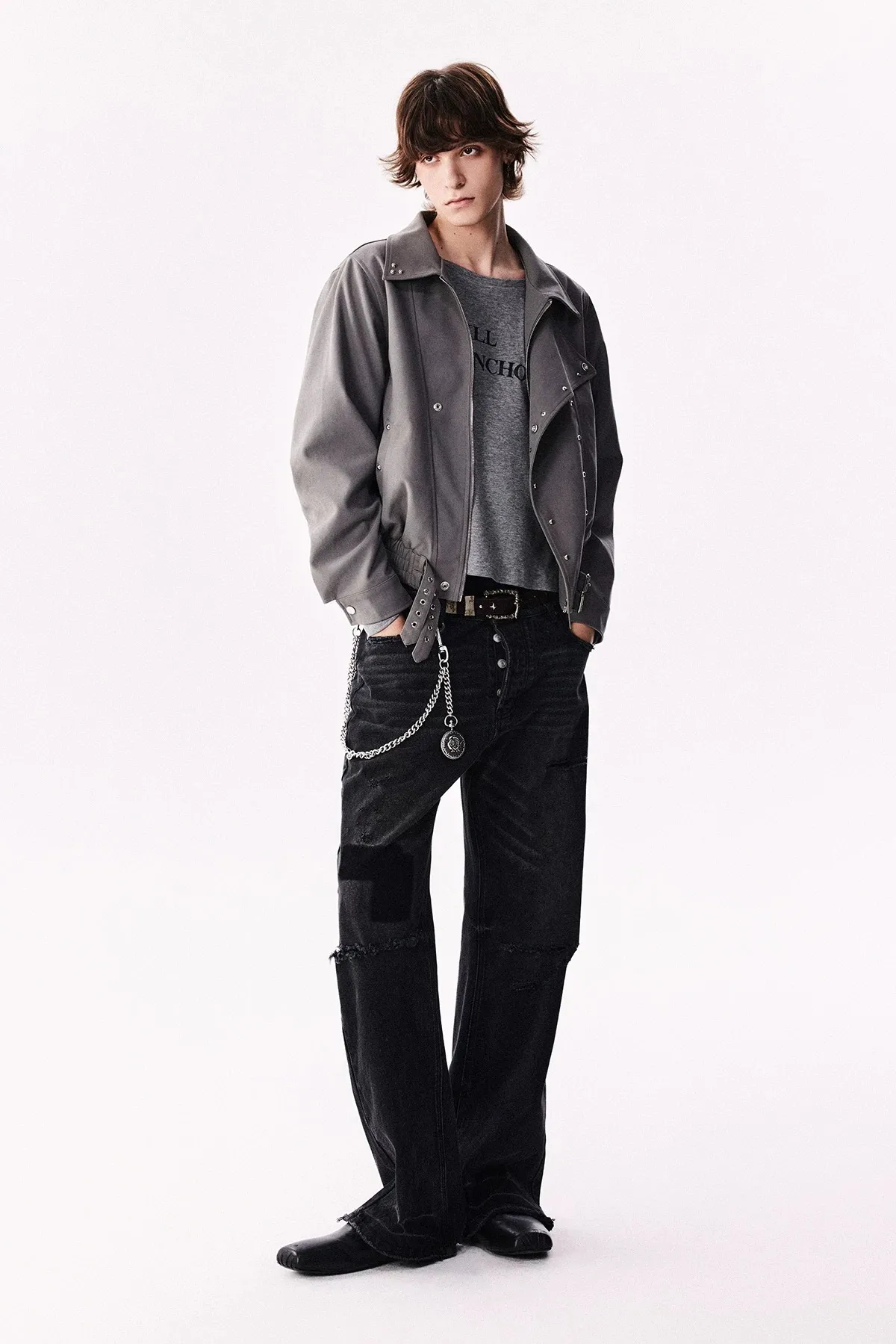 ARGUE 盔甲區塊感 皮革拼接 闊腿 牛仔褲(黑色)