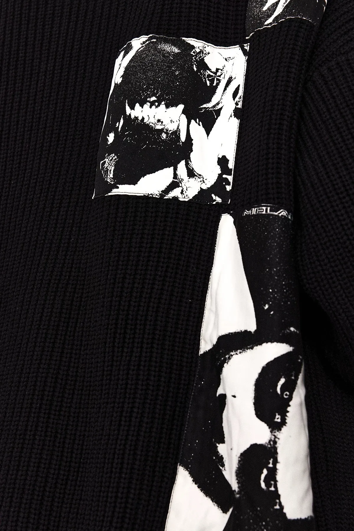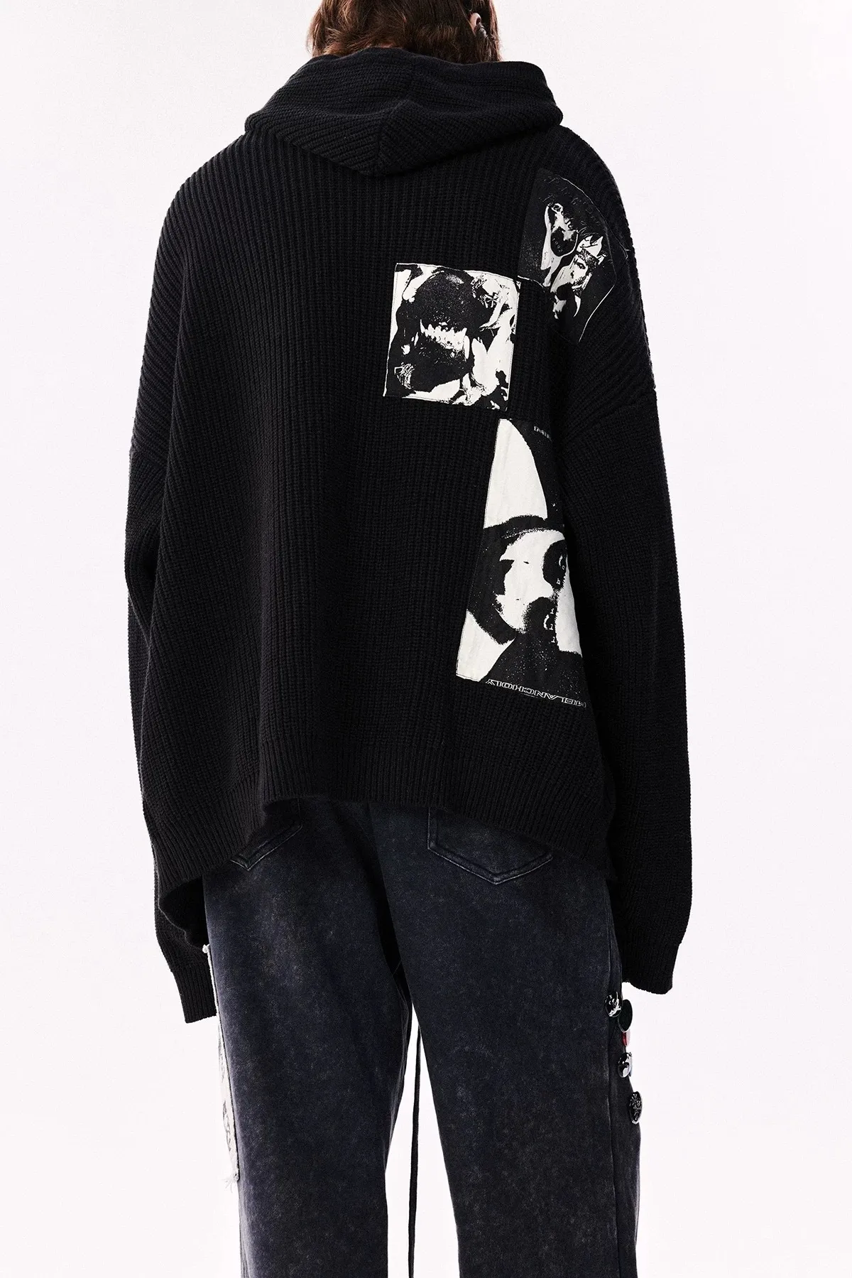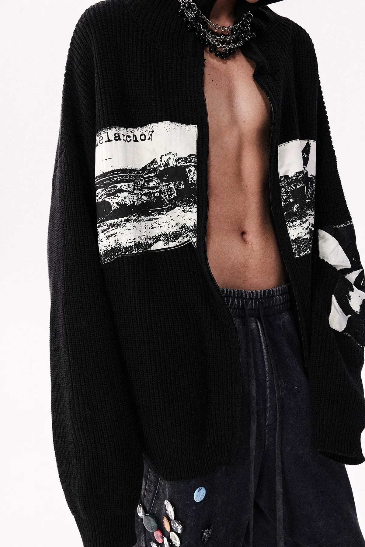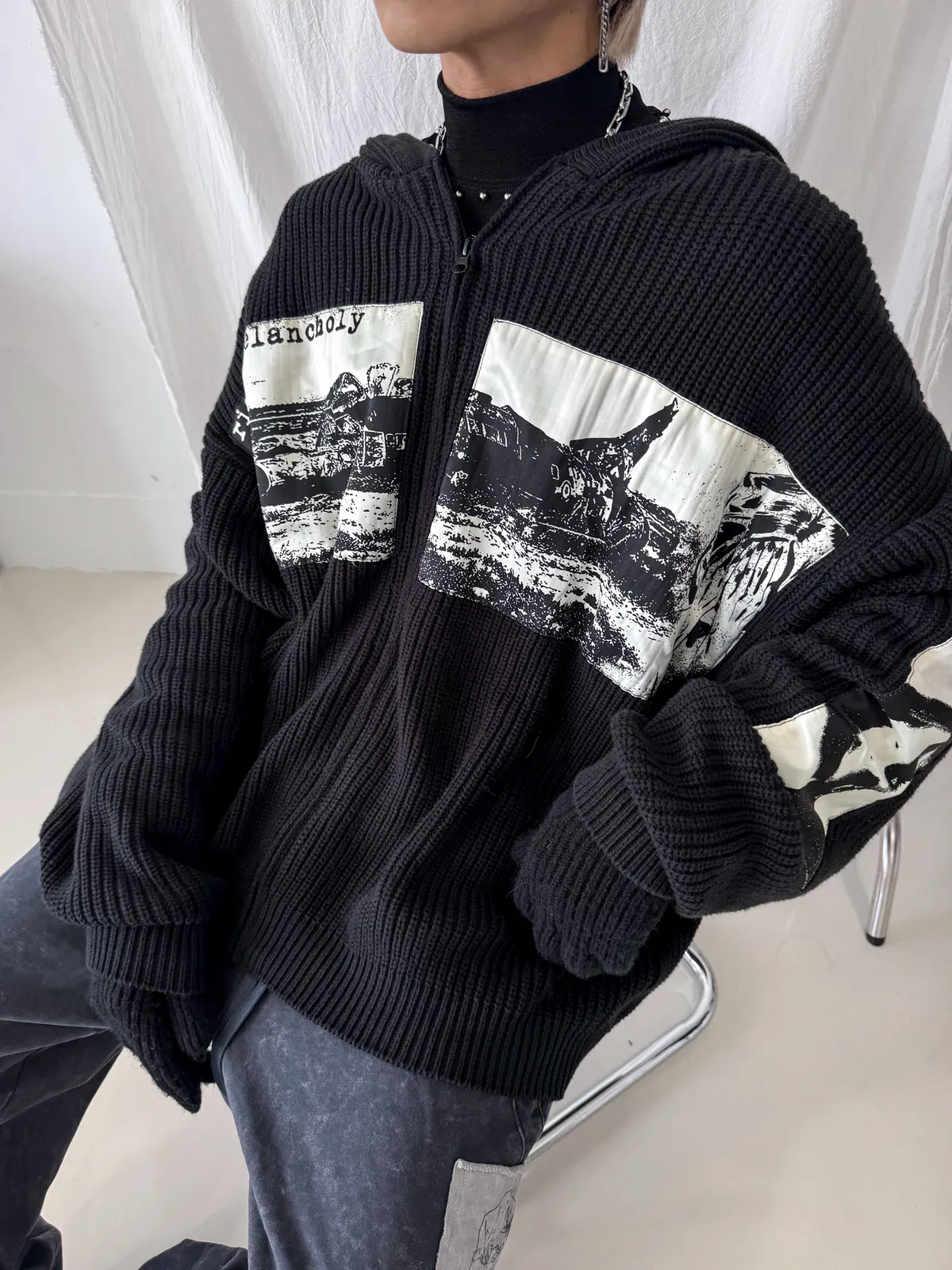 RICHILL 緞面插畫貼布 針織毛衣 外套(黑色)