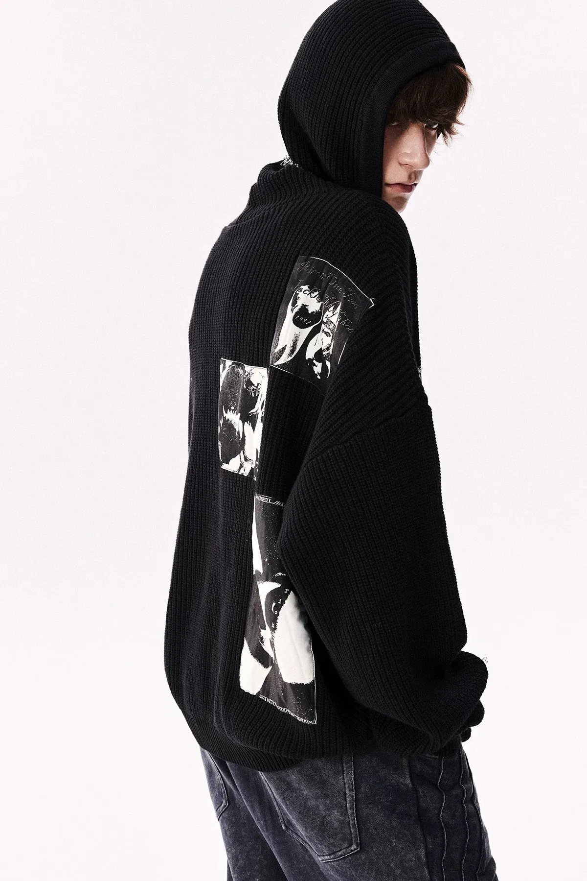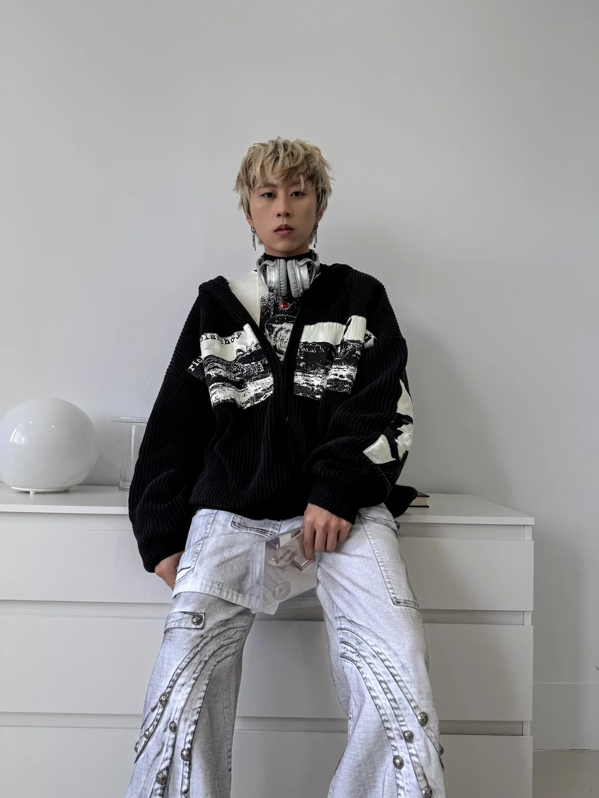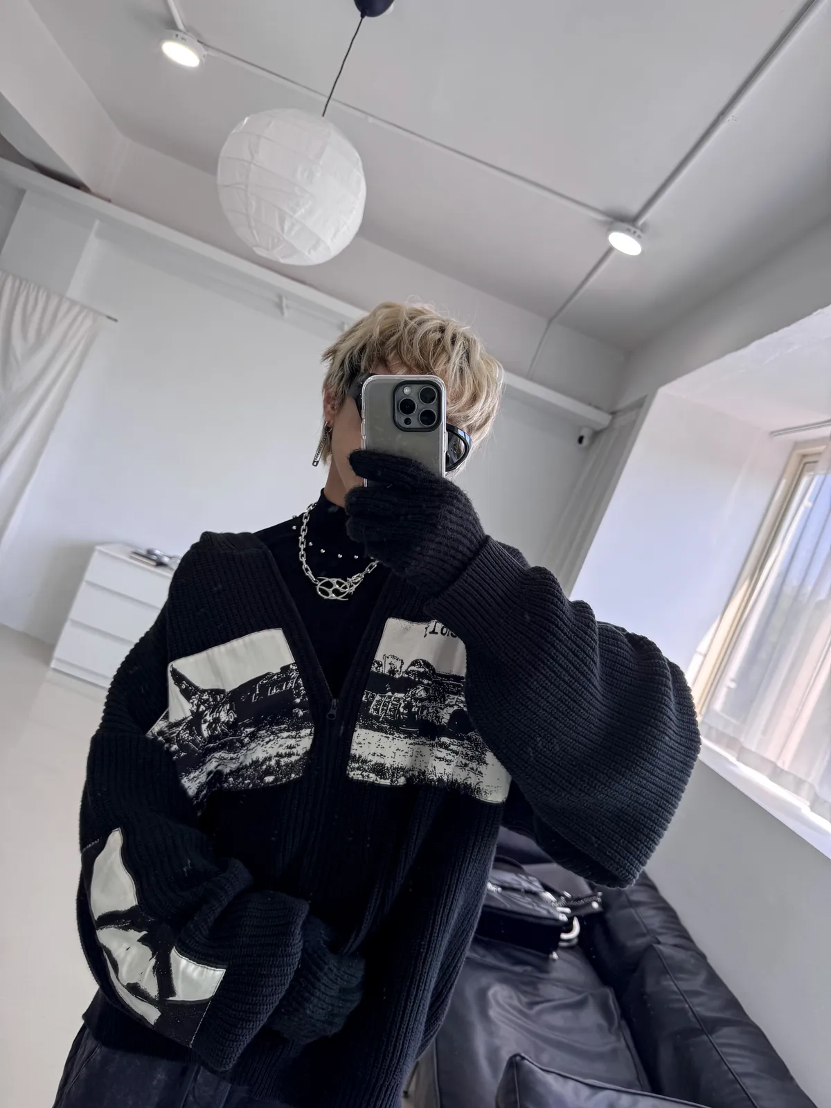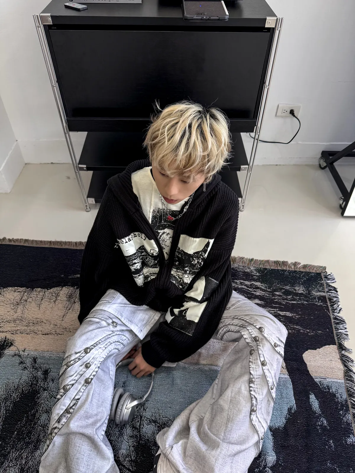 RICHILL 緞面插畫貼布 針織毛衣 外套(黑色)