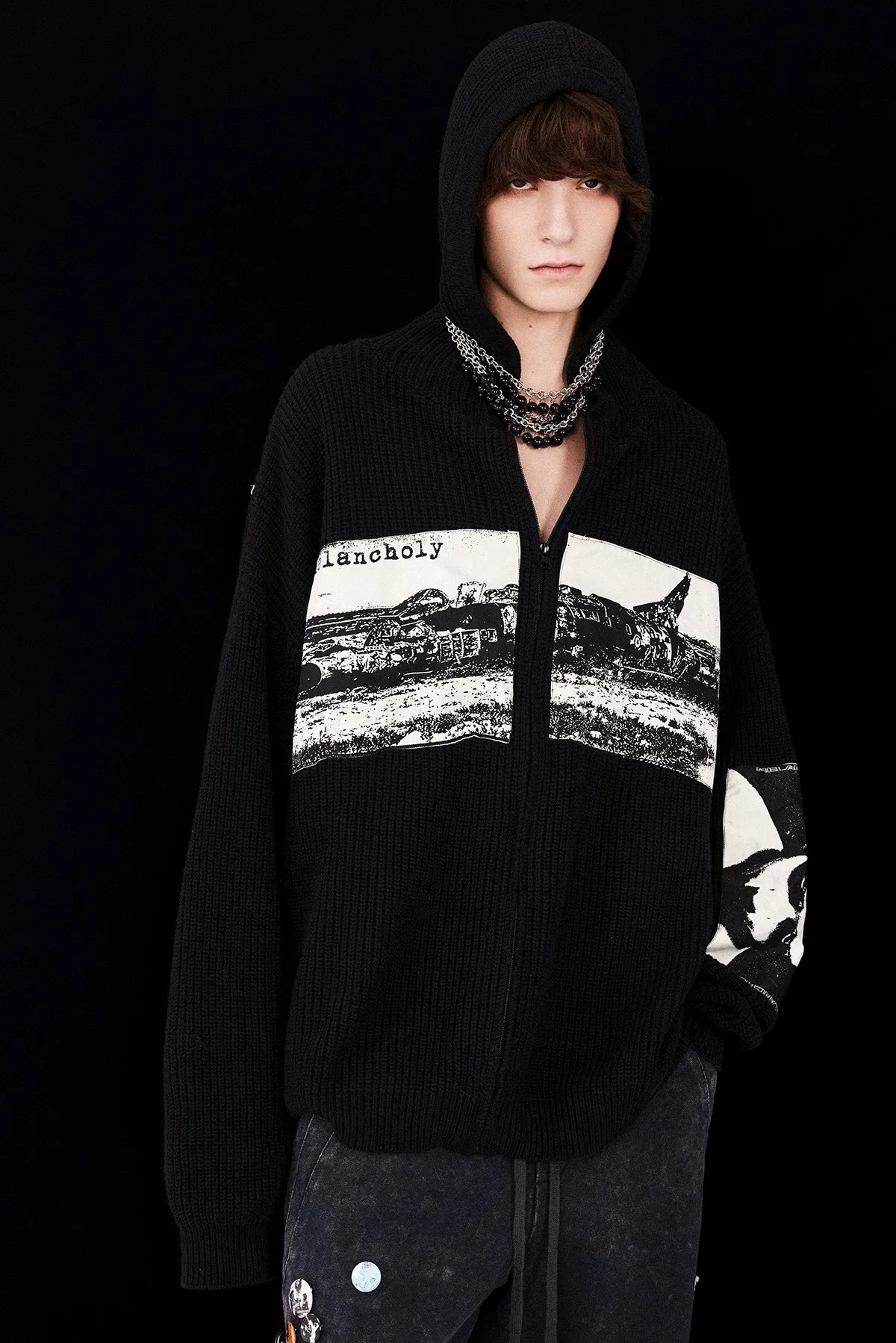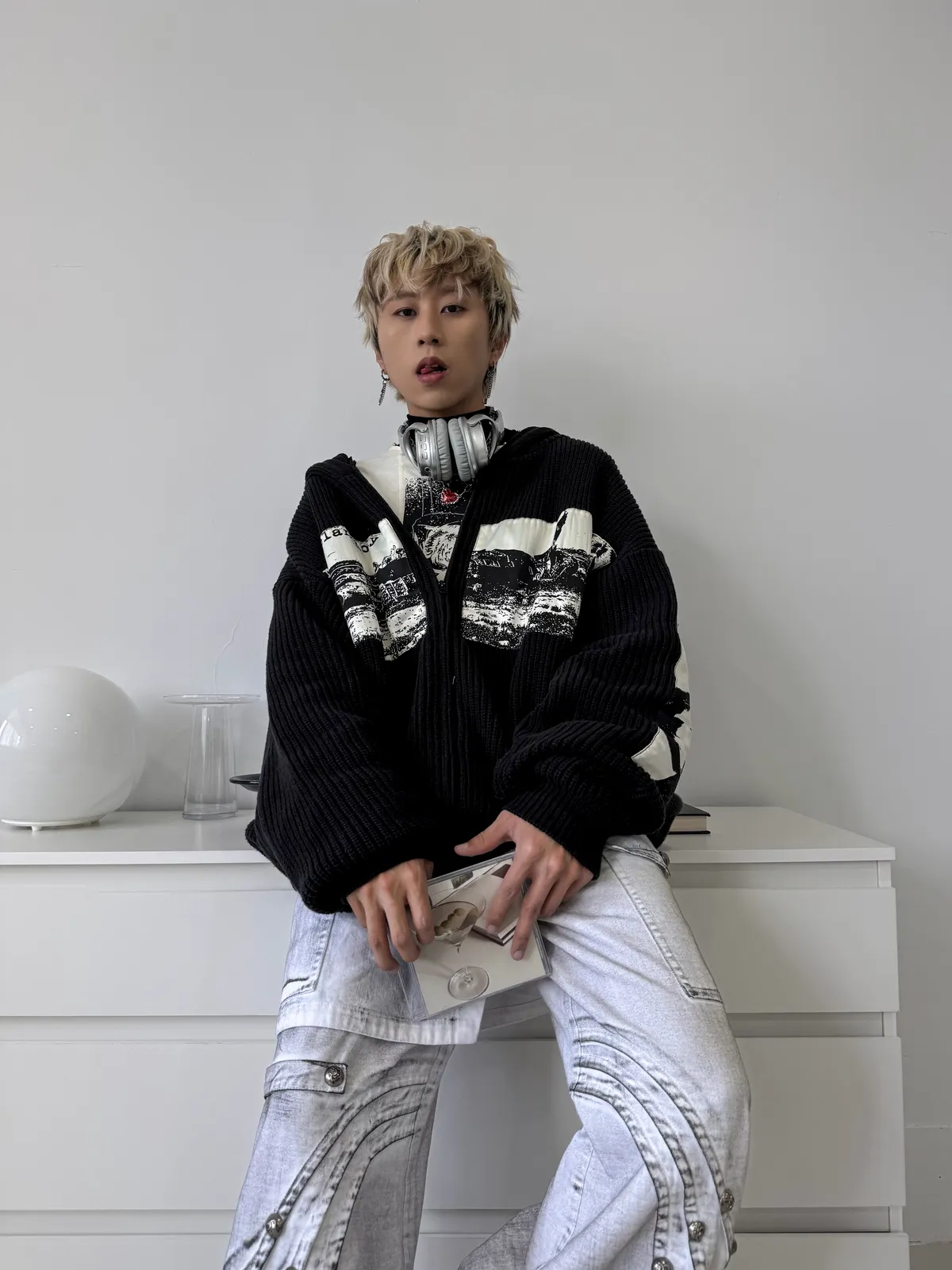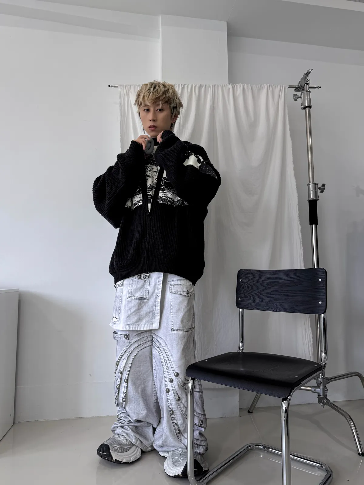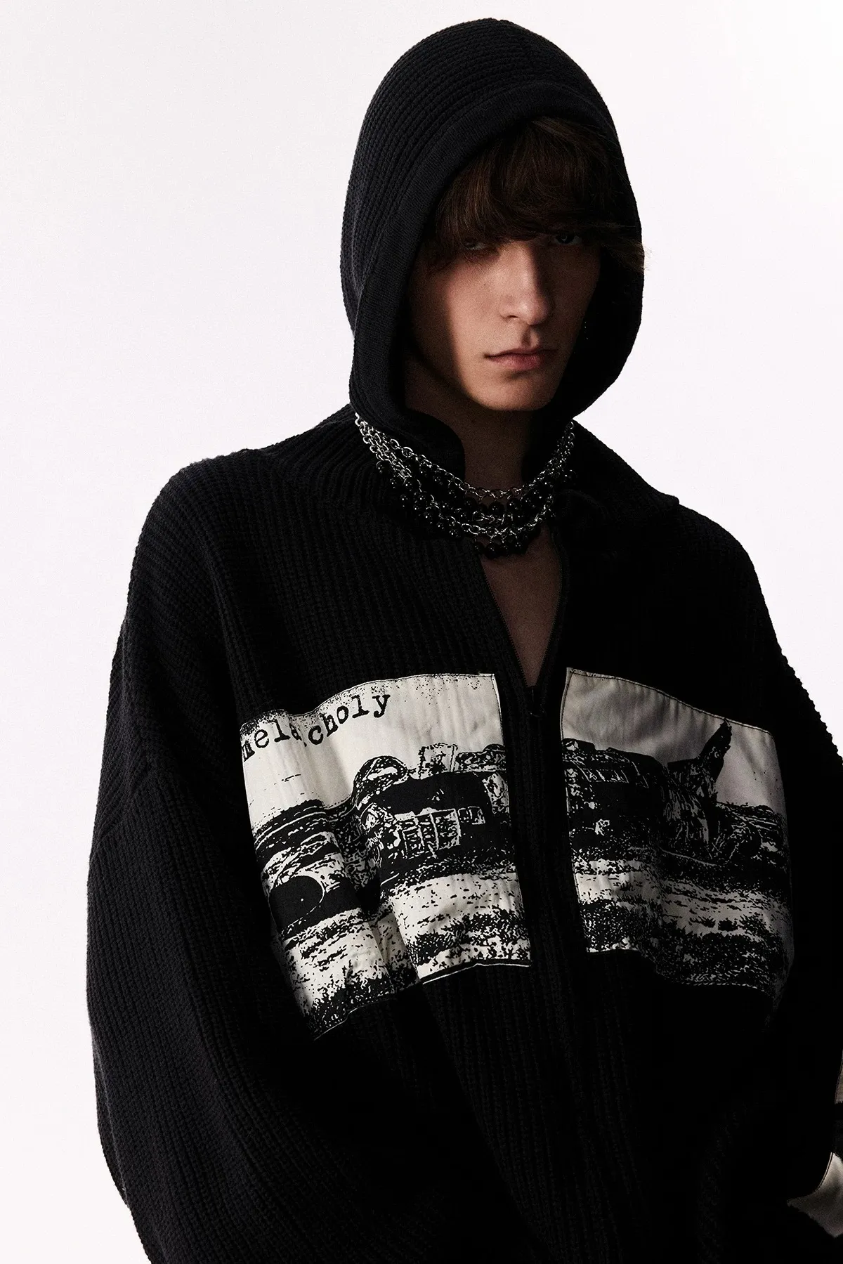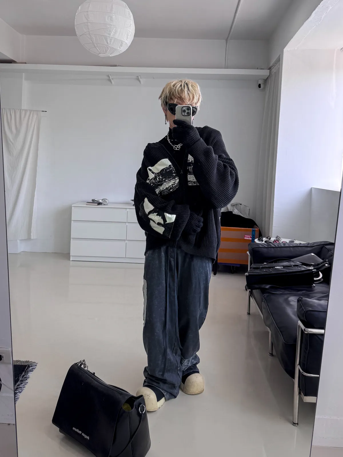 RICHILL 緞面插畫貼布 針織毛衣 外套(黑色)