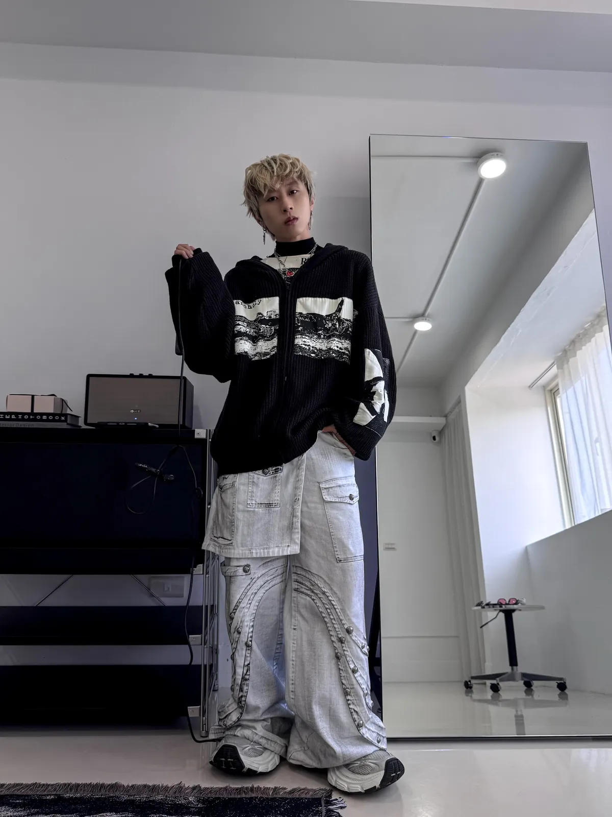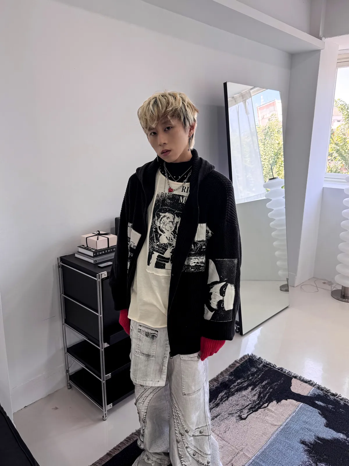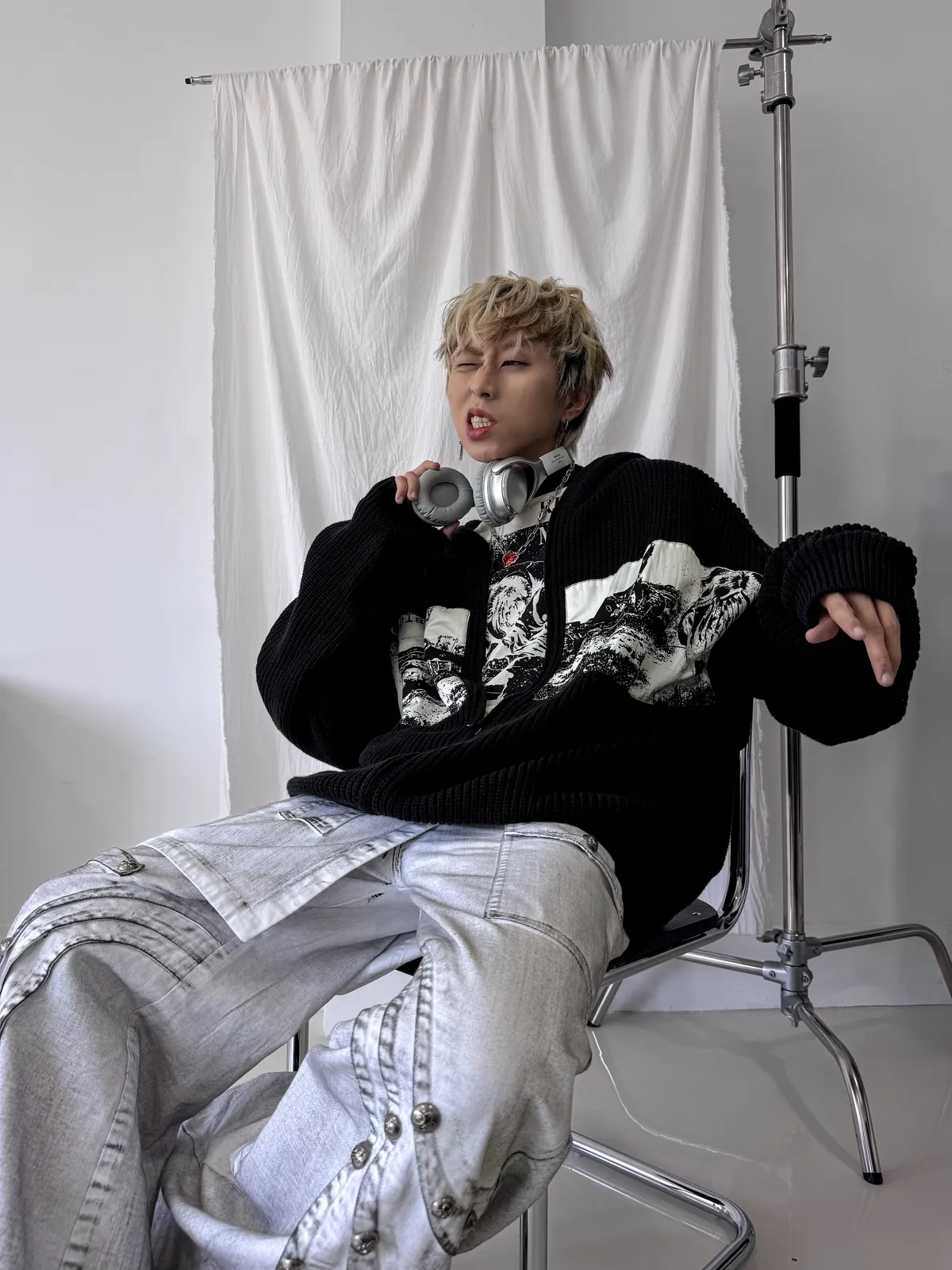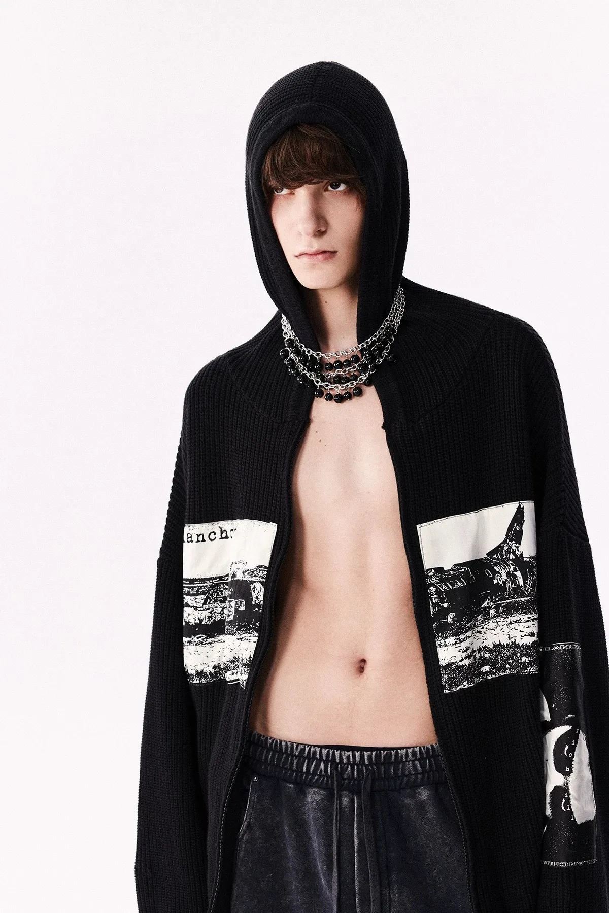 RICHILL 緞面插畫貼布 針織毛衣 外套(黑色)