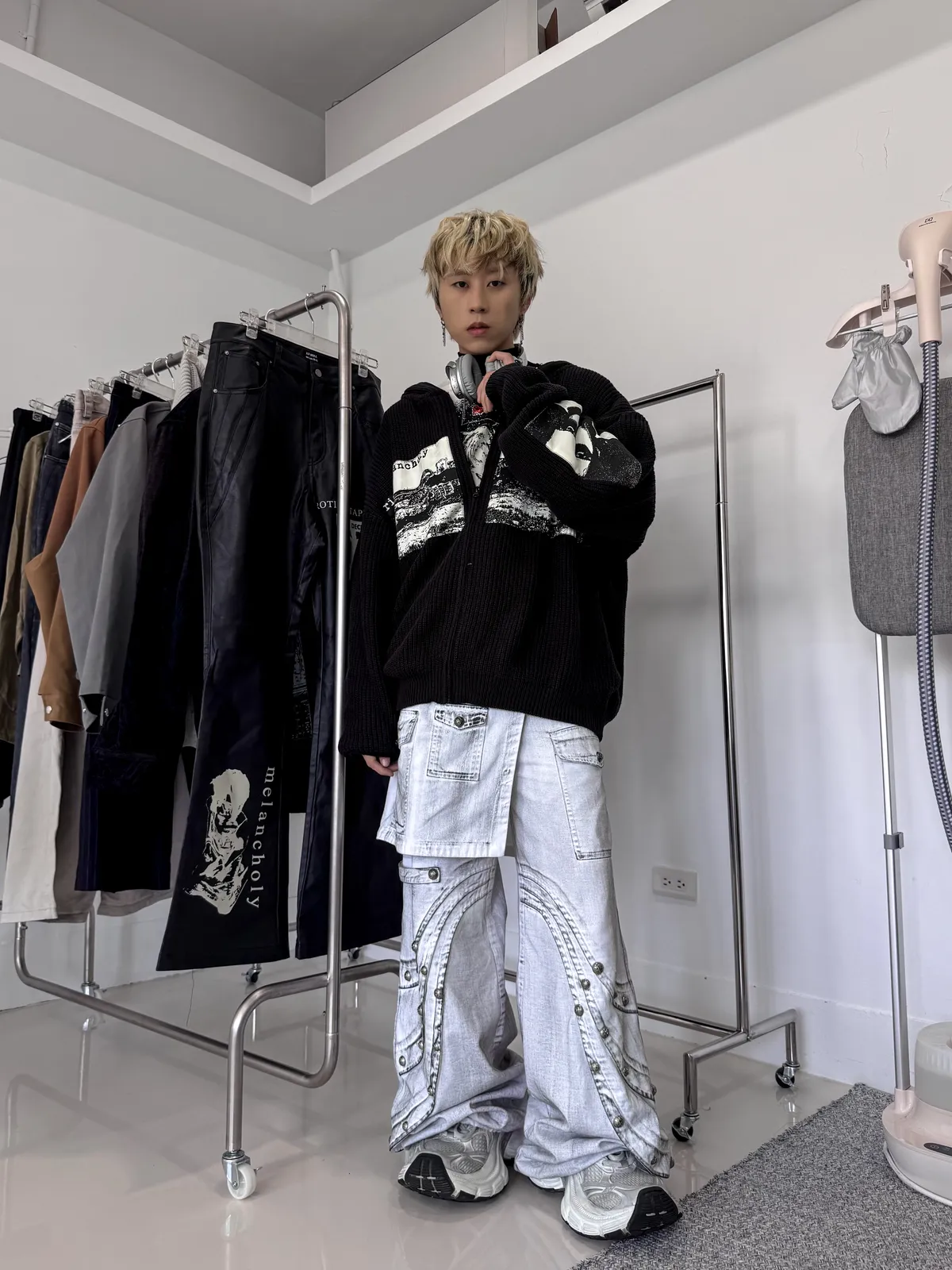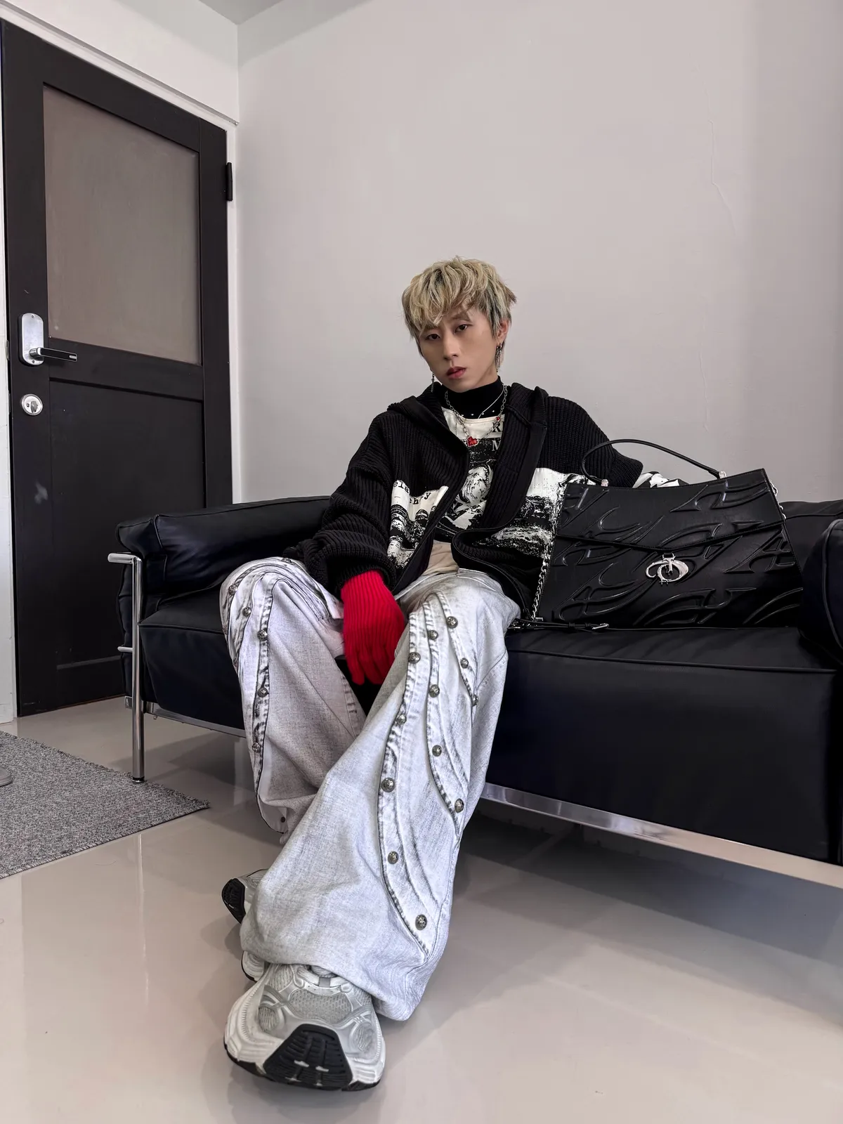 ARGUE 盔甲區塊感 皮革拼接 闊腿 牛仔褲(黑色)