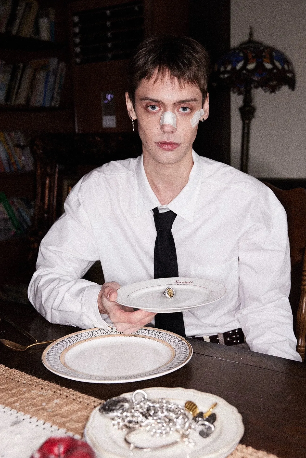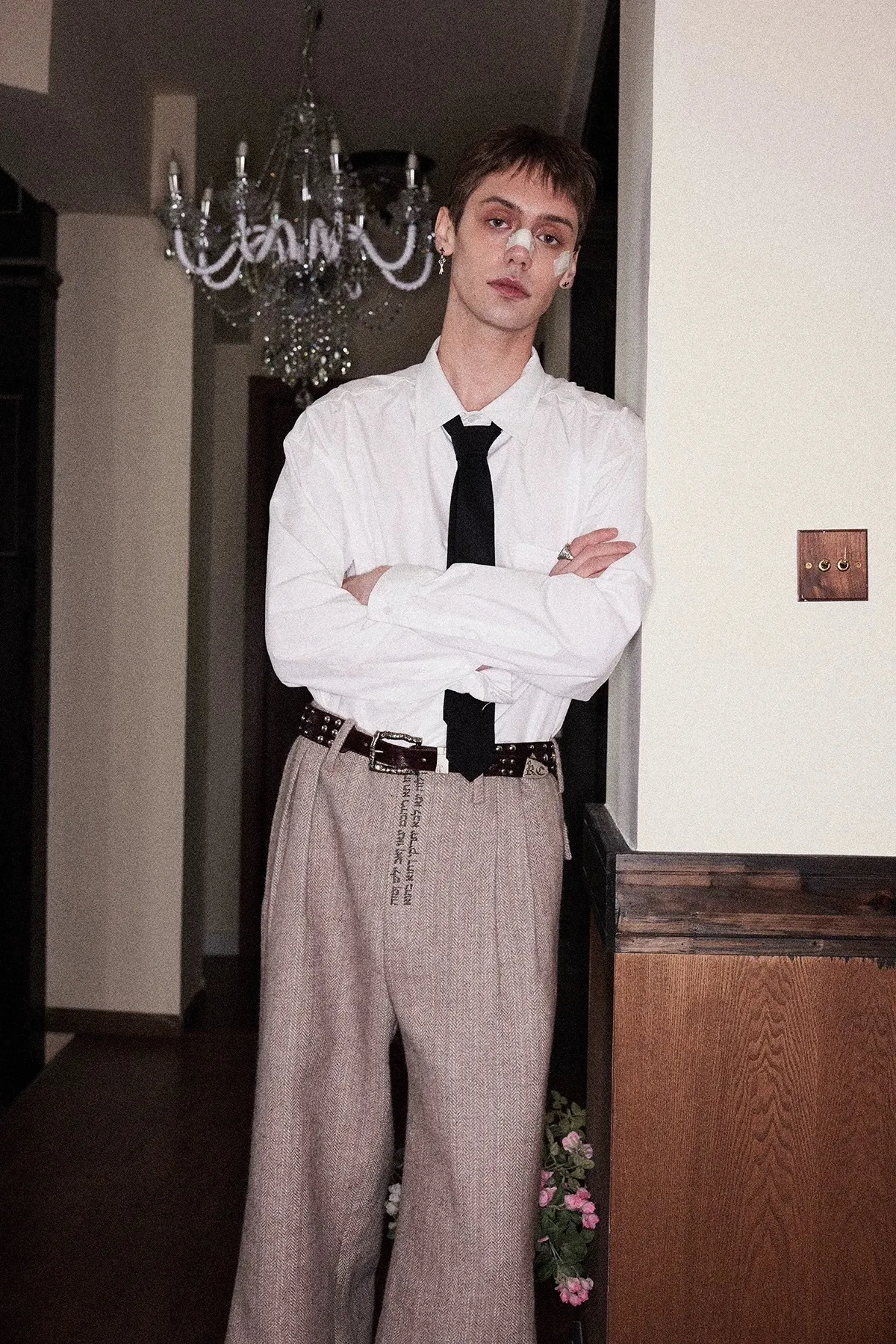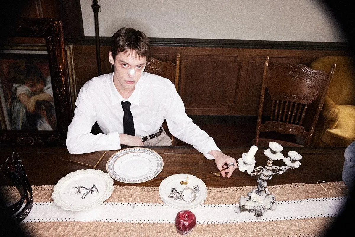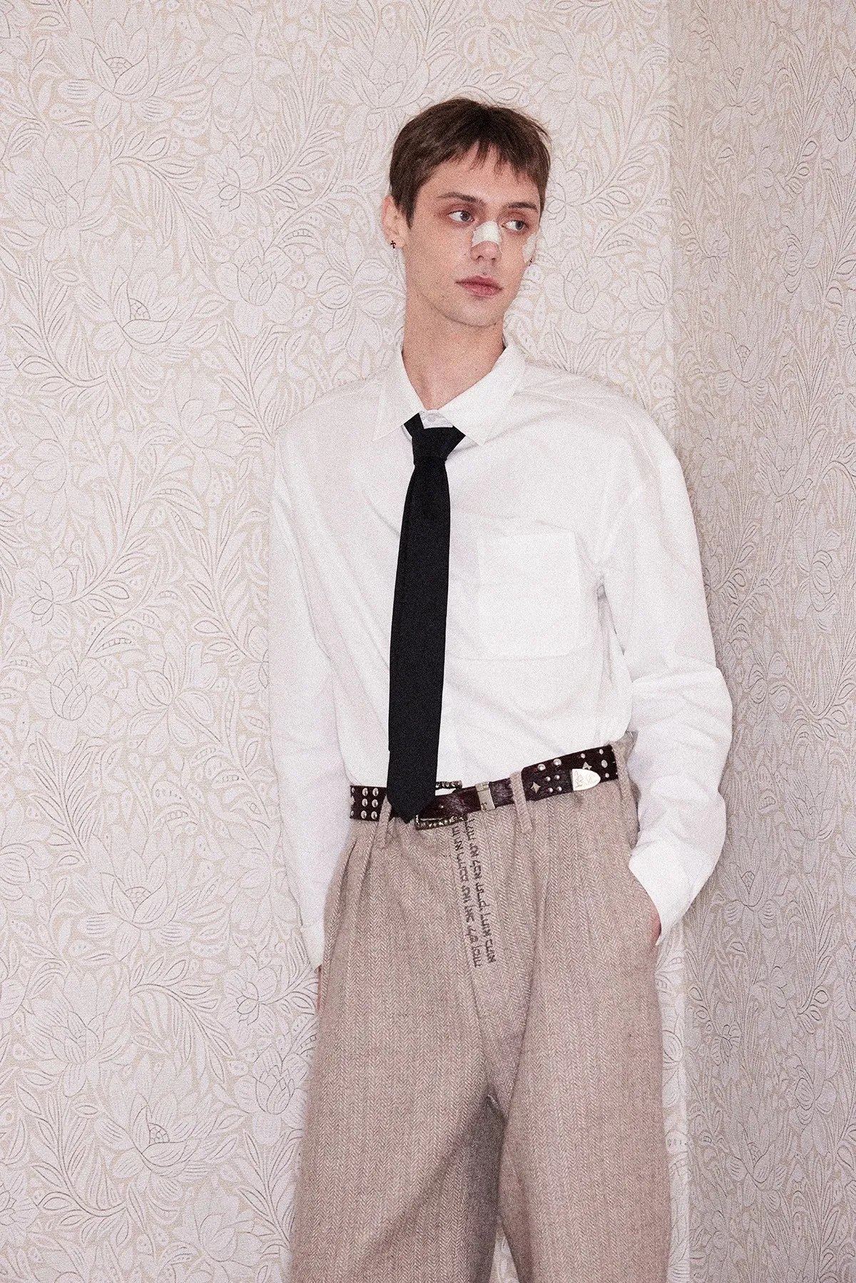 RICHILL 髒染破壞 插畫 煙頭扣帶 牛仔外套 牛仔褲 套裝(灰白)