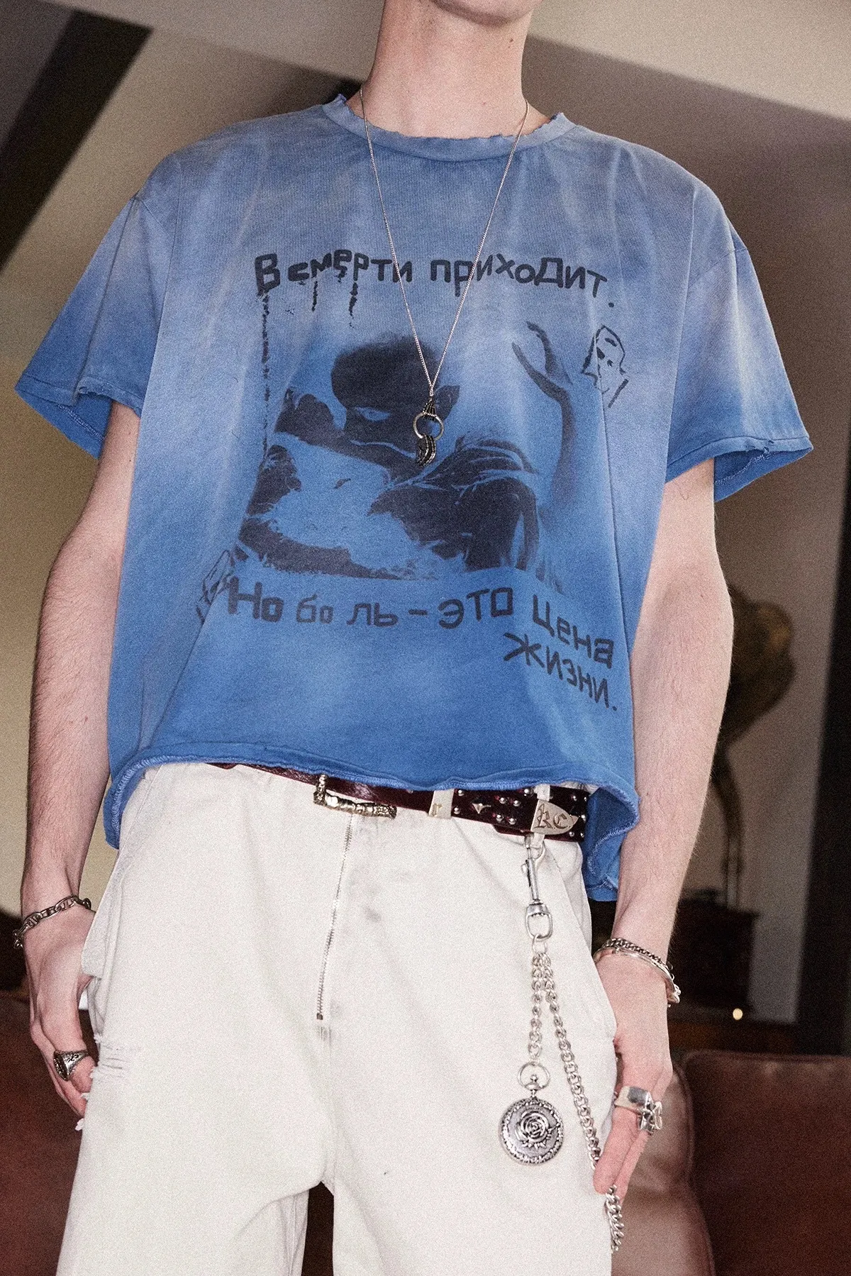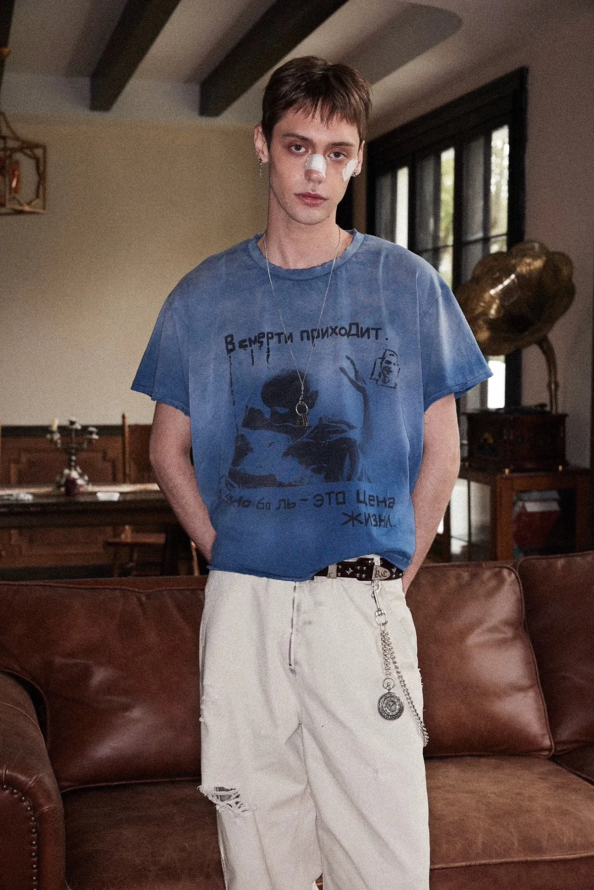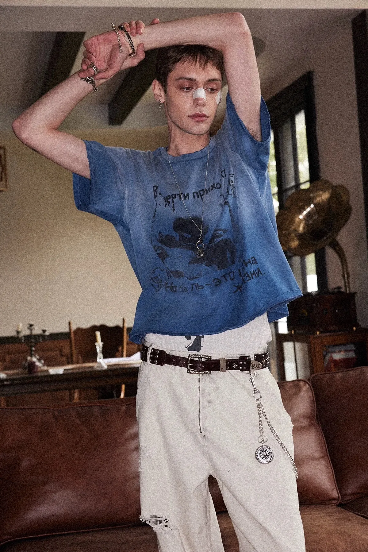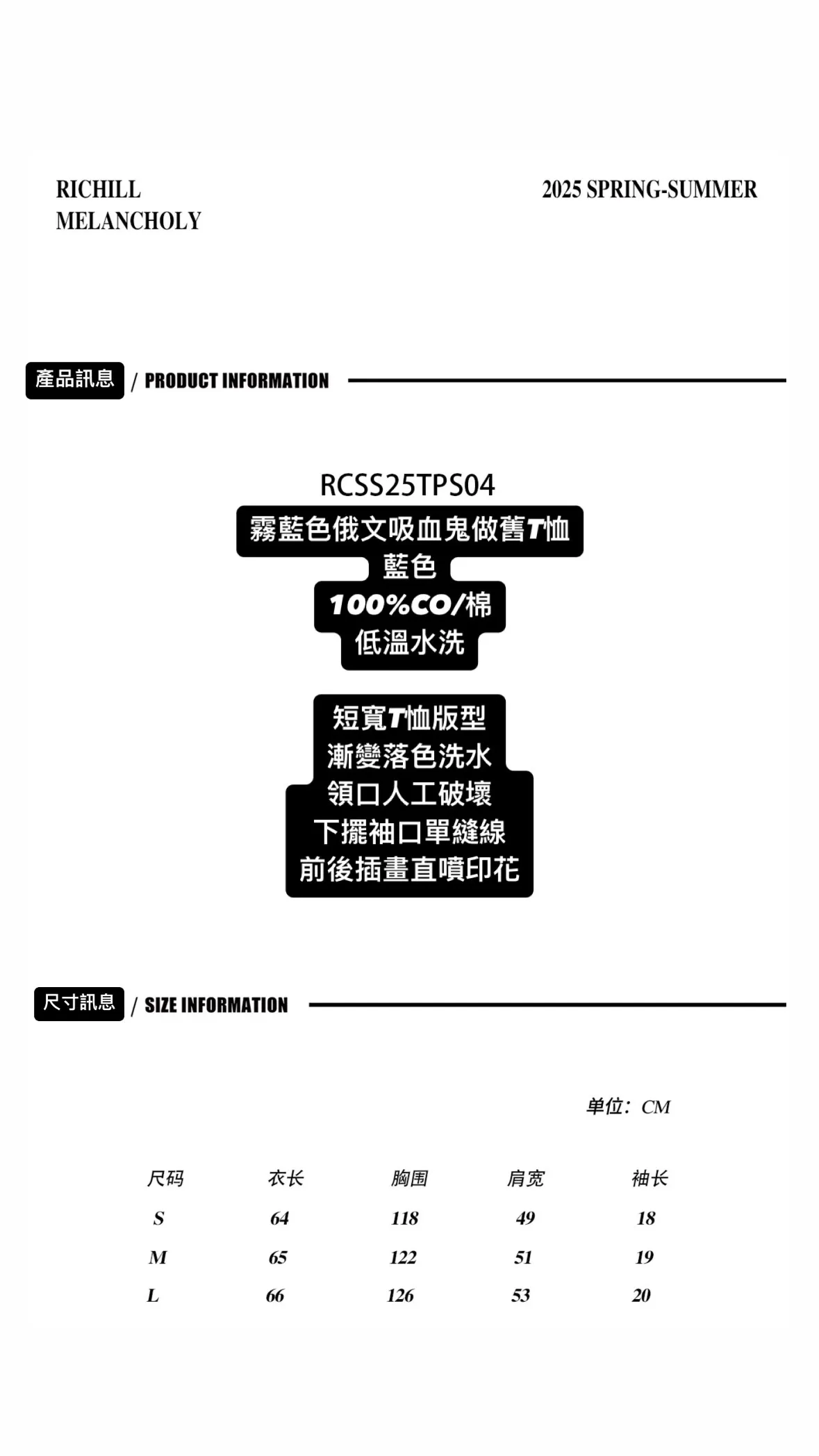 RICHILL 俄文 吸血鬼 水洗破壞 短袖(霧藍色)