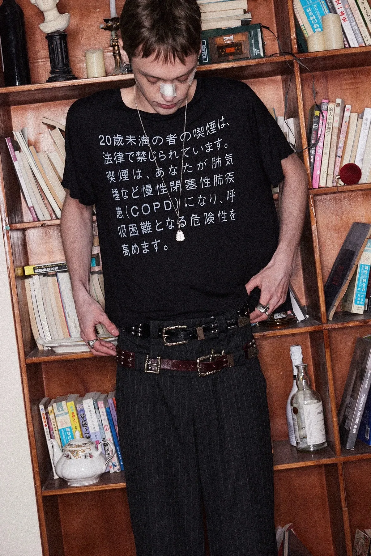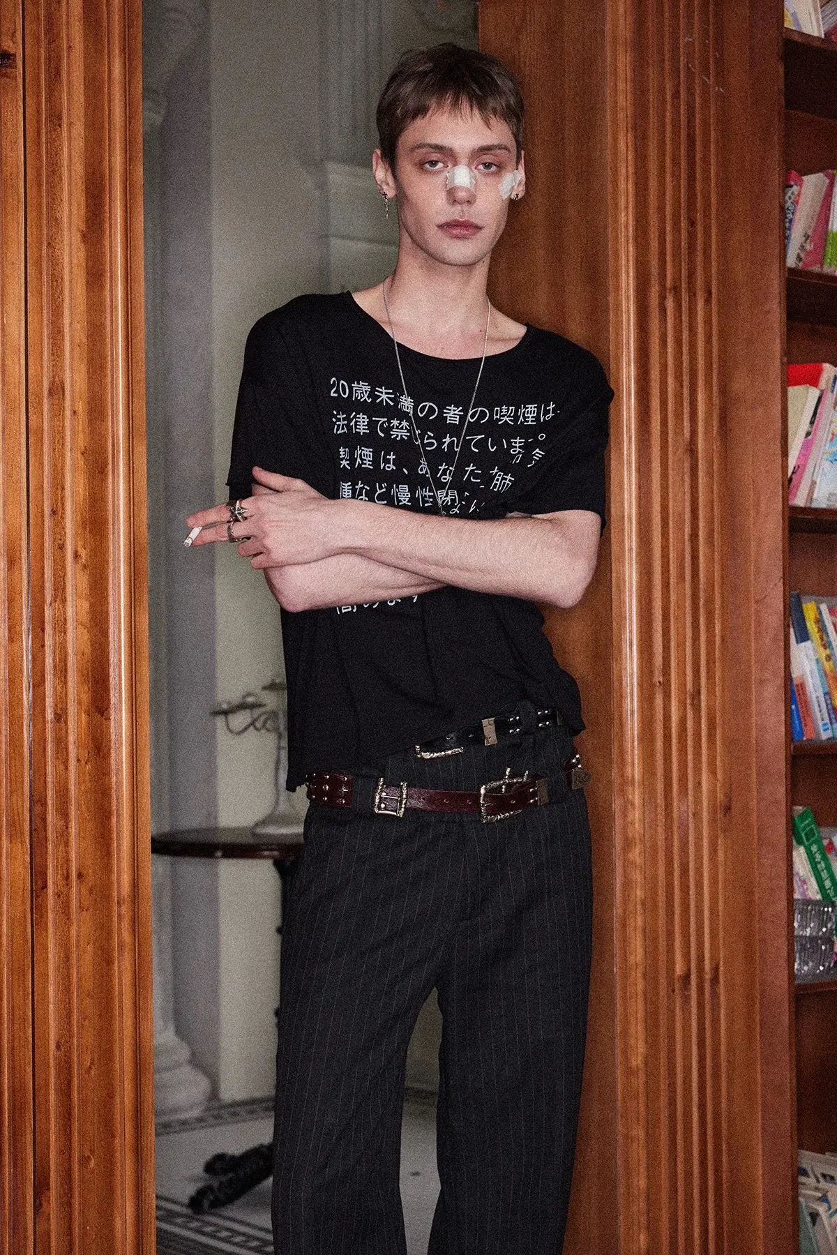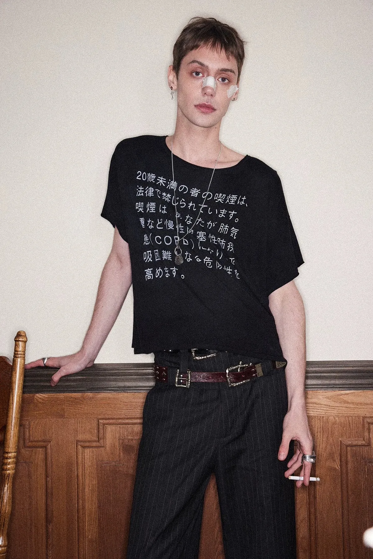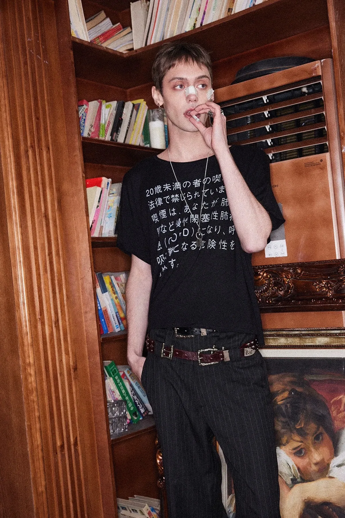 RICHILL 髒染破壞 插畫 煙頭扣帶 牛仔外套 牛仔褲 套裝(灰白)