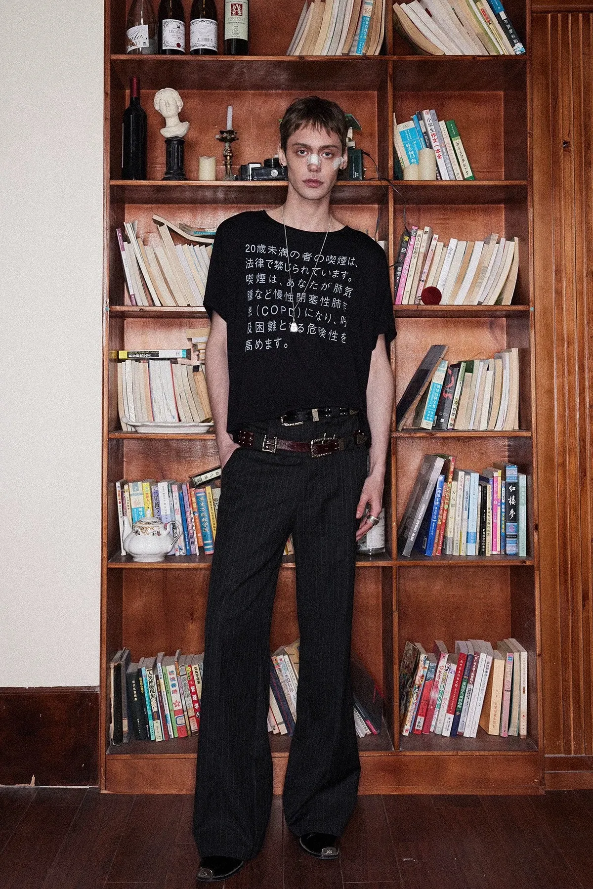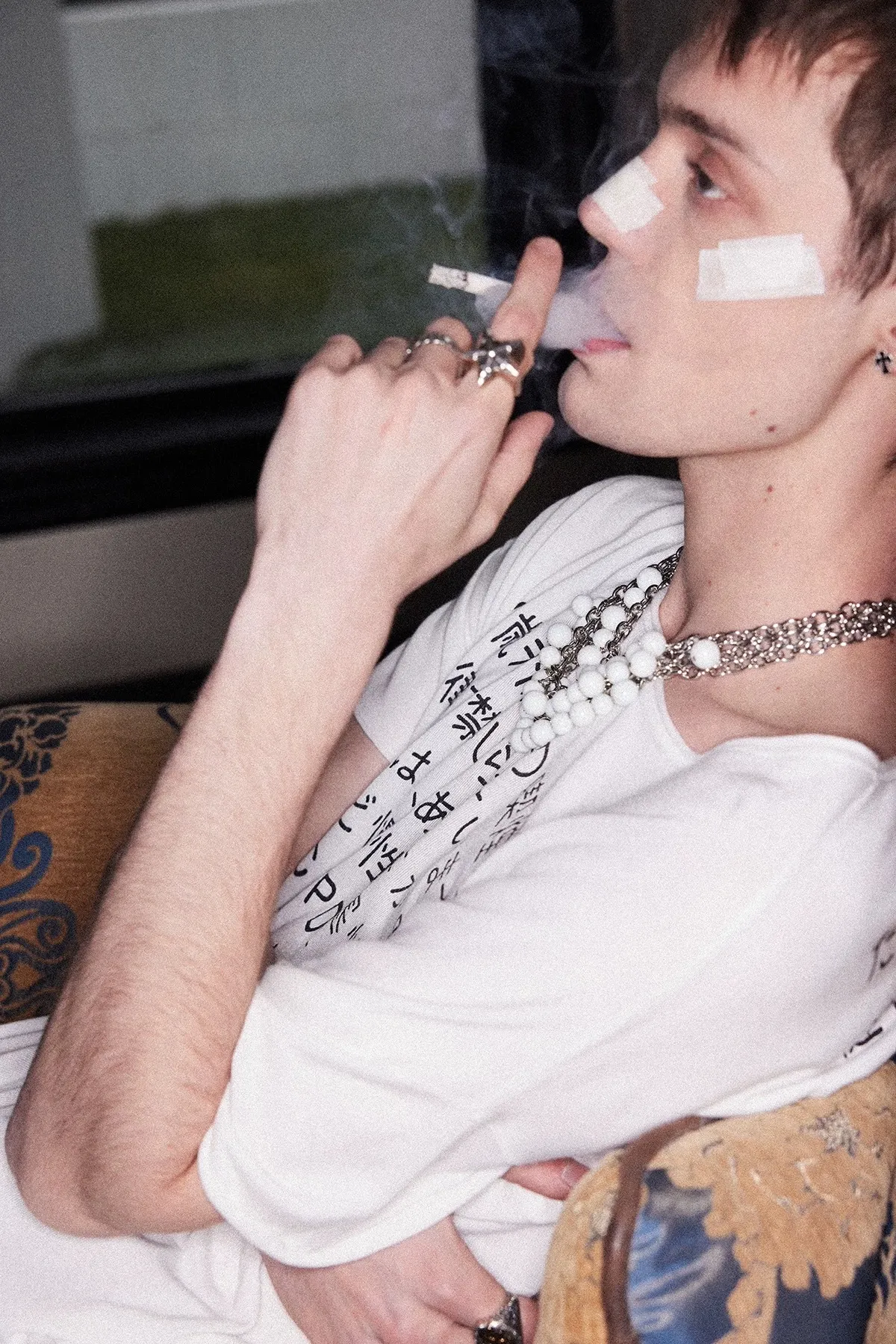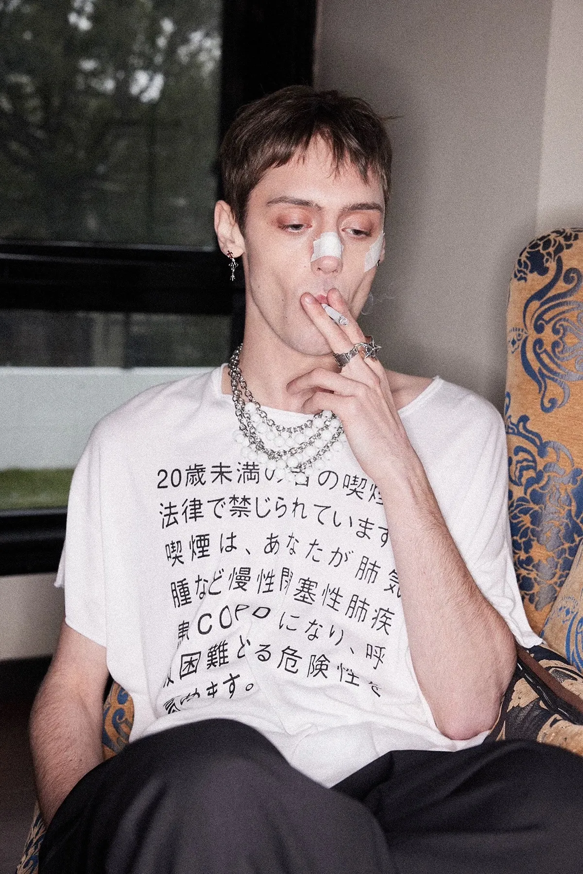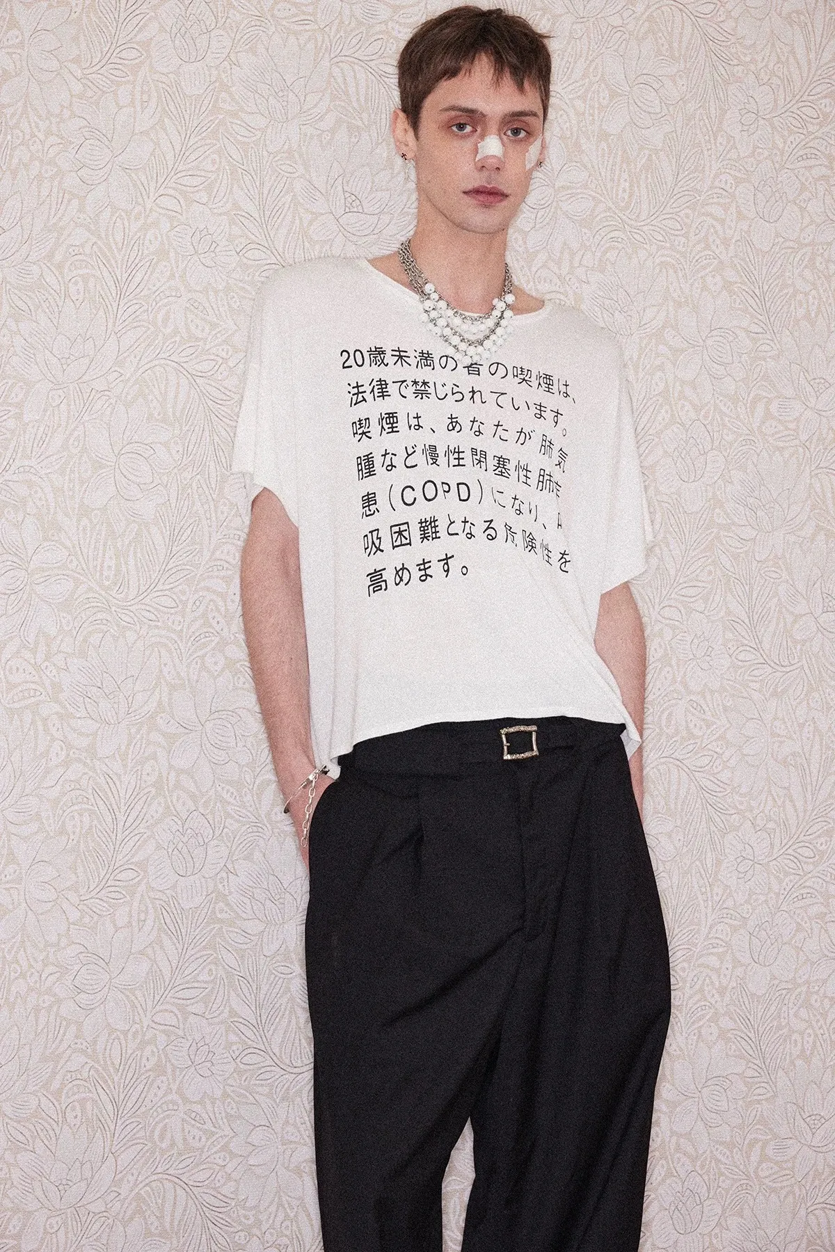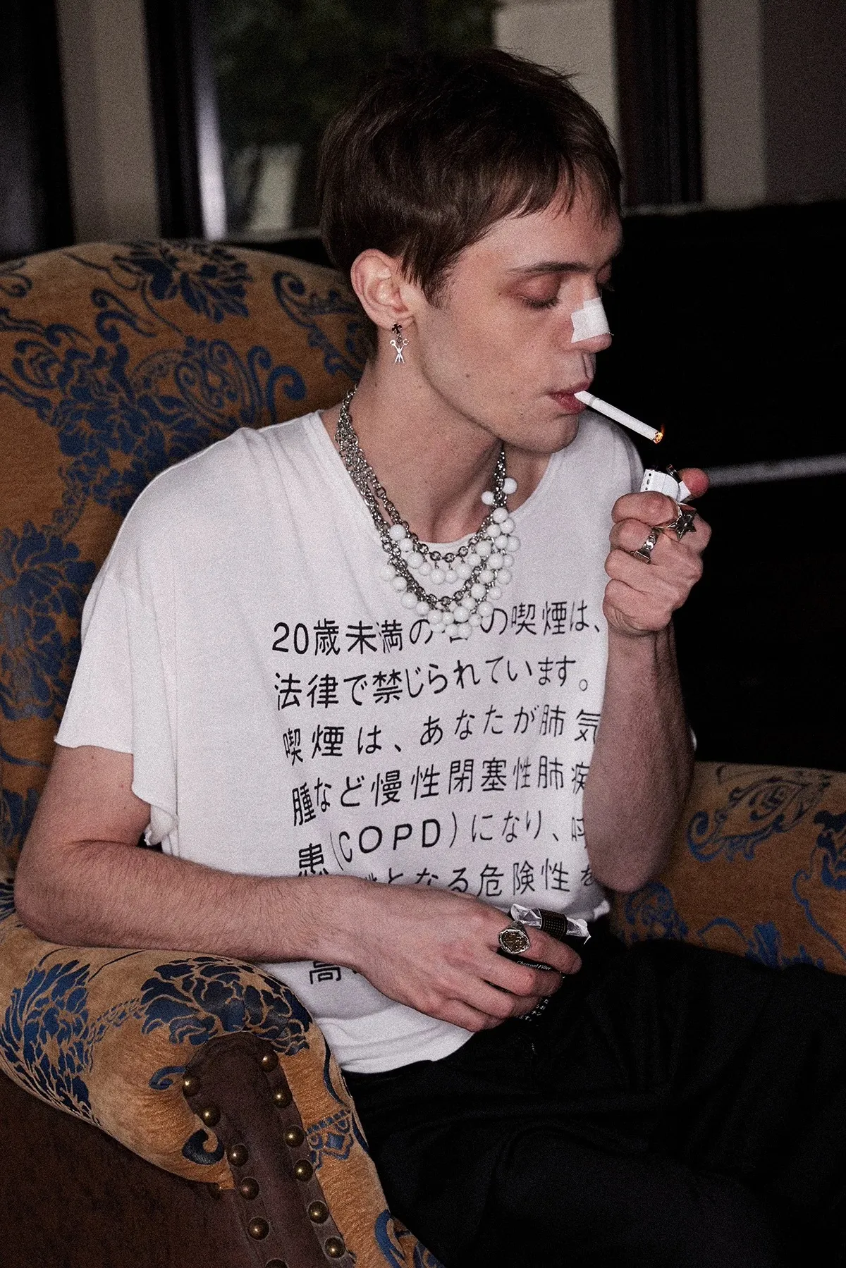 RICHILL 髒染破壞 插畫 煙頭扣帶 牛仔外套 牛仔褲 套裝(灰白)