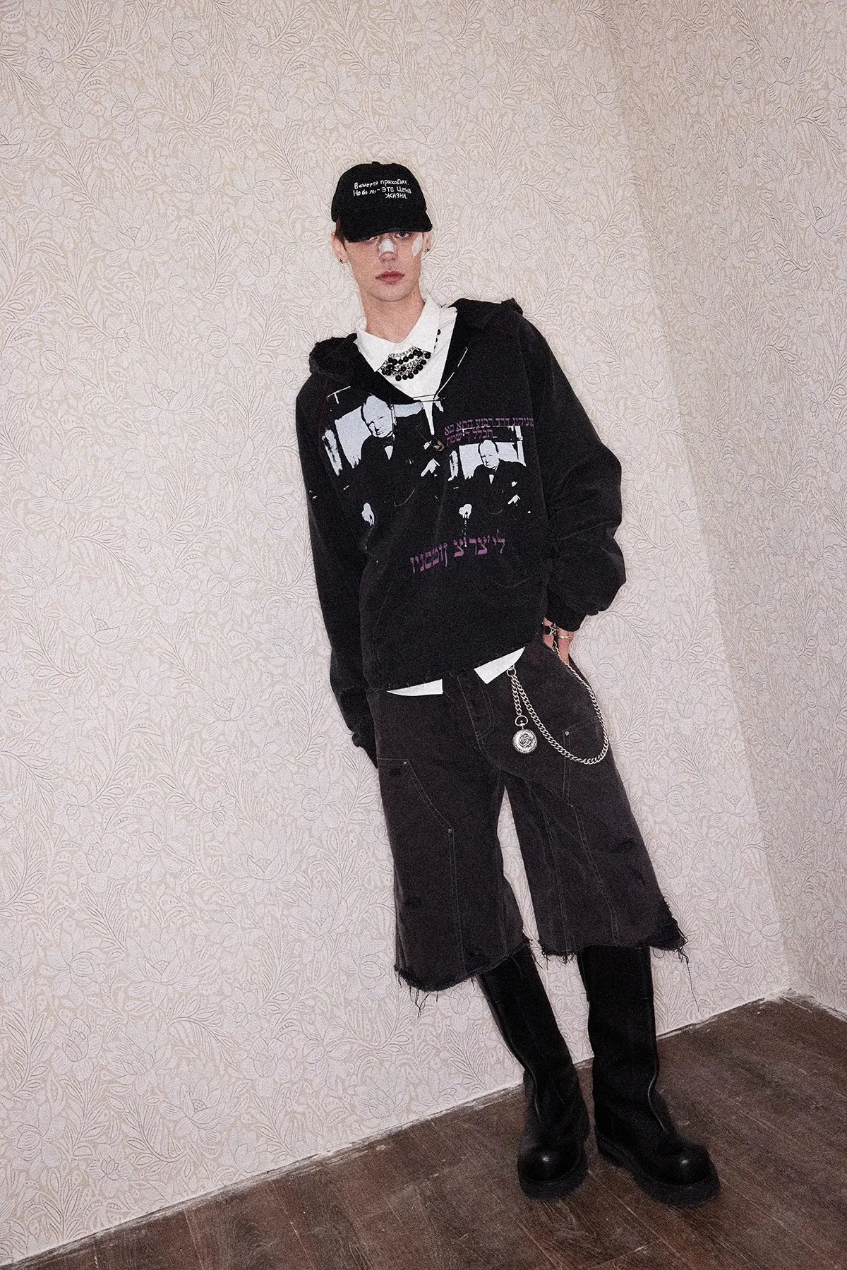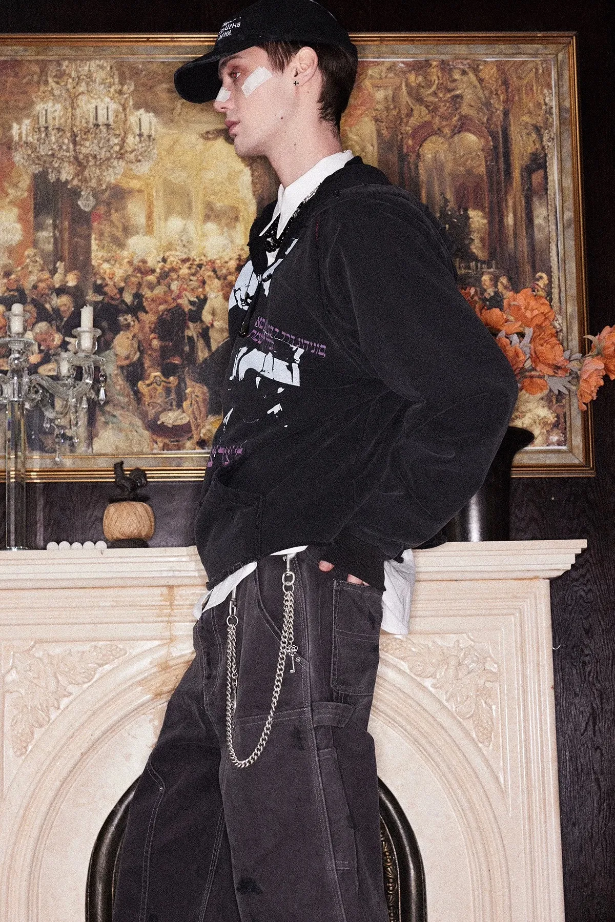 RICHILL 髒染破壞 插畫 煙頭扣帶 牛仔外套 牛仔褲 套裝(灰白)