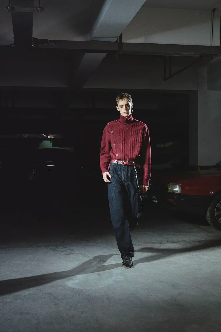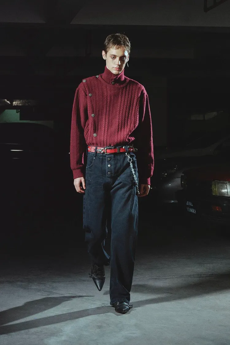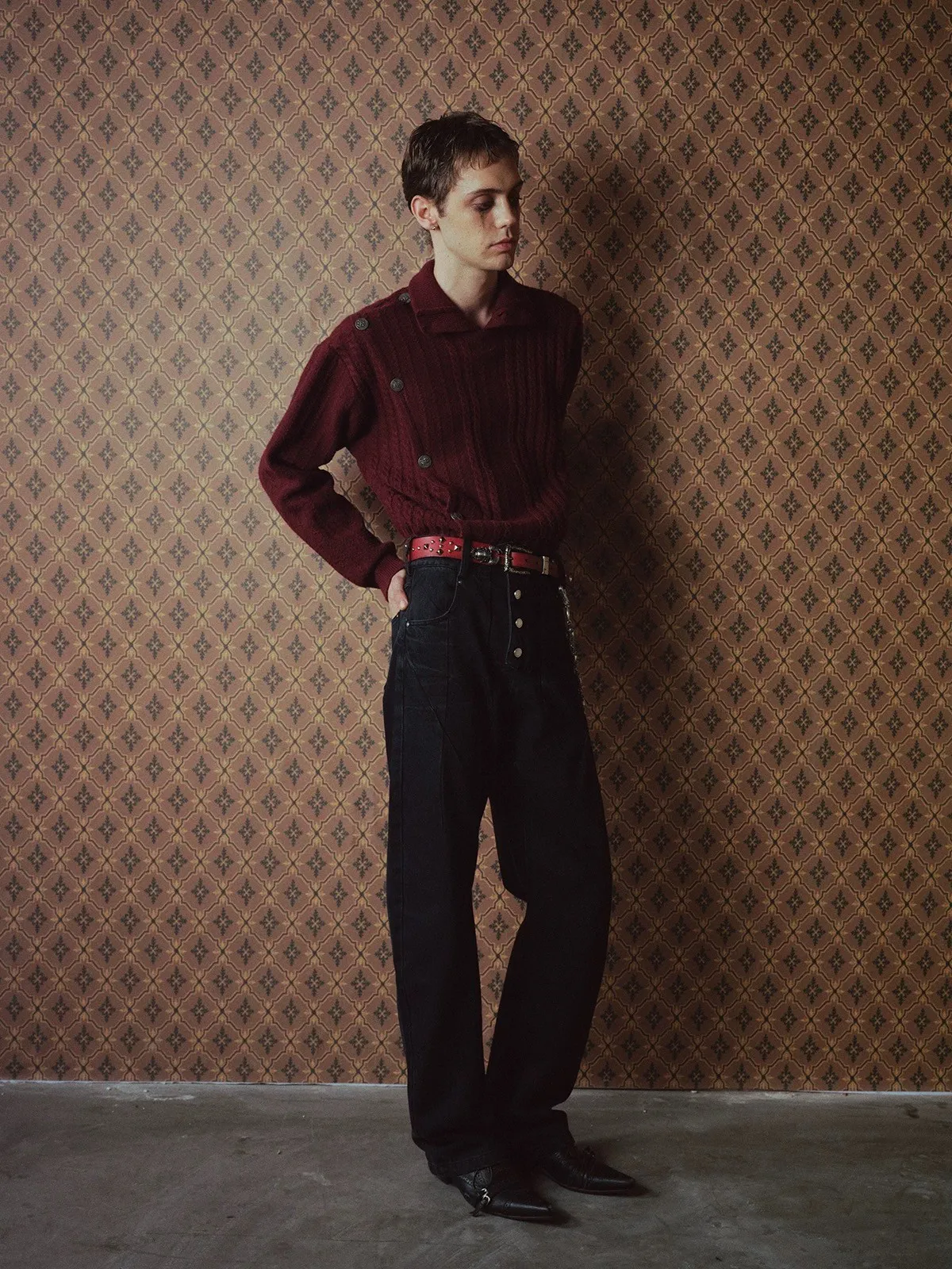 RICHILL 金屬釦斜開領 高領 毛衣(酒紅)