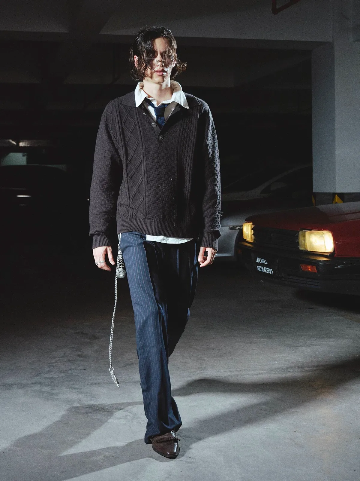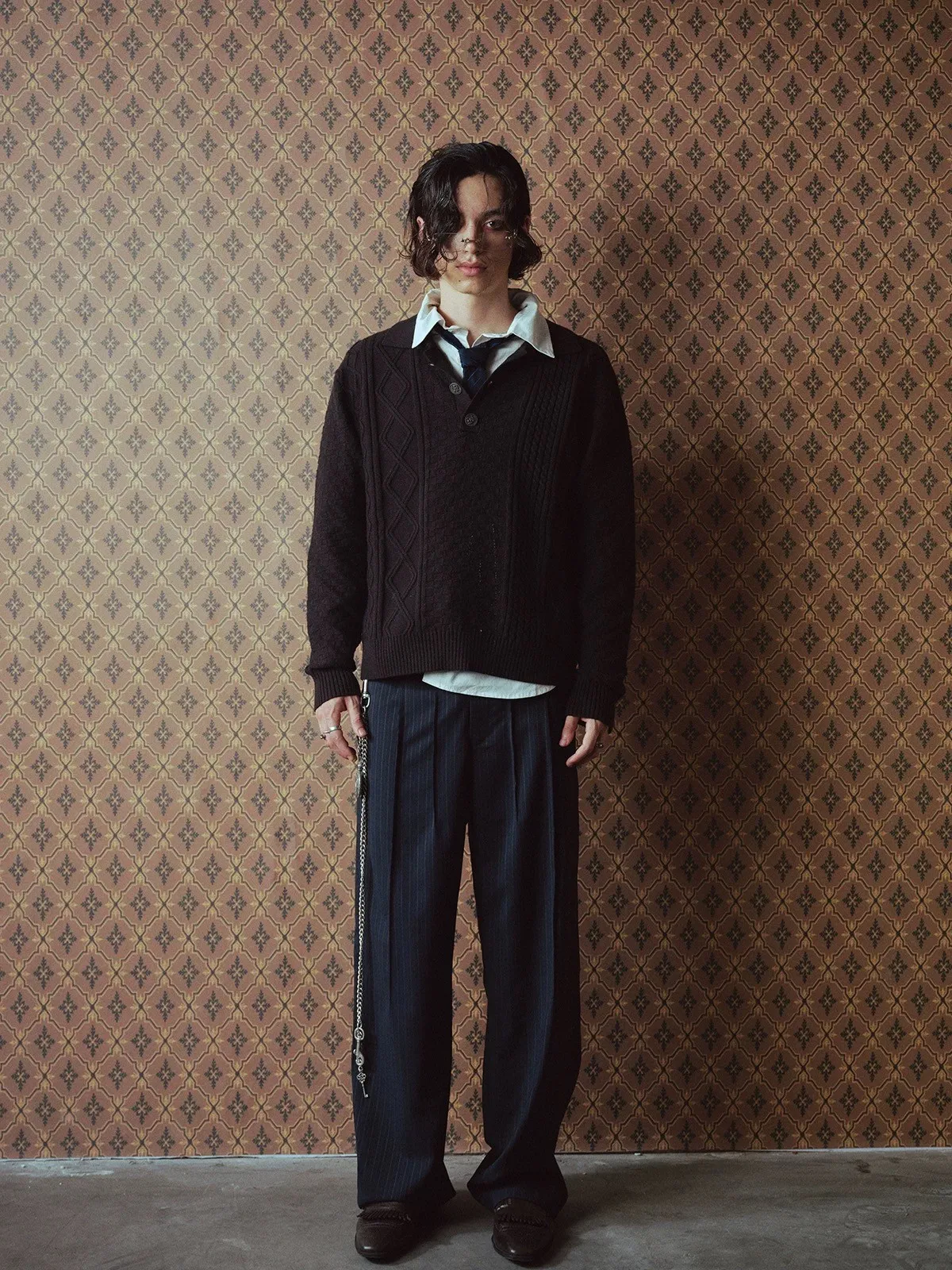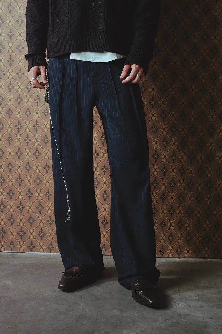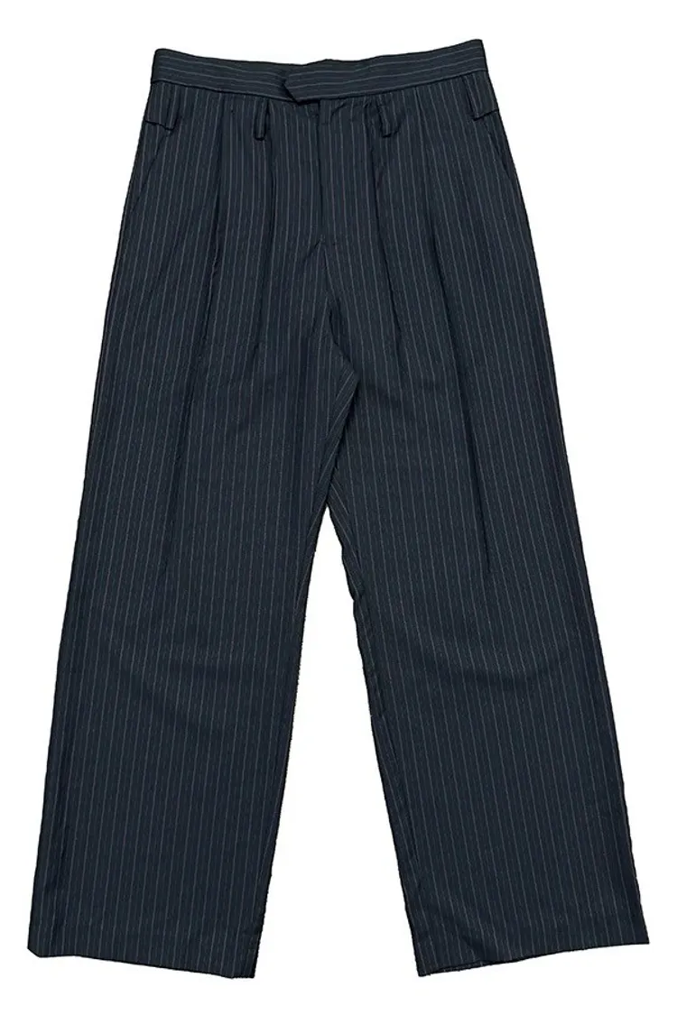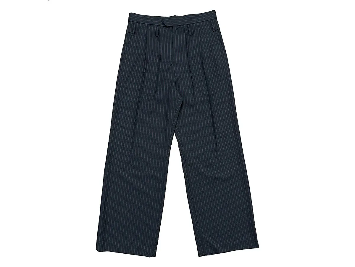 RICHILL錯位腰袢 日本羊毛 條紋 西裝褲(藏青)