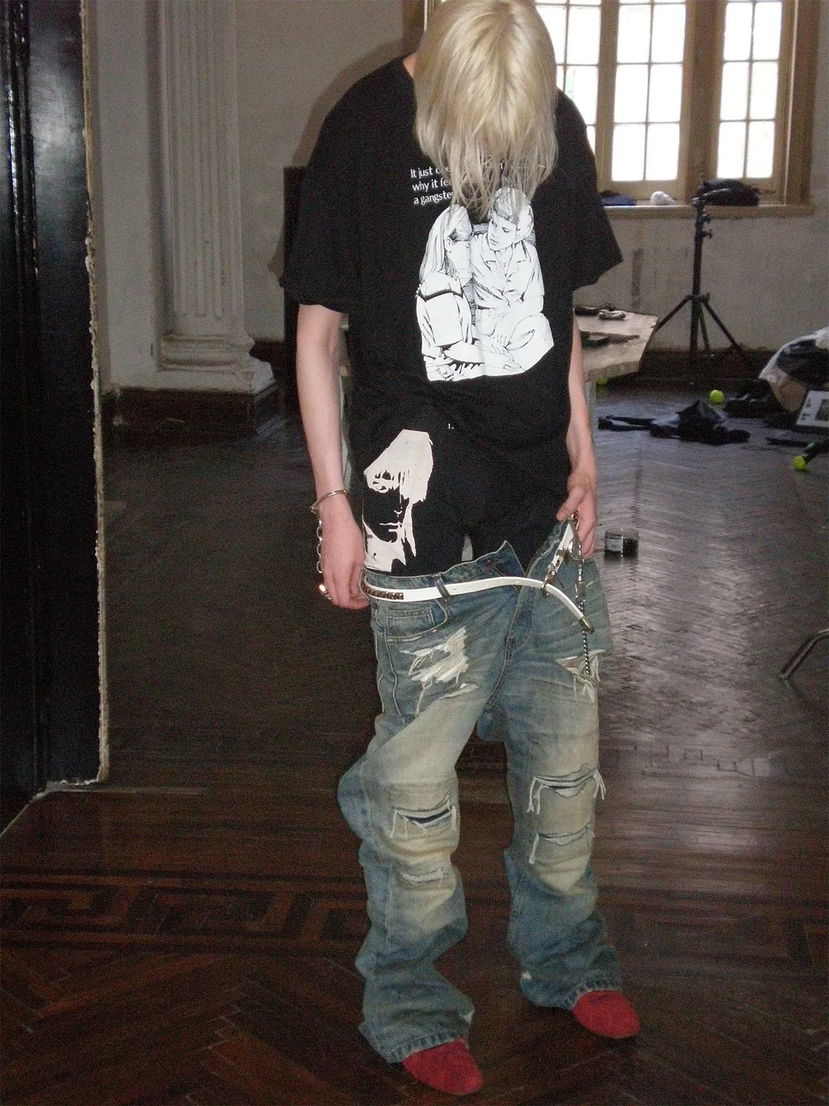 F4F 刷臘做舊 水洗 baggy jeans 牛仔褲(藍/灰)