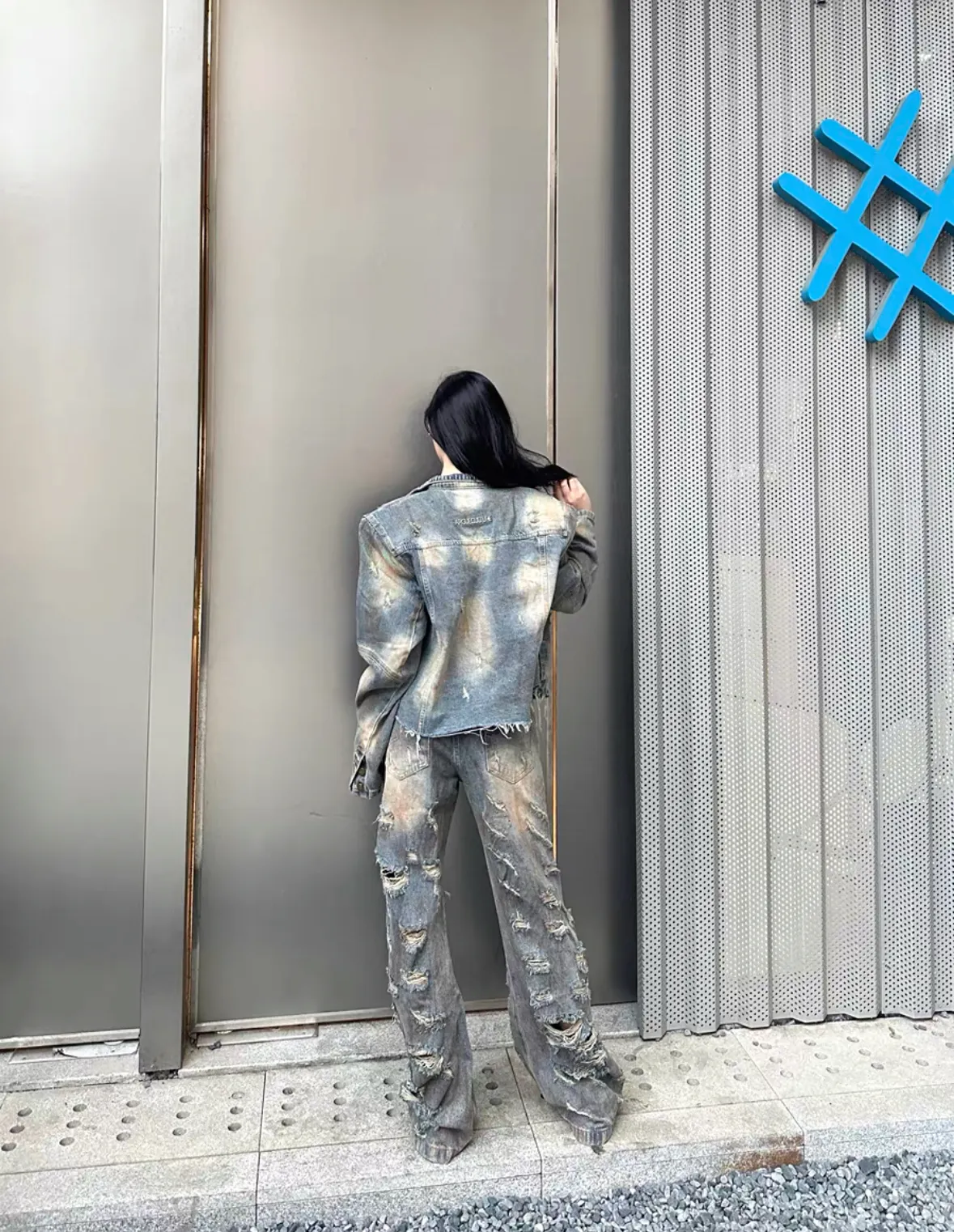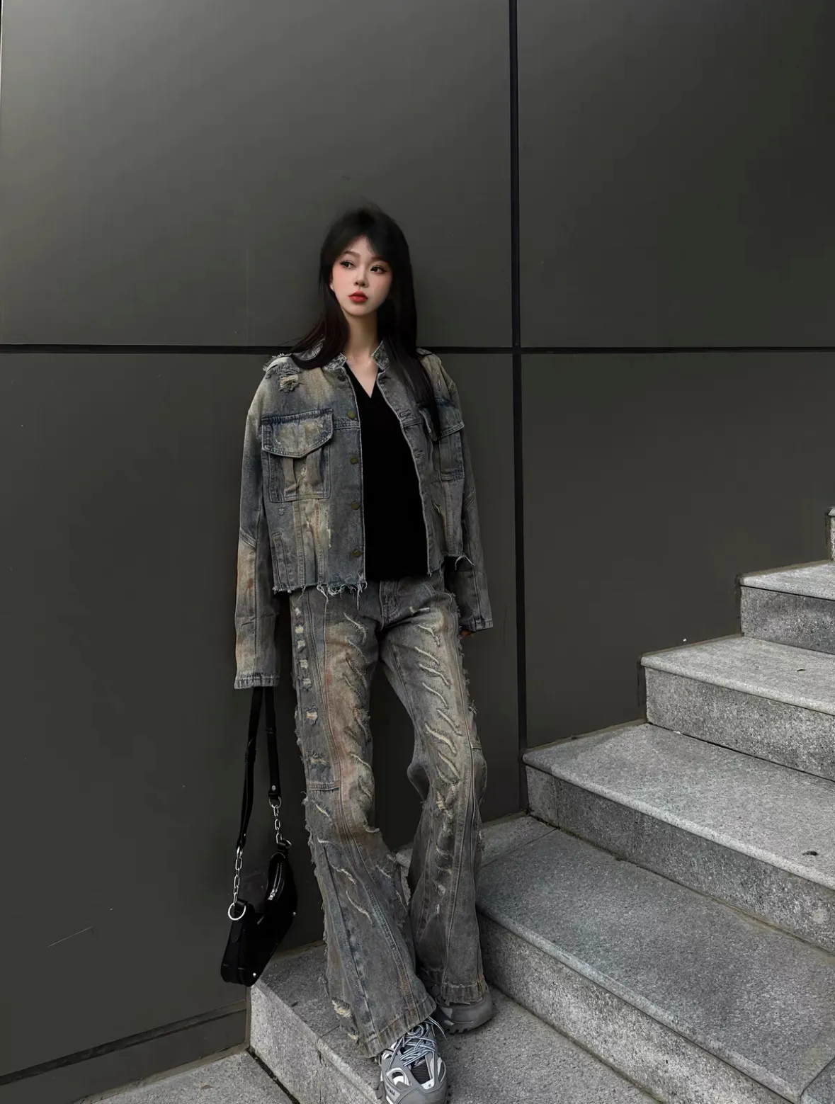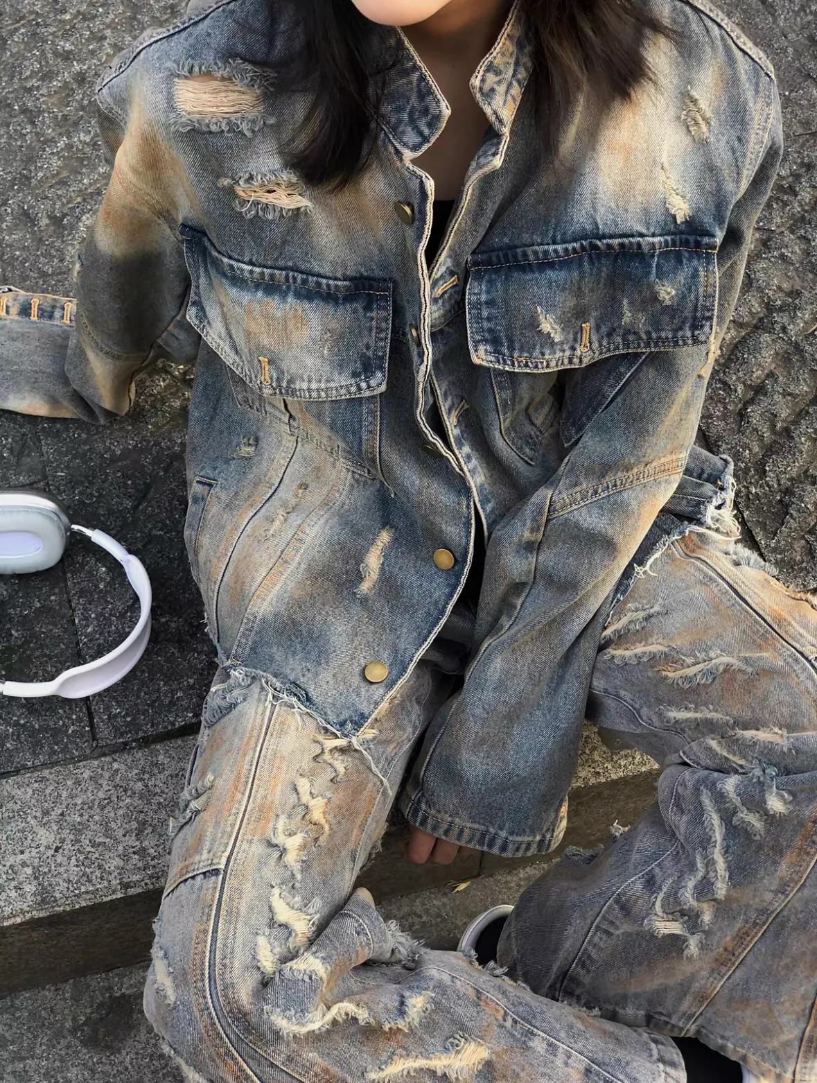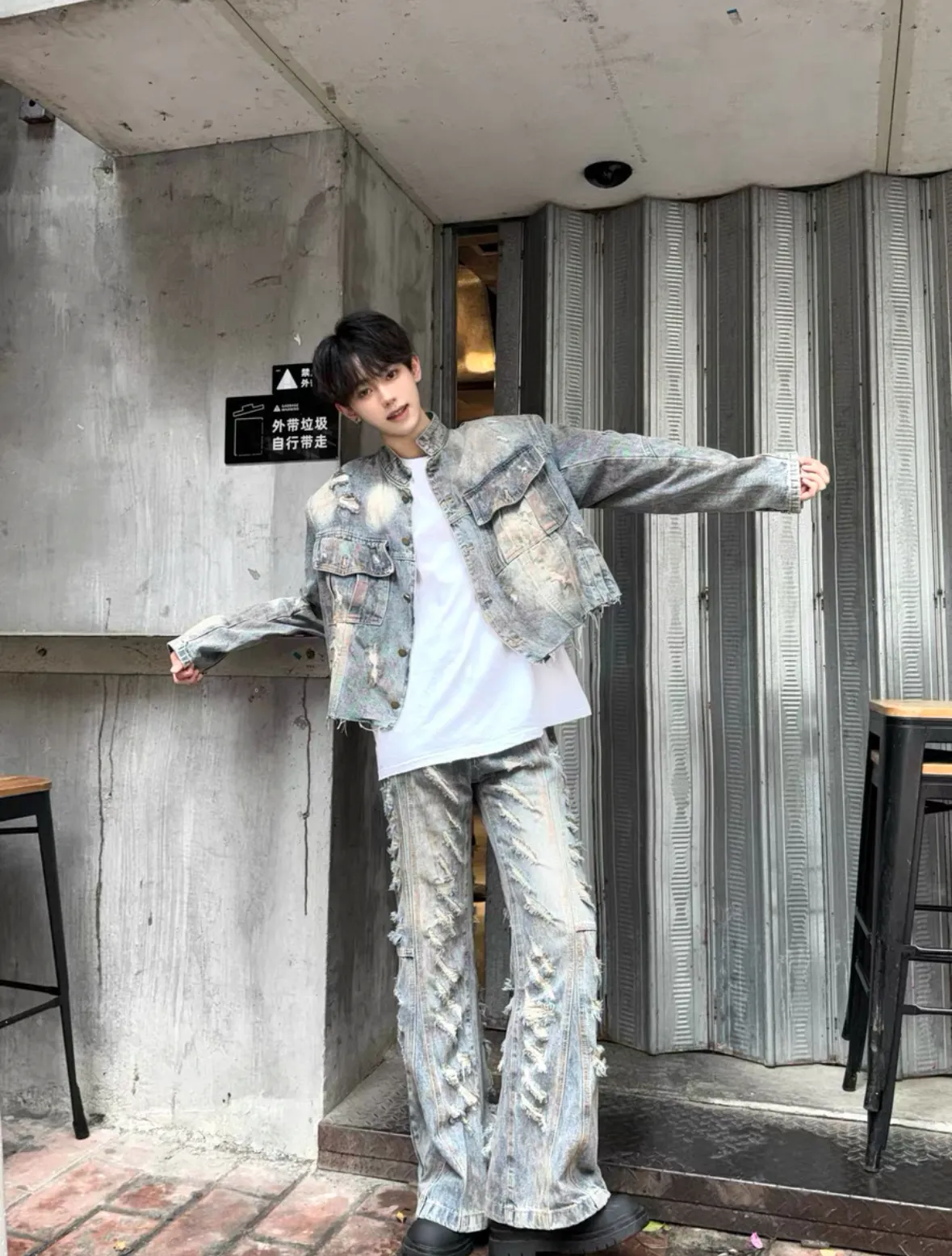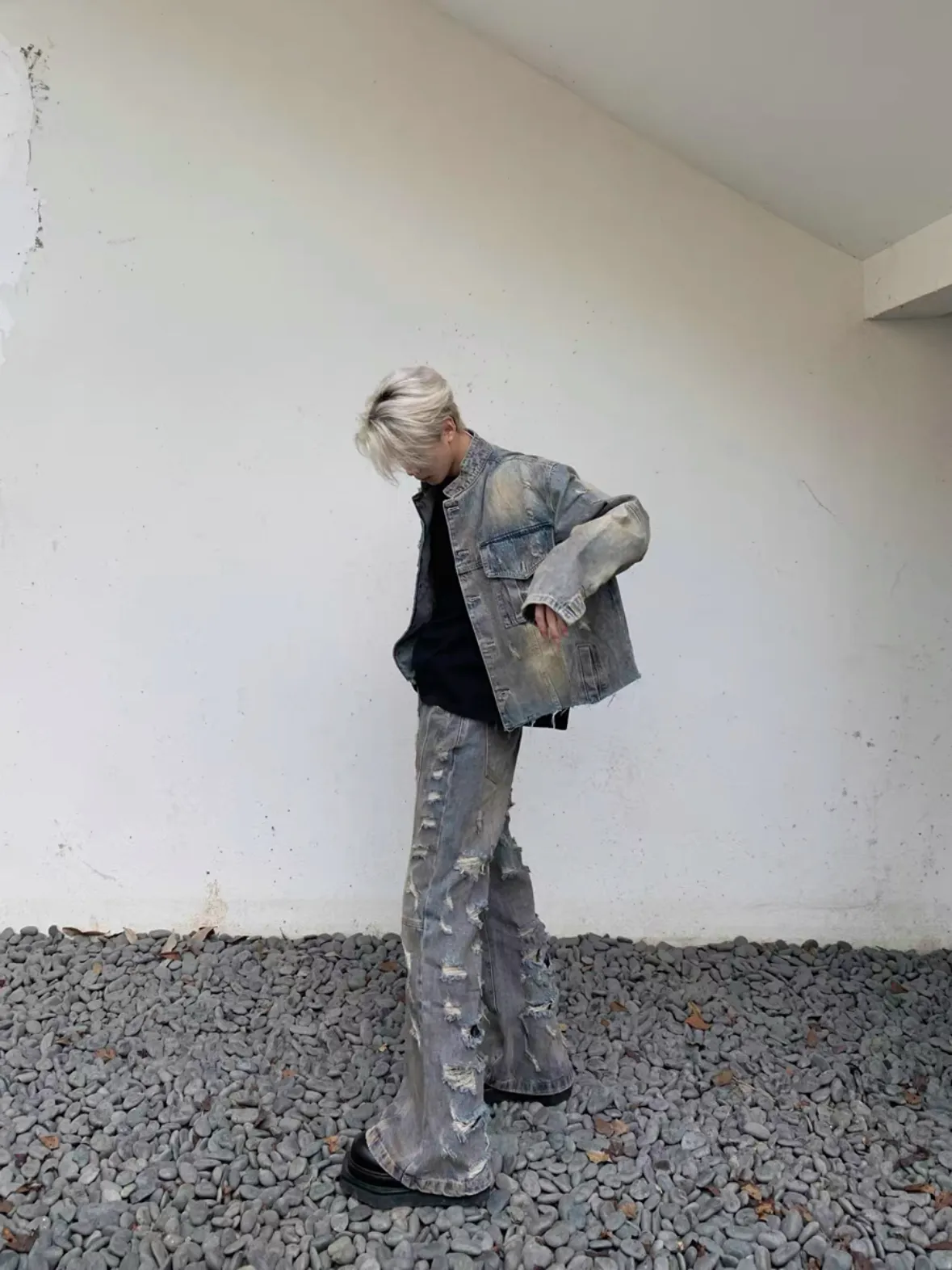 髒染破壞 重磅 設計感 牛仔外套 微喇叭 牛仔褲 牛仔套裝