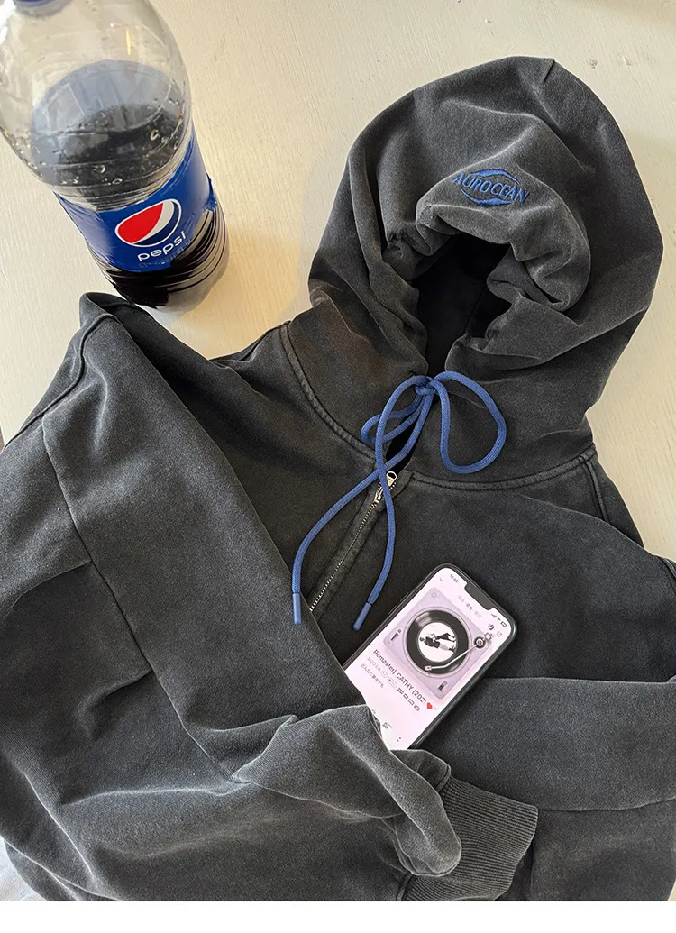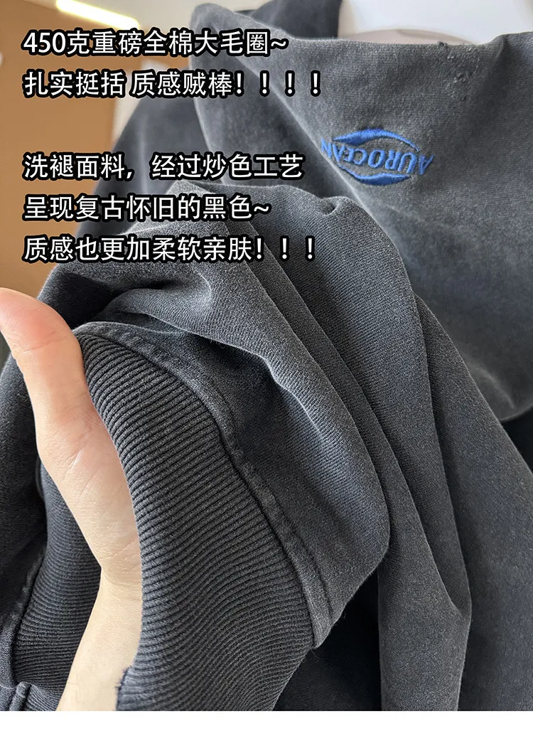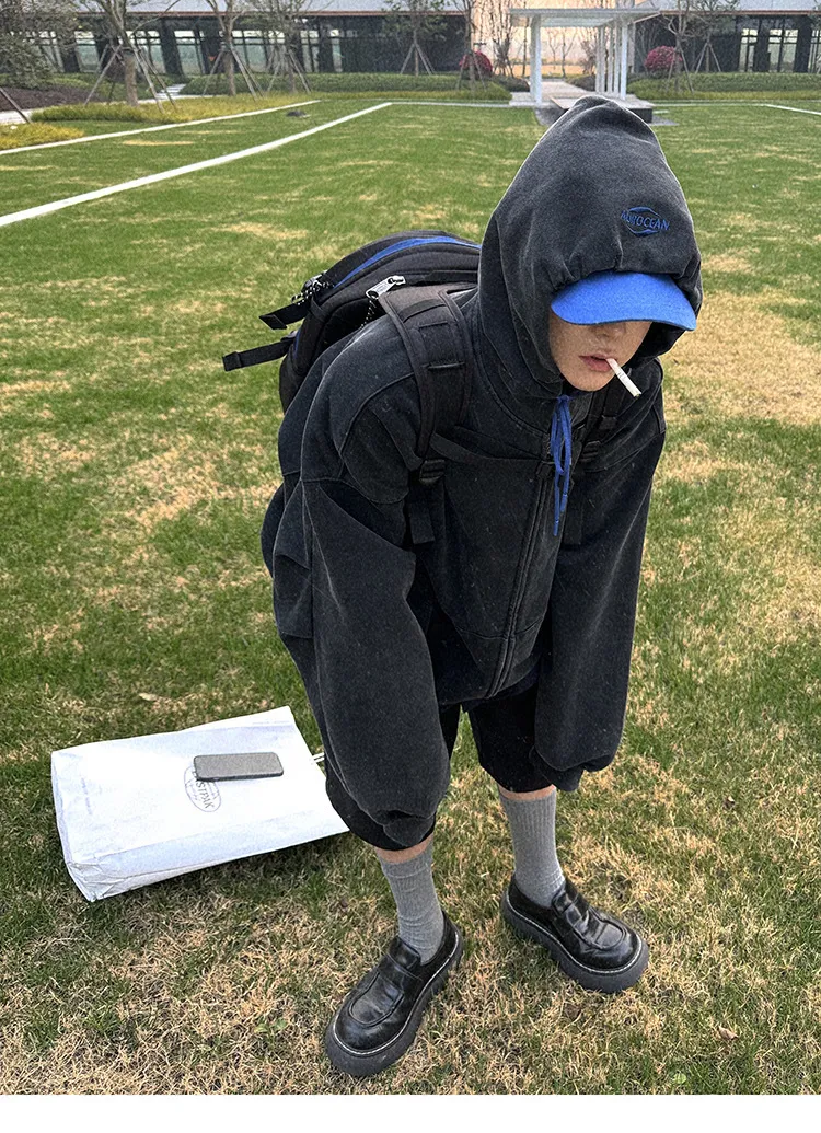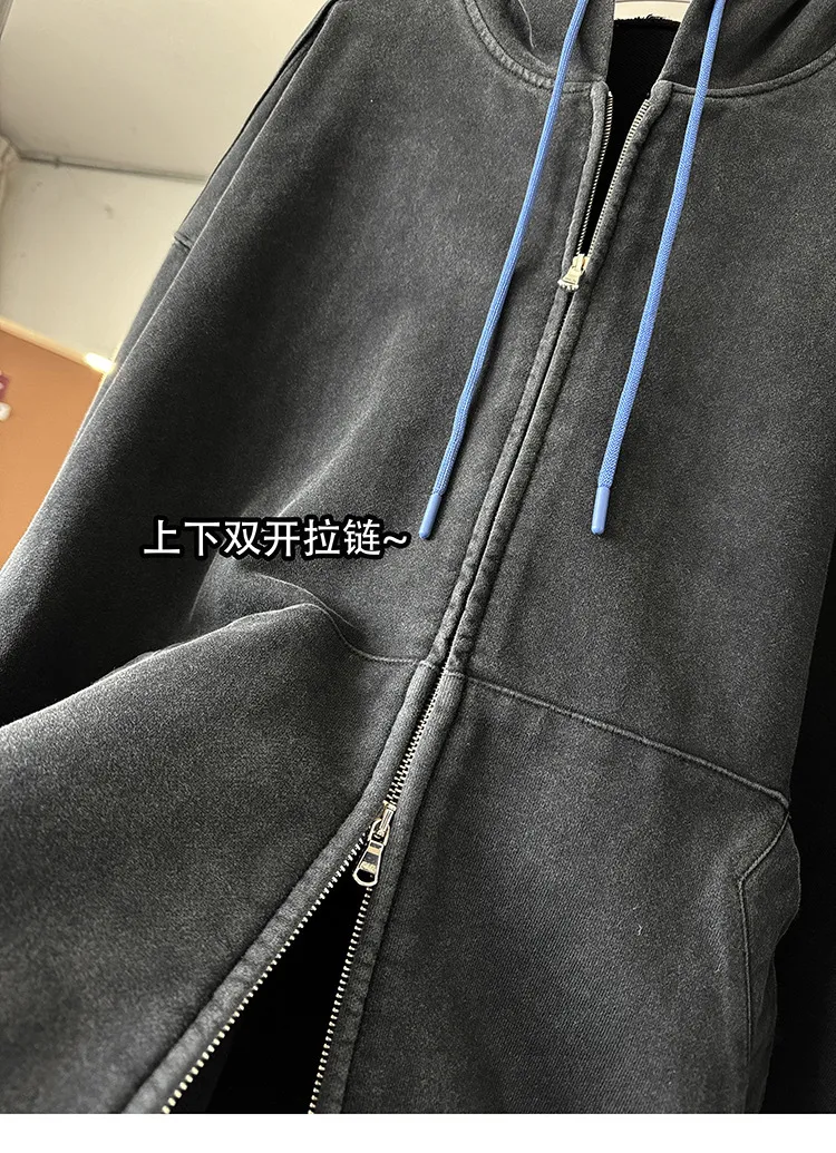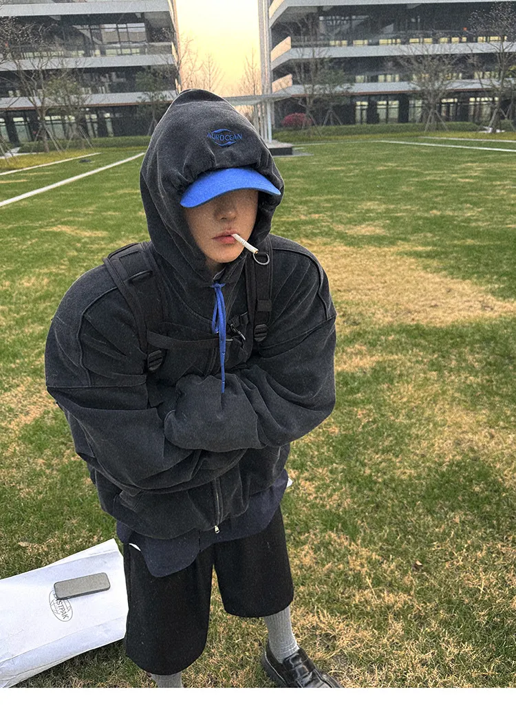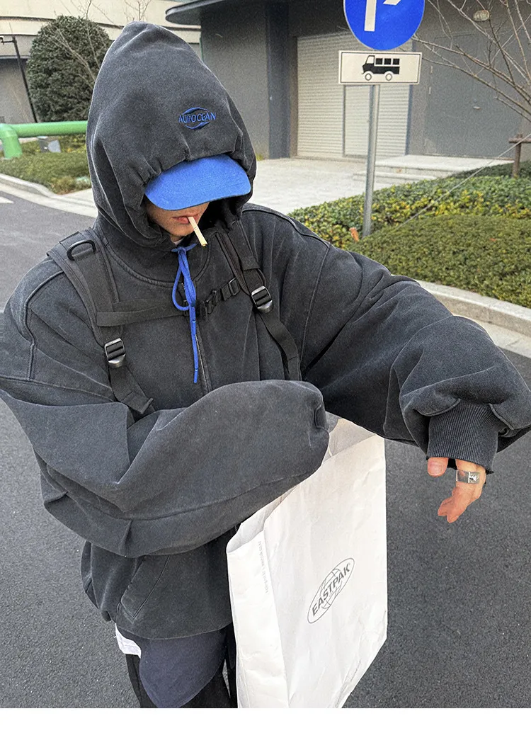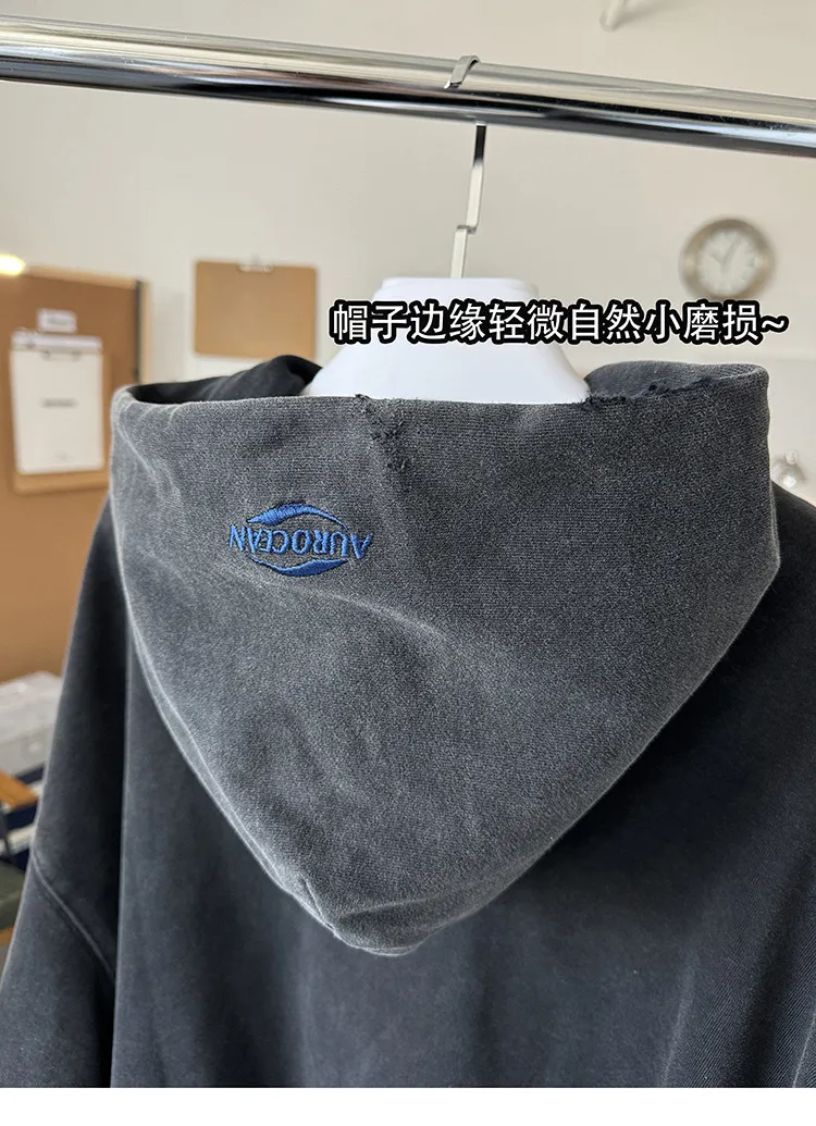AUROCEAN 450G重磅 做舊 OS 雙拉鍊 刺繡連帽 外套(黑色)
