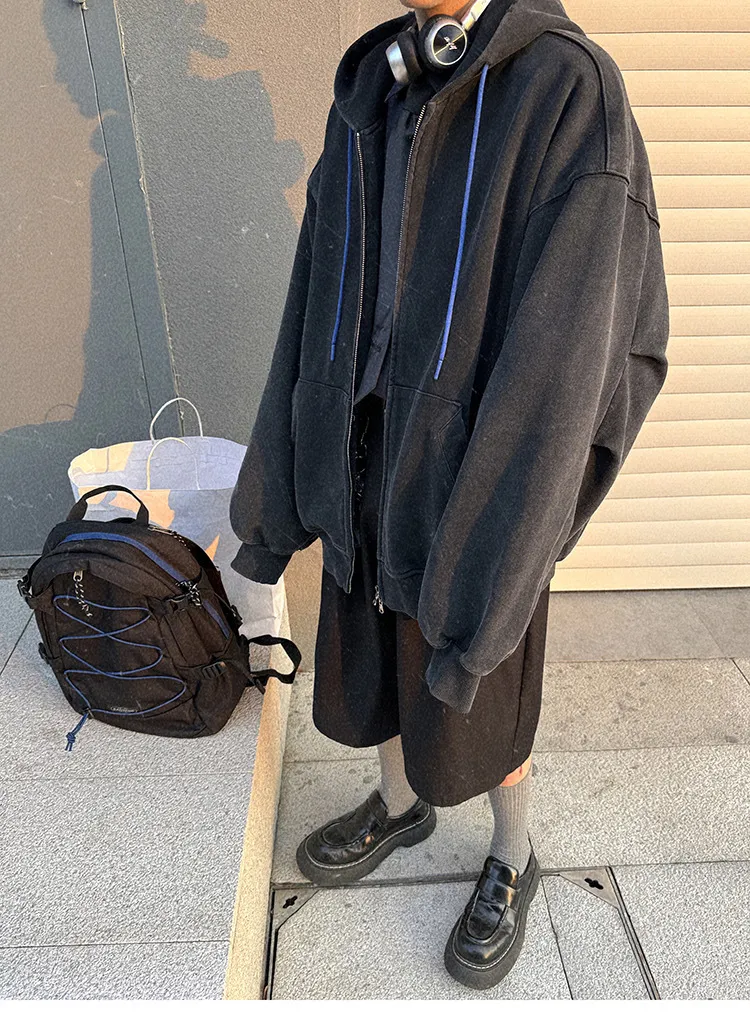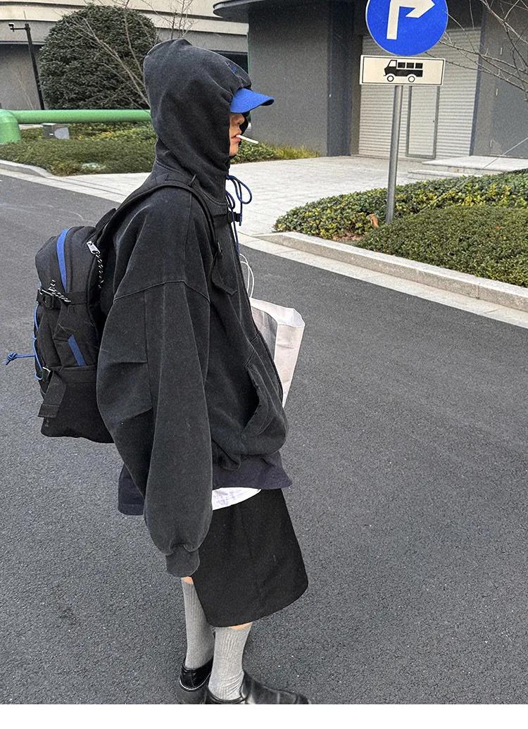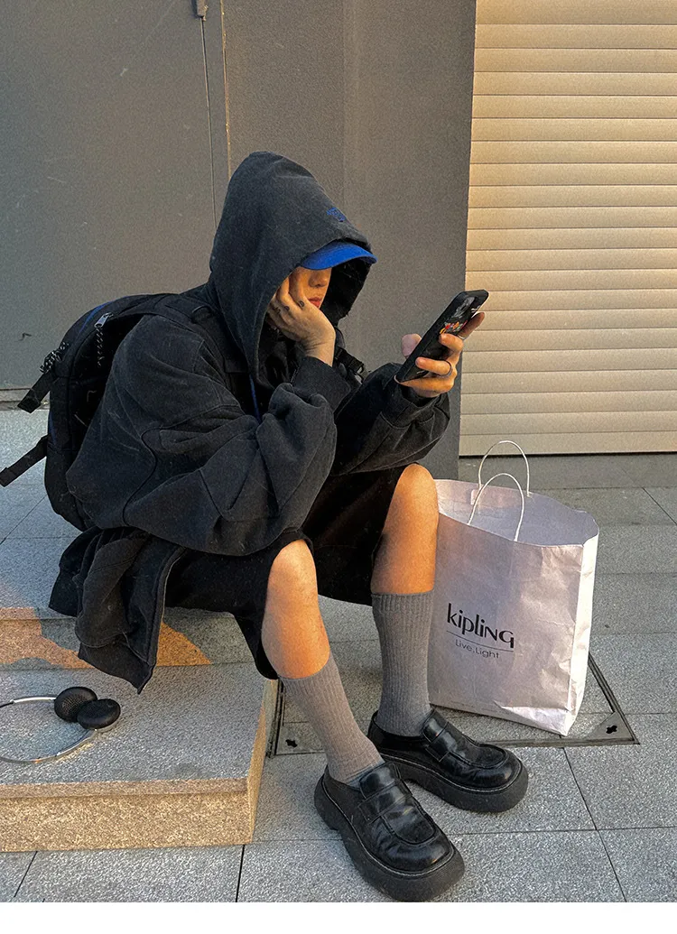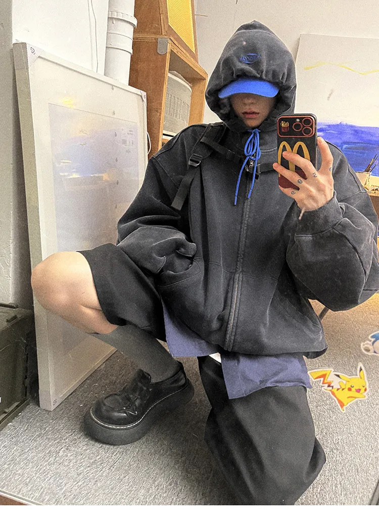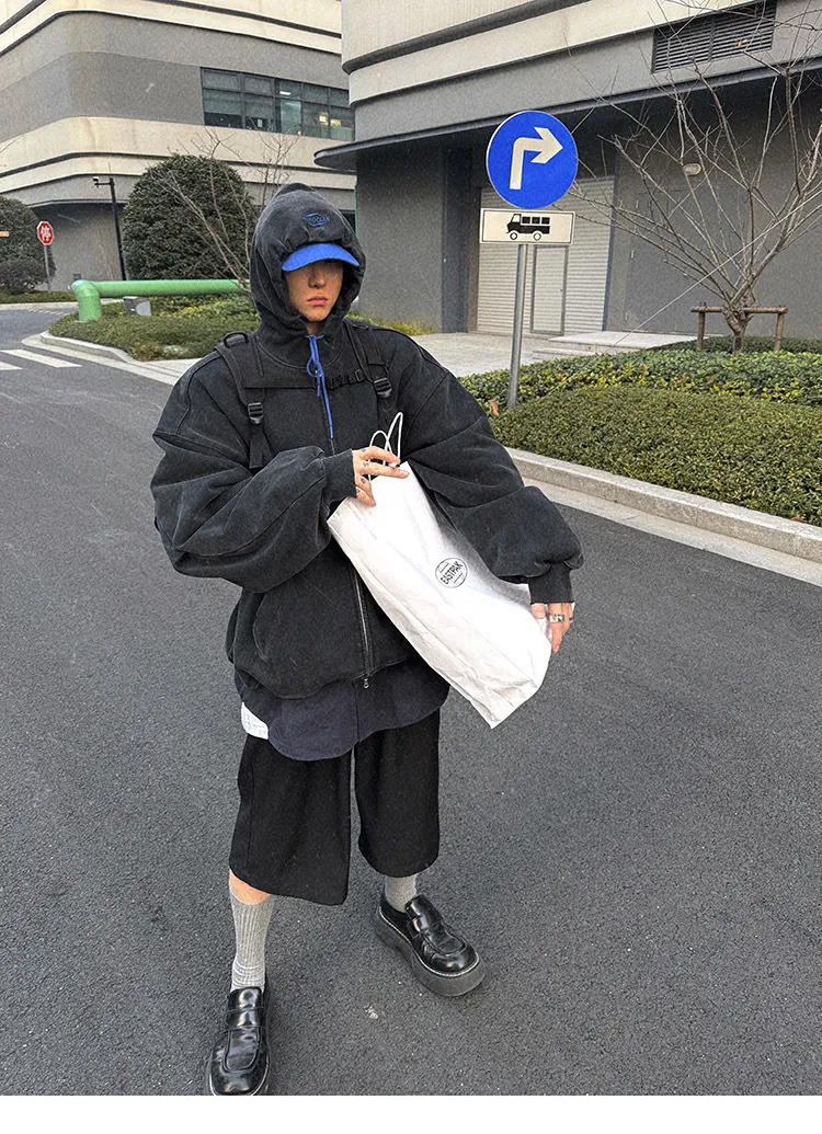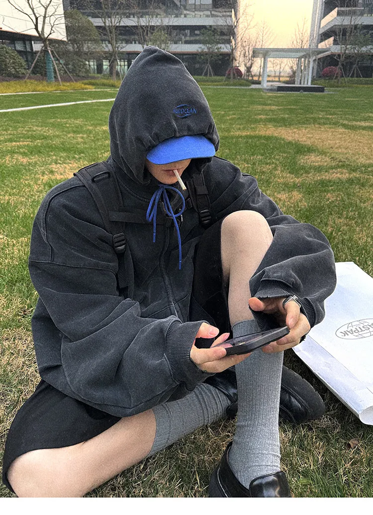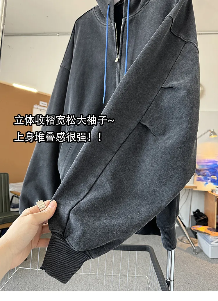 AUROCEAN 450G重磅 做舊 OS 雙拉鍊 刺繡連帽 外套(黑色)